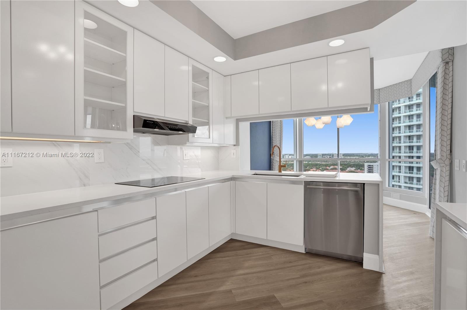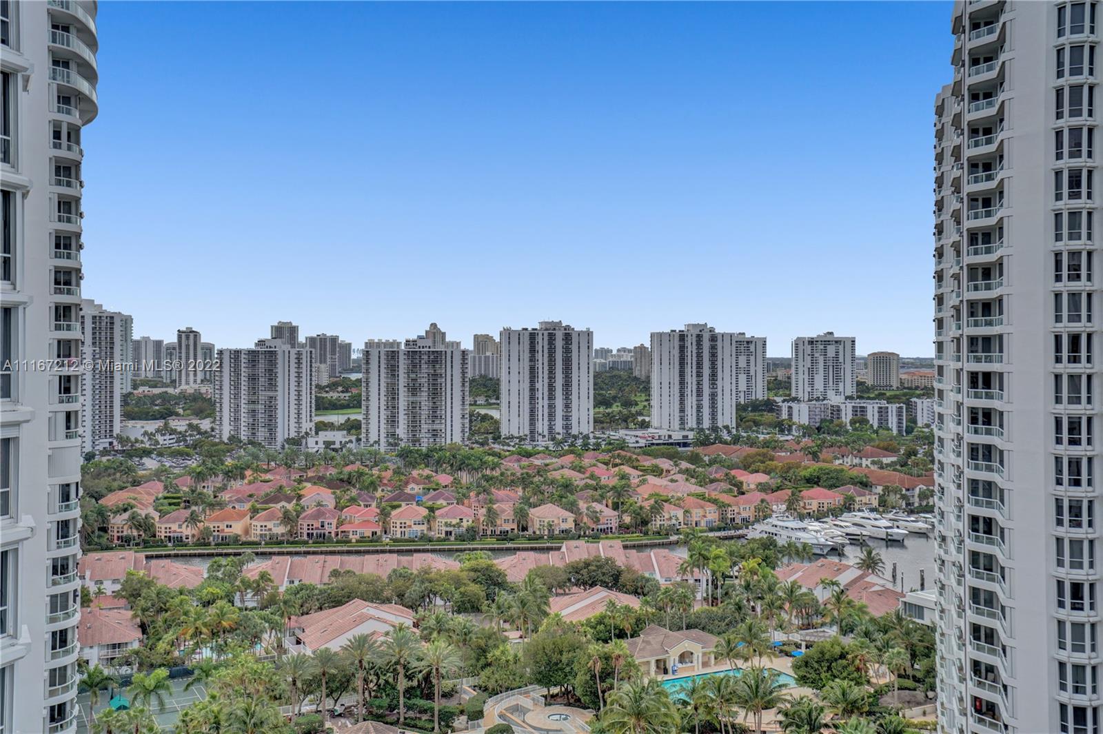 Bright and spacious corner unit in move-in condition. 2 bedrooms, 2.5 baths. A third bedroom can be easily added. The guest bathroom has been converted into an office and can be made a bathroom back. Panoramic views. Vinyl floors throughout. Motorized shades. Beautiful lighting fixtures. Open kitchen with breakfast area facing the marina of the Waterways. New cooktop, disposal, hood, dishwasher and sink with sensor. Pullout pantry. Spacious master bedroom, walk in closets. 2 parking spaces. Interior new doors. Contemporary lobby has just been renovated by Steven G. Resort lifestyle: 3 pools, tennis courts, spa, fitness center and clubhouse. Outdoor café, BBQ area & kids' playground. Walking distance to restaurants and shops. Call/text listing agent. Special assessments paid in full
