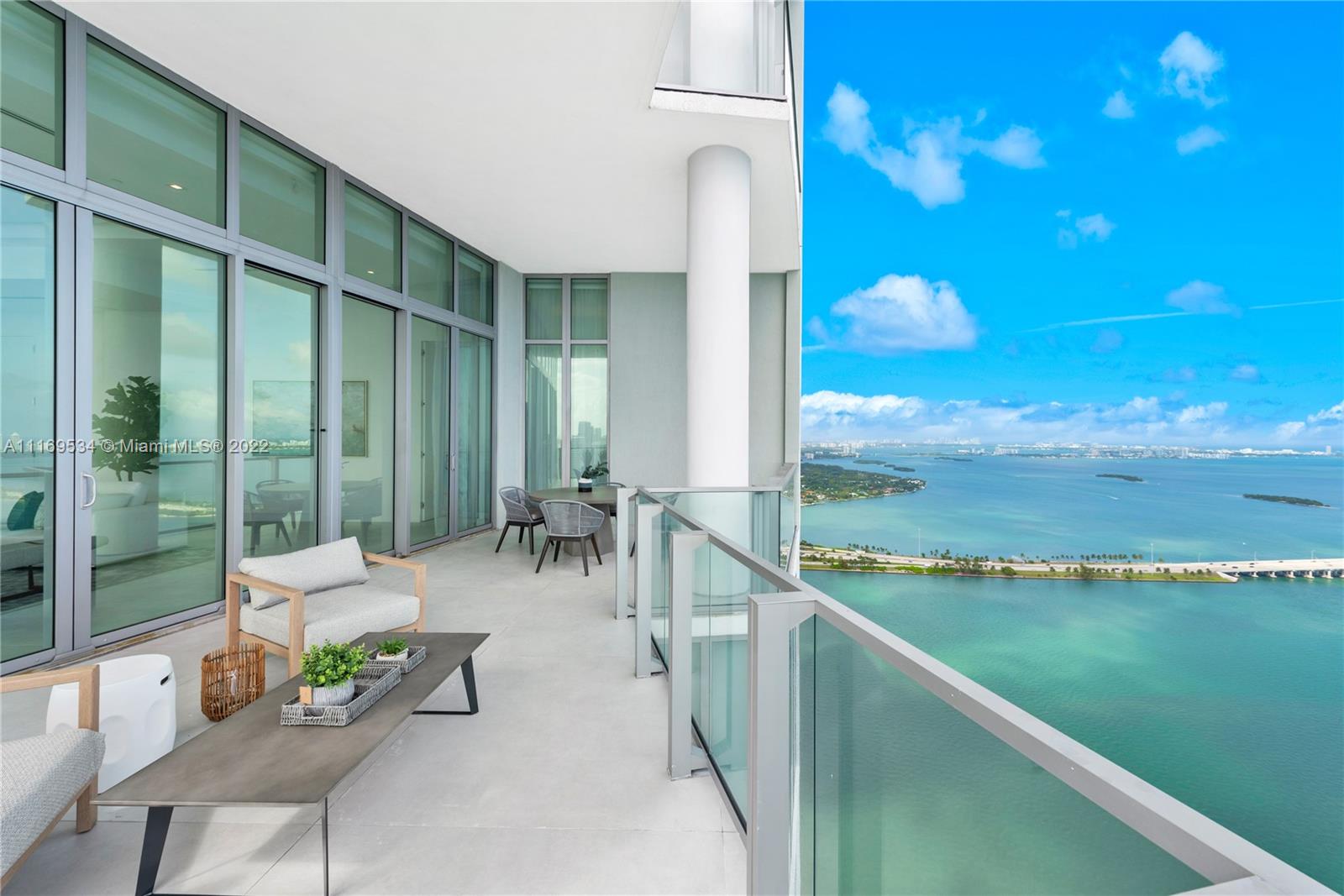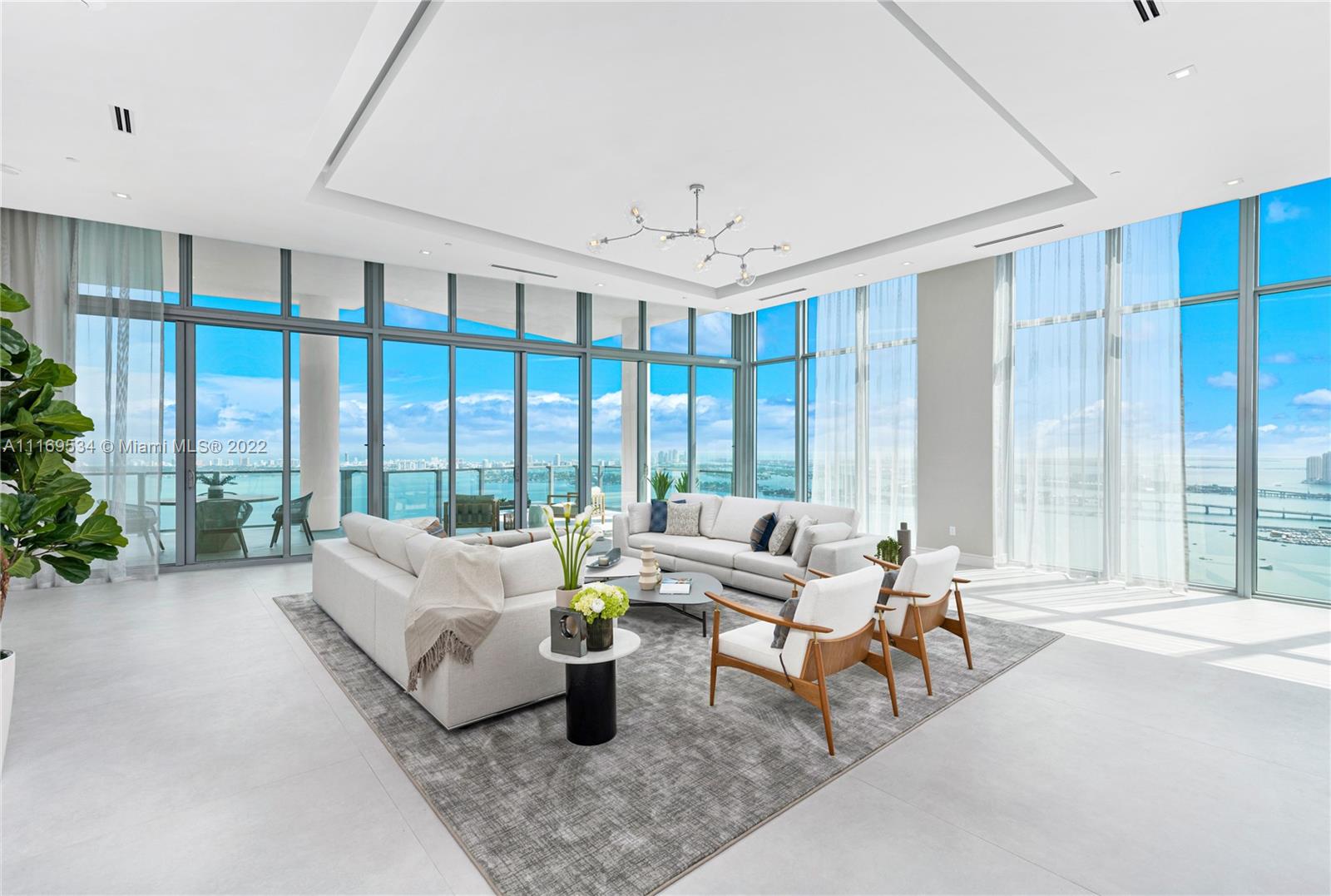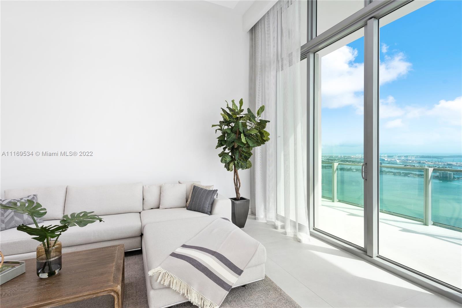 Enter this one-of-a-kind lower penthouse and be prepared to be awestruck. Enjoy wraparound views of Biscayne Bay and Miami Beach from soaring 15-ft floor-to-ceiling windows that welcome natural light throughout the entire penthouse. Special features include 60” x 60” tile, custom ceiling lighting plan, massive master bedroom with in-suite lounge, 4 guest suites + 1 staff room, a west-facing den, outdoor summer kitchen and 4 parking spaces. Located in the heart of all that is trending in Miami within a 5-10 minute drive to Design District, Wynwood, Downtown, Brickell and South Beach.