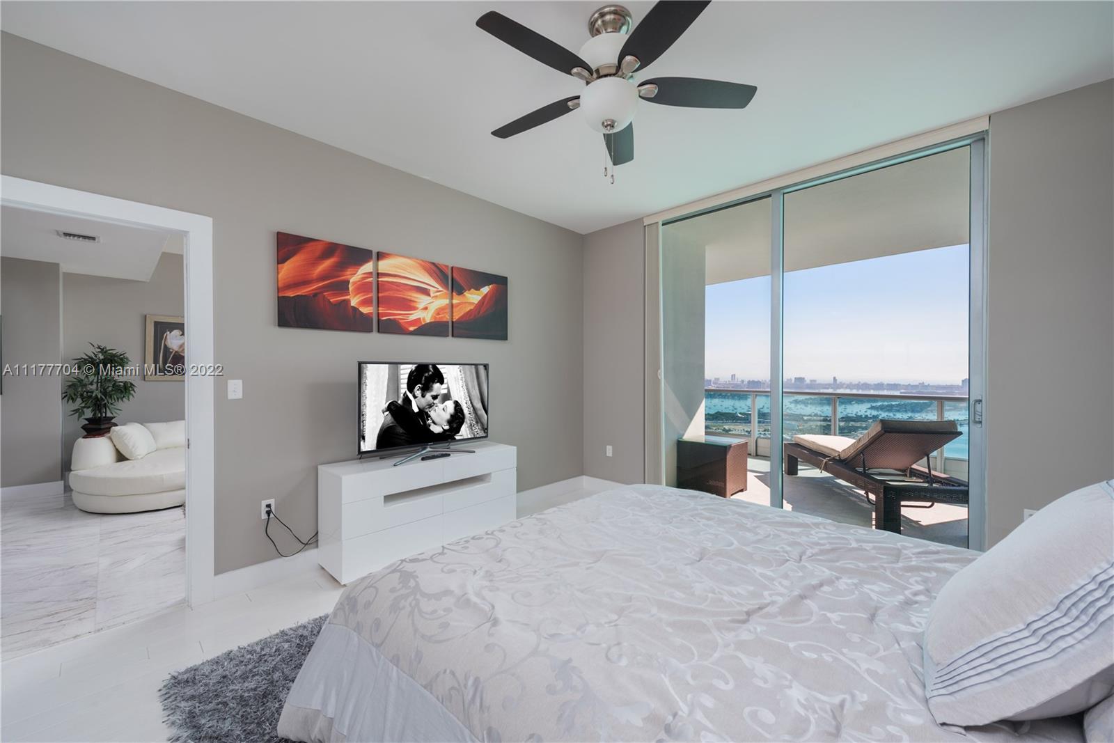 Priced to sell! Amazing flow-thru views, endless water views from the Bay to the Ocean in this Designer furnished ready 3/3 convertible palace in the Sky. Gourmet kitchen, marble Carrera and wood flooring, open layout and so much more. Private elevator access and foyer/entrance, balconies from every room that give beautiful East/West views and overlook the arena. Fabulous Miami location!!