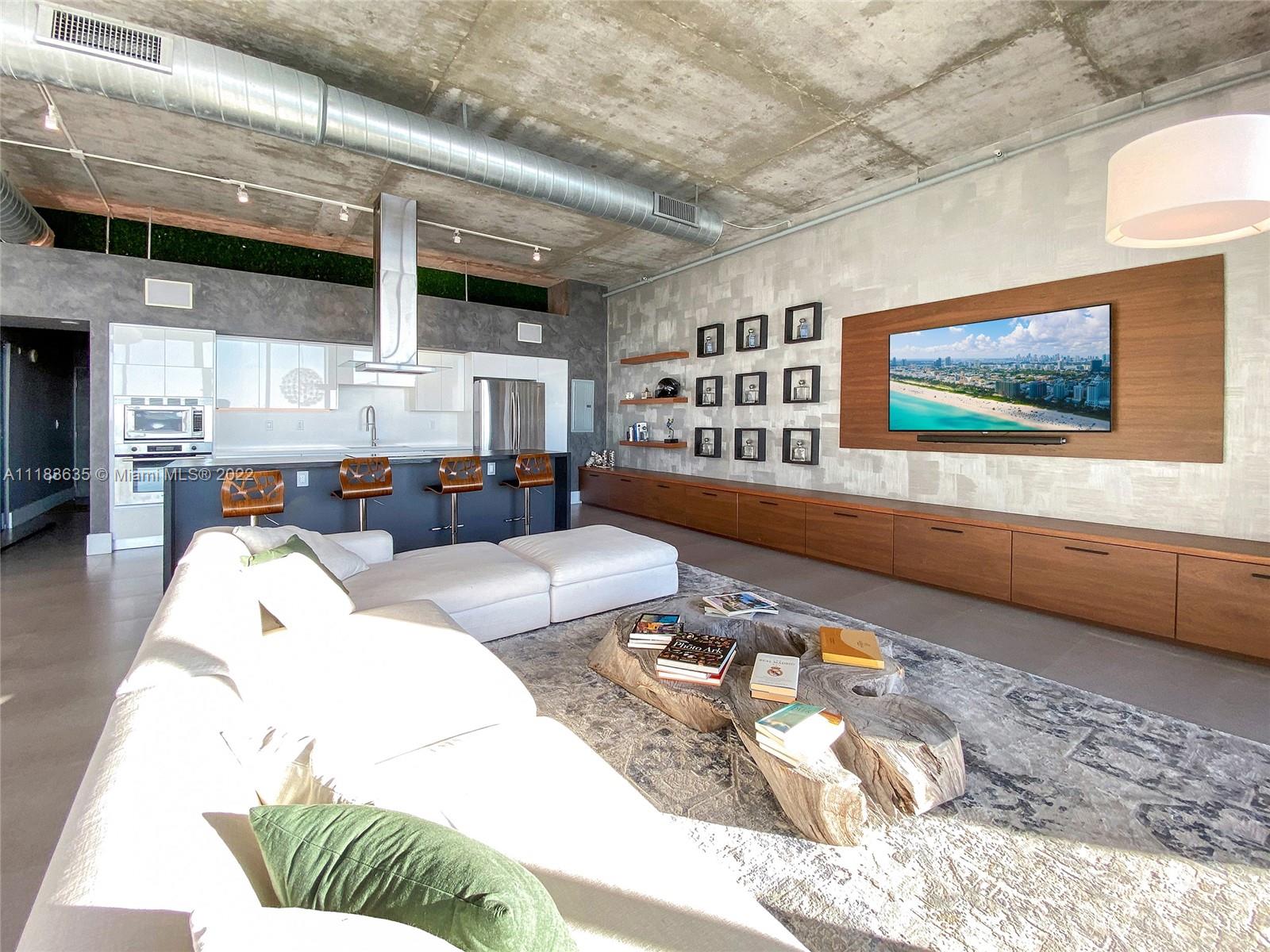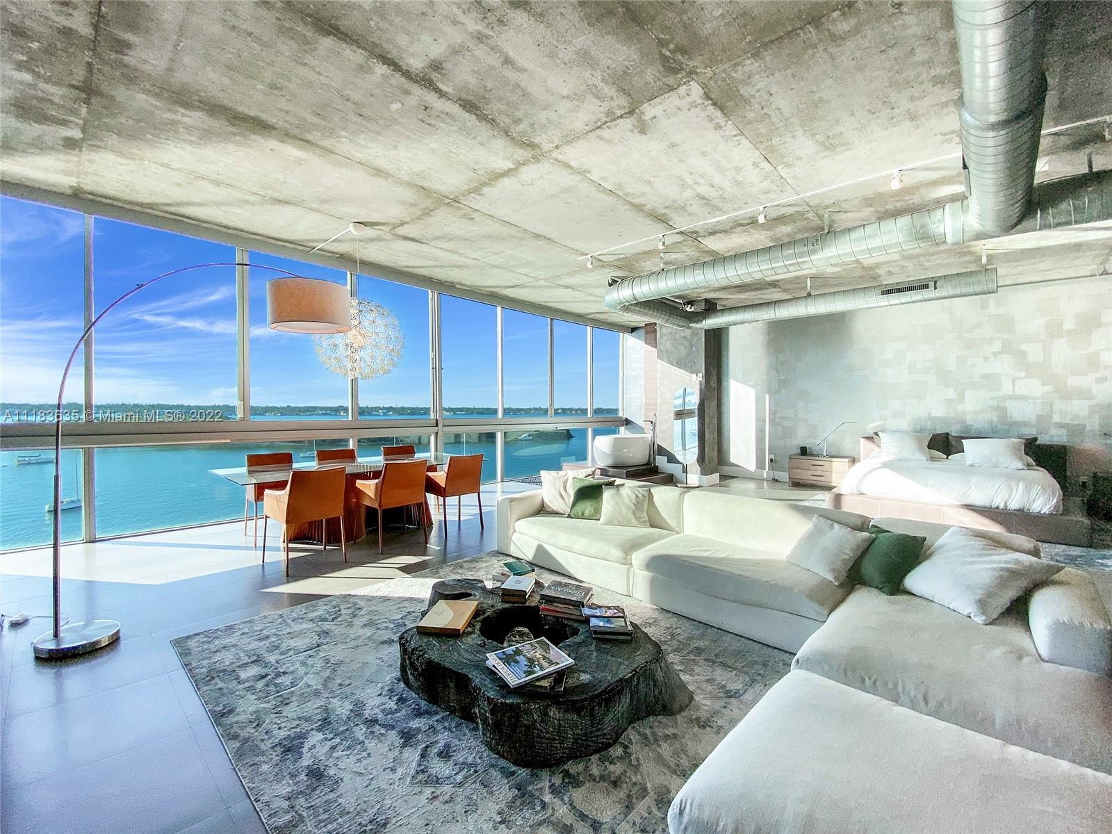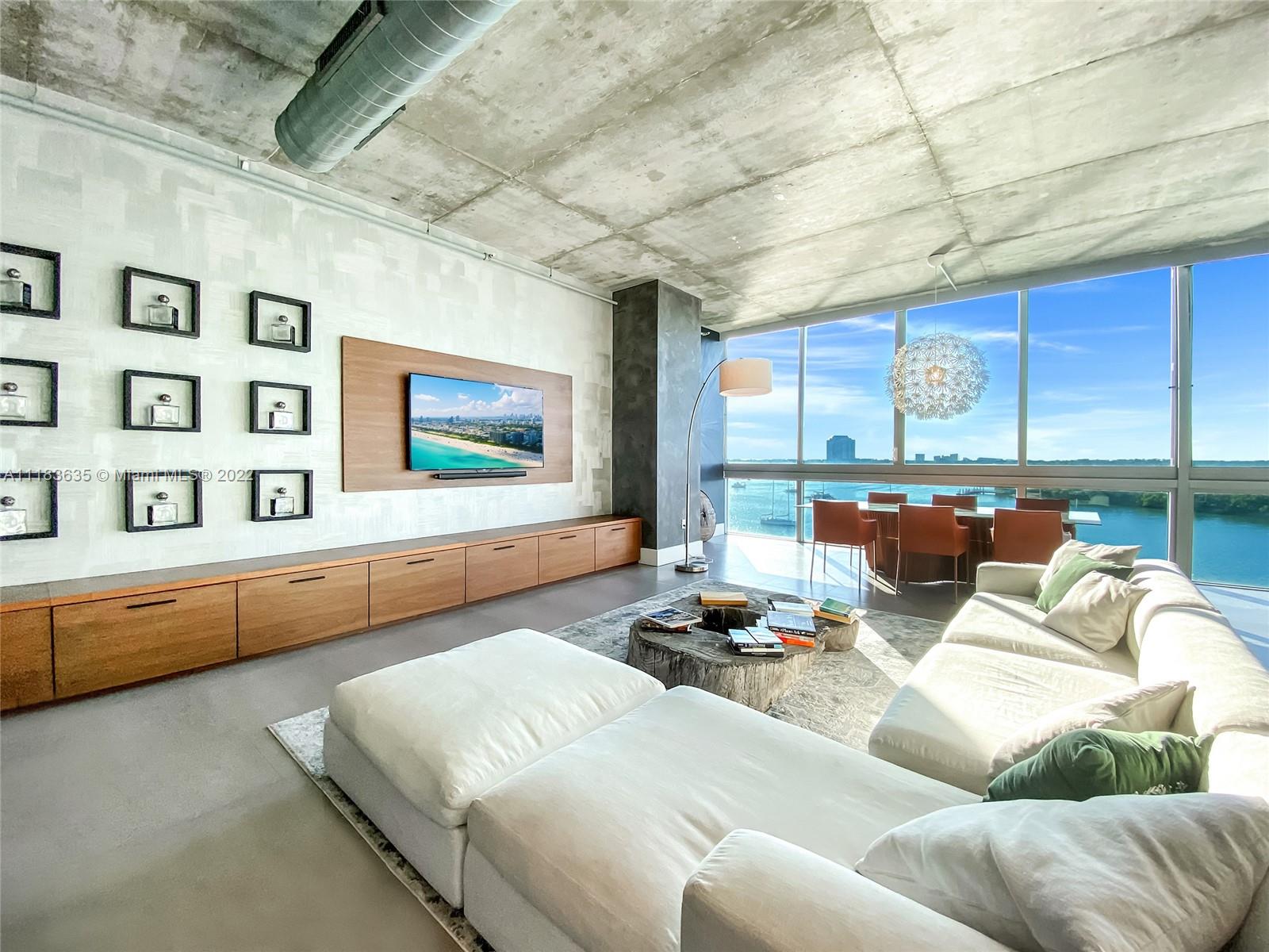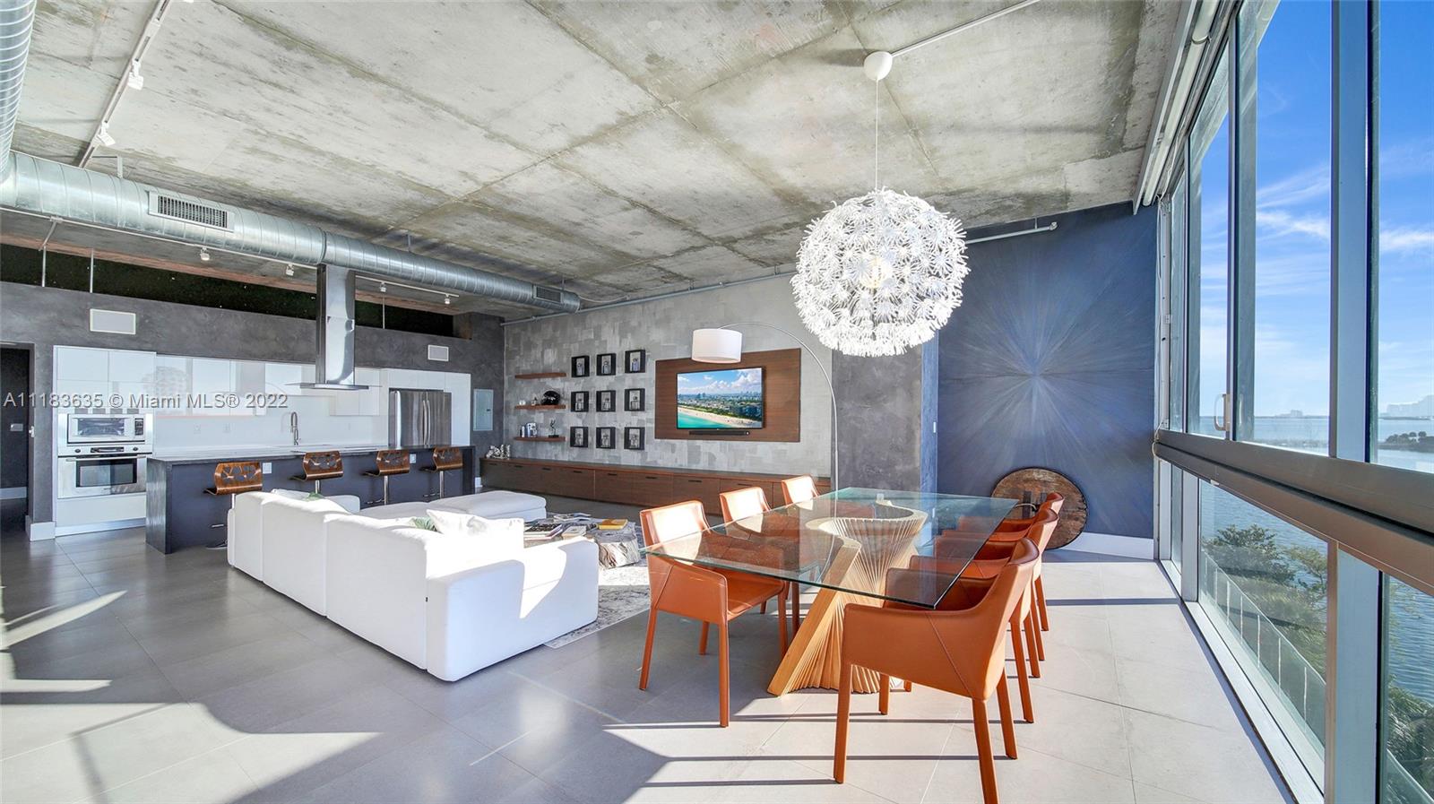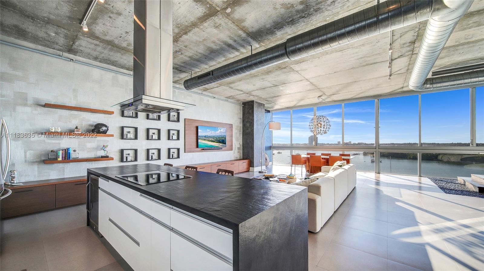 Unique loft at the contemporary Space 01 a waterfront building with panoramic views of Biscayne Bay and the Downtown Miami Skyline in North Bay Village, designed by award-winning architect Chad Oppenheim. One-of-a-kind unit with 11.16’’ high ceilings, floor to ceiling sliding door windows from side to side of the unit. All the walls in this unit are artistically covered with Faux Finish decorative painting, giving the walls a modern and sophisticated look that helps create different areas in the same space, like bedrooms, living room, dining and kitchen, facilitating flow and movement in the loft. Custom built furniture in living room, European style kitchen with stainless steel appliance , stone gourmet island with hood, wine cooler, custom closets, washer/dryer.