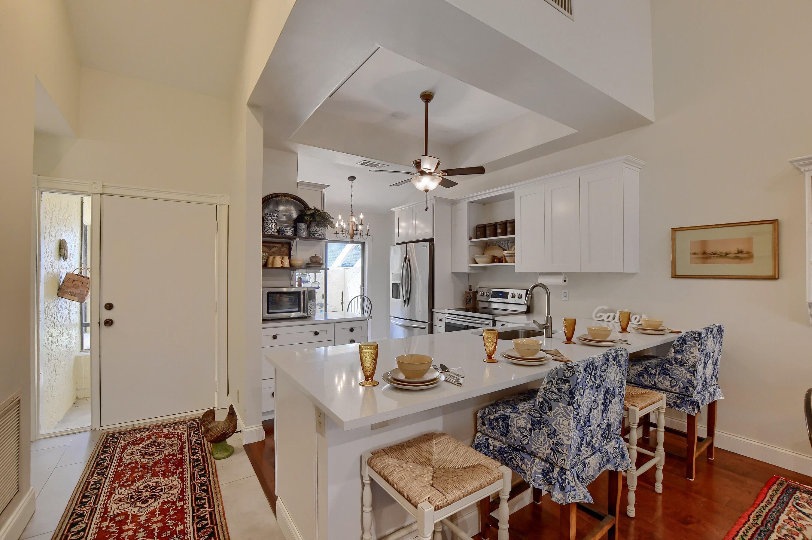 Outstandingly beautiful 55+ villa in the heart of Boca Chase. This rarely available gem offers a state-of-the-art new kitchen with polished white quartz and waterproof vinyl flooring. Stainless steel appliance, snack bar and oversized counters will surely bring out the chef in you! Regal living with formal dining room and cathedral ceilings make this home an easy choice. Your large living room is perfect for entertaining while the split floorplan gives privacy to all. Plenty of storage and room to roam is this highly sought-after beauty awaiting your final touches. Located in west Boca and mid-point between Miami and West palm for easy commute or travel. Known for its meticulous grounds, low dues and comprehensive HOA that provides a clubhouse, fitness center, resort pool