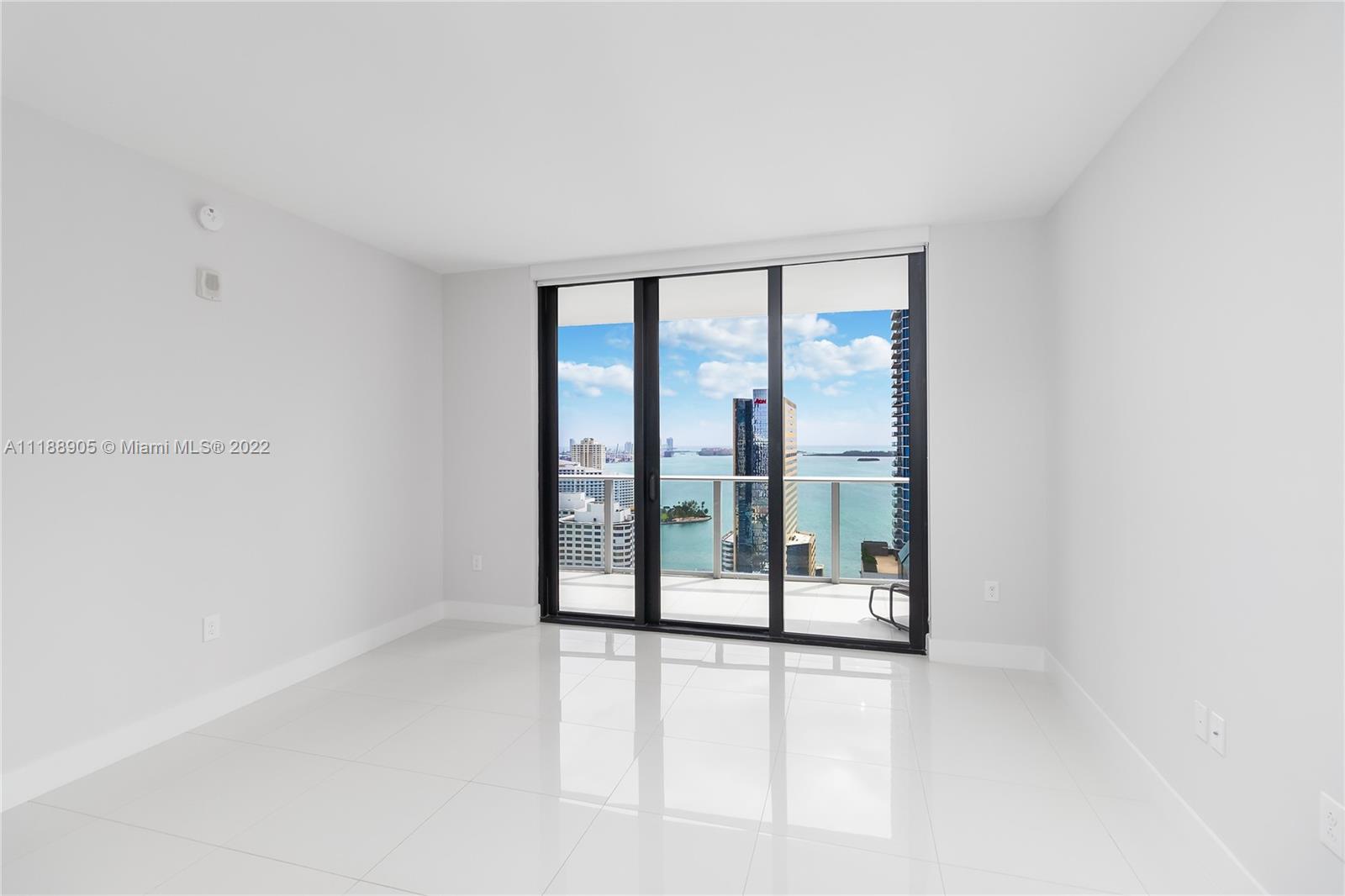 Premium high-floor unit with stunning bay and skyline views from walls of windows. Private balcony runs entire length of this skyhome with access from all rooms. Private elevator opens directly into this 2 Bedroom + enclosed den. This den includes a full bathroom so it is ideal for guests, nanny or extra bedroom. Work from Home or walk to the finance and tech offices outside your doorman lobby. Fast close welcome - tenant exits May 15, 2022. 1010 Brickell delivers resort-quality amenities including rooftop pool, children's room, running track, spa and haman, indoor basketball court, outdoor running track, club house, game room, on-site management and self-park garage.