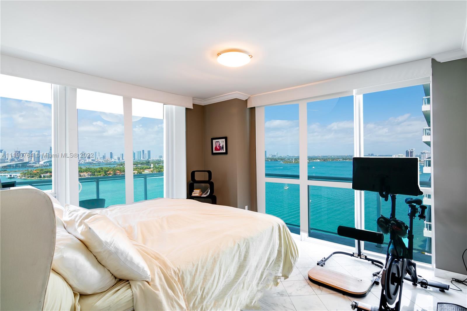 Stunning corner 2 bed/ 2 bath unit in Bentley Bay South Tower with direct unobstructed bay and Downtown skyline views. Enjoy gorgeous views of the bay and ocean from the large corner balcony. Unit features a spacious living area, blackout shades throughout, walk in closet in the primary suite, and 9 foot ceilings throughout. Residents appreciate 24 hour security, concierge, valet and A-class amenities including an infinity edge pool, two jacuzzies, sauna & steam room and newly renovated fitness center. Directly across from the new 3-acre West Ave Miami Beach Park.