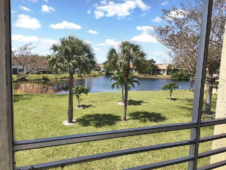 2nd Floor corner condo: Move-in condition Villa. Tiled floors, carpet in BR. Kitchen has tiled backsplash, dishwasher, stove. Lg walk-in storage closet. Great lake view from enclosed patio. 55+ community is 24/7 guard gated. (One occupant must be 55+) Clubhouse with pool, gym, cafe, auditorium, billiards, card room etc. Come Discover Golden Lakes