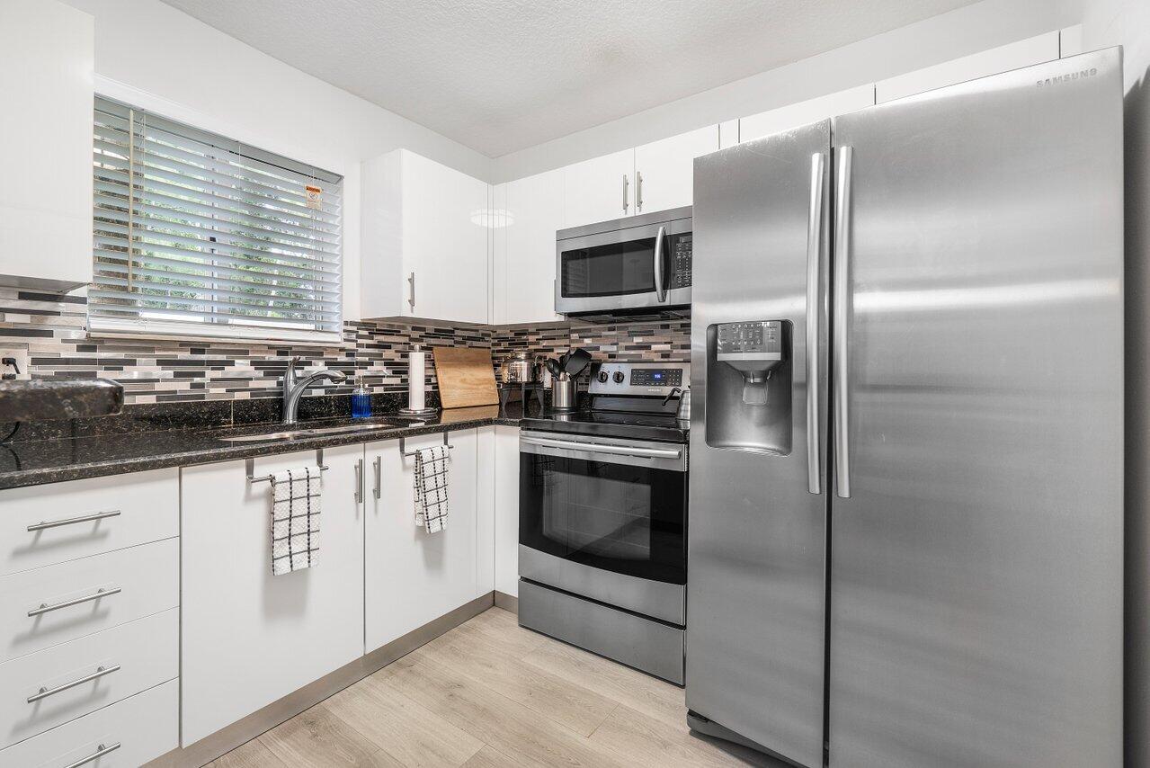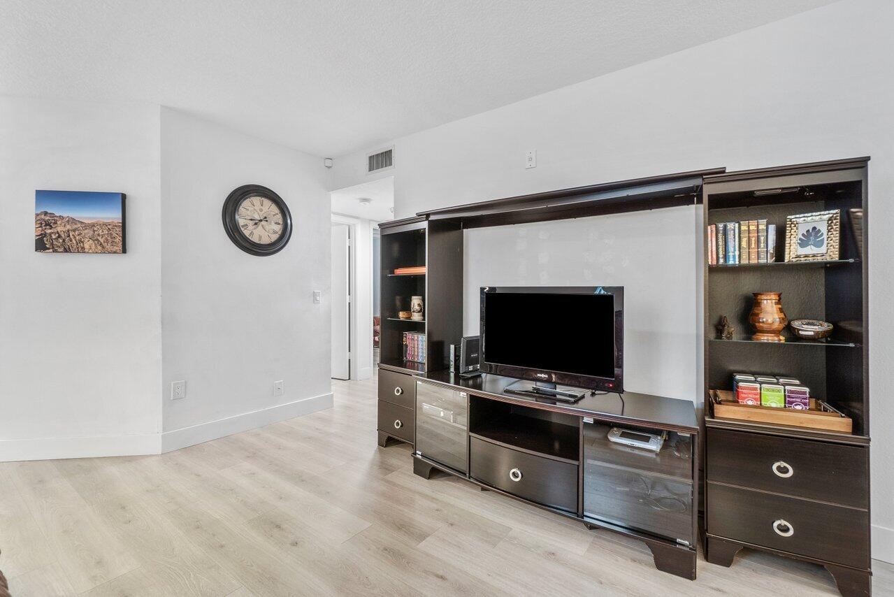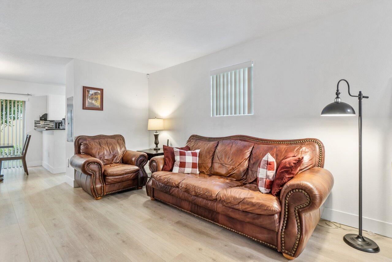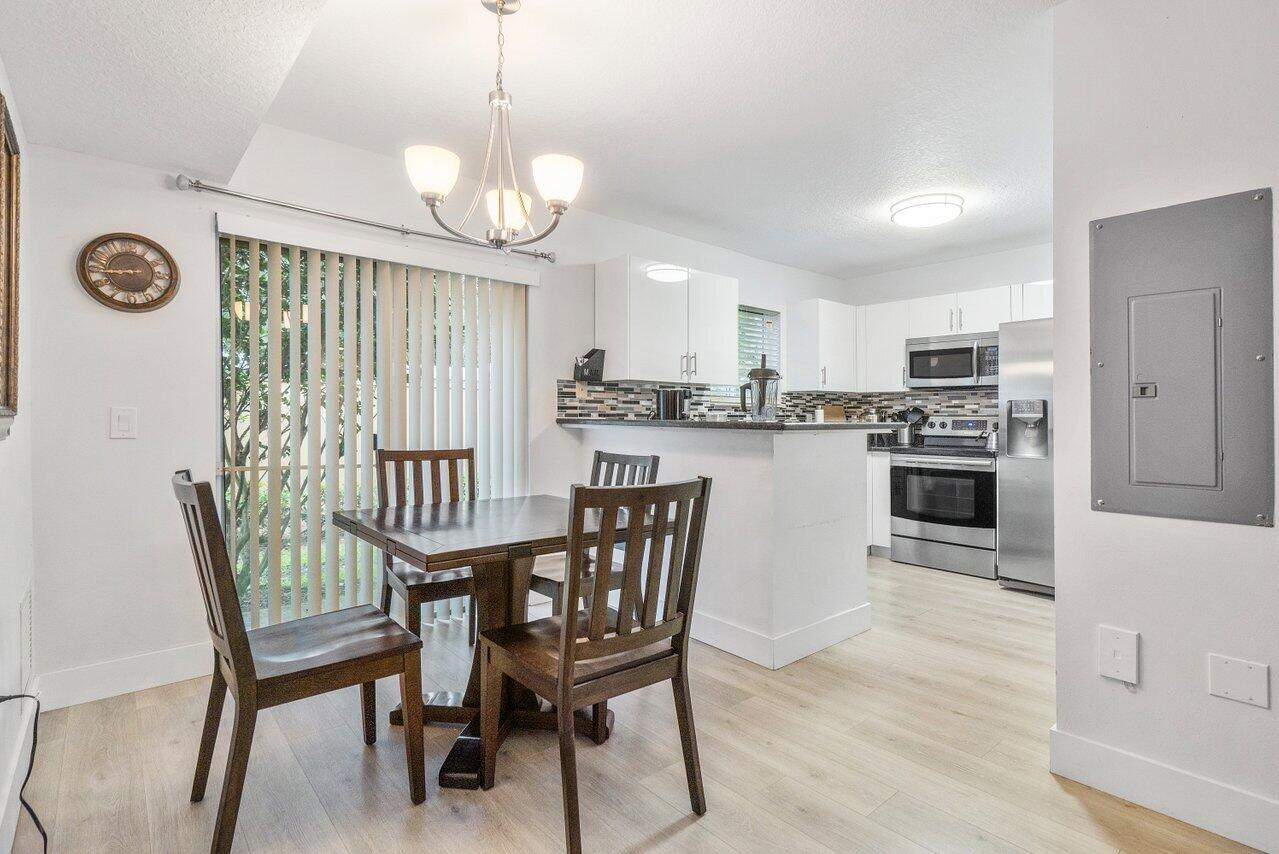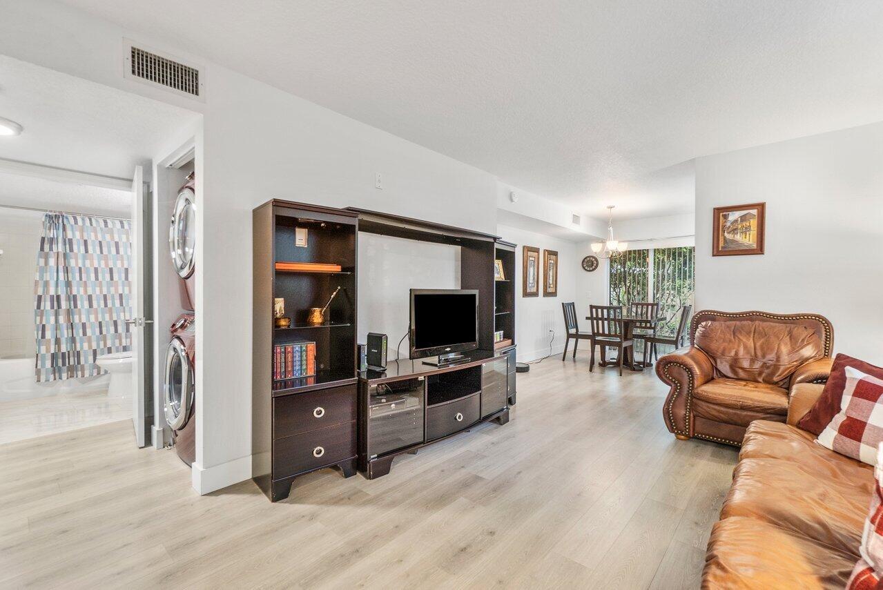 Beautiful 1st floor corner unit located in a gated community. The split floor plan with 3 bedrooms, 2 baths condo is updated with engineered wood flooring. The kitchen featuring updated white cabinets, granite countertop, tile backsplash, and stainless-steel appliances. The master bedroom with walk-in closet & updated master bathroom. The 2 bedrooms good size, 2nd bathroom updated and inside laundry with red-hot front loader washer & dryer. Newer air conditioner. This community is centrally located near Turnpike and I-95, City Place, Beaches, Restaurants. Schools, Palm Beach Outlets & Supermarkets. ALL AGES welcome, pet friendly, with community pool. NO RENTAL 1st year of ownership.Great opportunity to buy a move in ready unit with low maintenance fee!