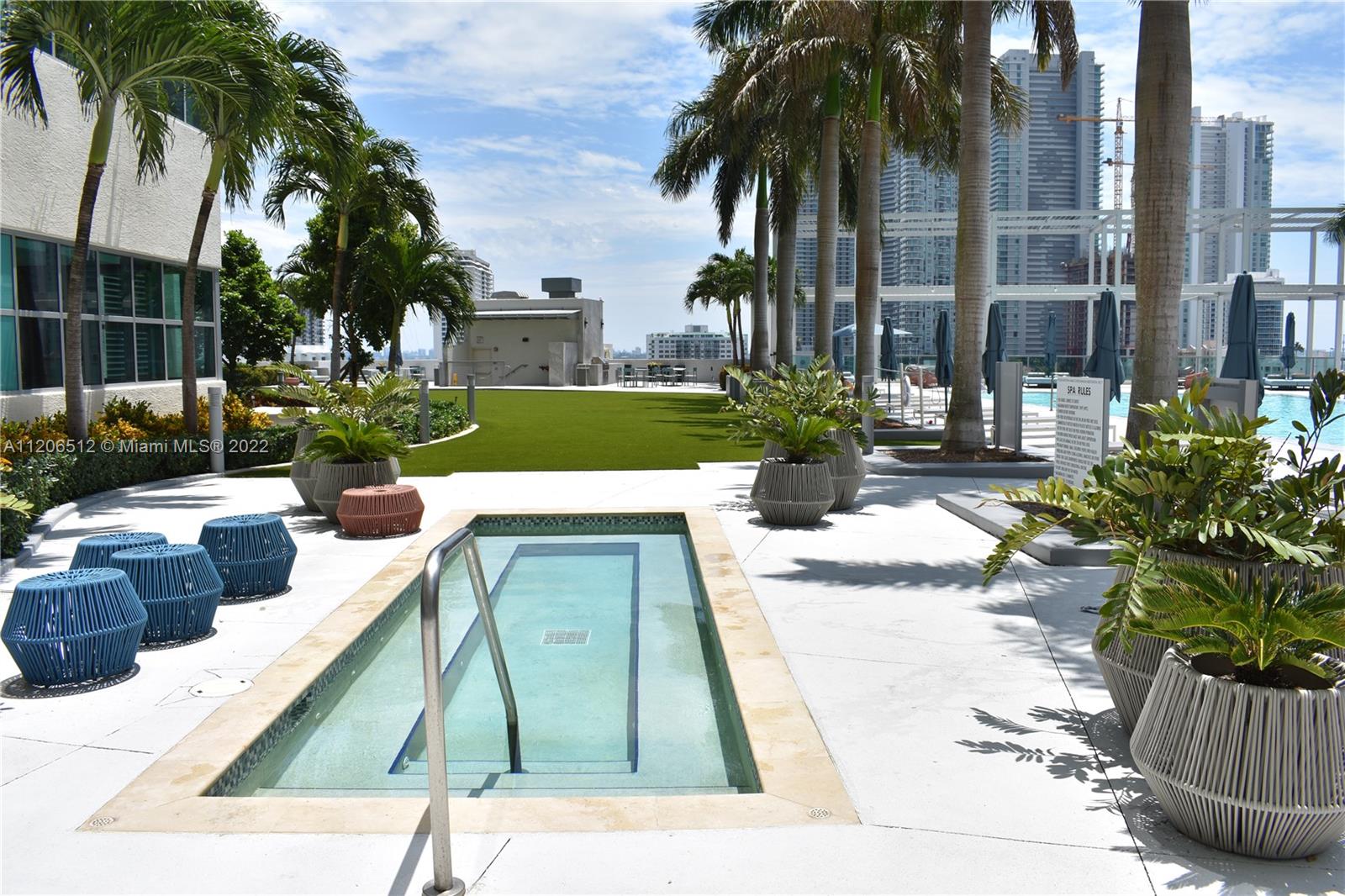 Modern studio with floor to ceiling windows, SS appliances, large balcony with panoramic view facing NW and partial bay view. Washer & dryer in the unit. Amenities include concierge, 24 hour security, secure parking, rooftop pool with view, hot tub, sauna, fitness center, BBQ area, on-site management company and more. Cable and internet included in maintenance fees. Walk to restaurants, shopping, bars, and neighboring Design District and Wynwood. Pet friendly. Unit has easy access parking spot when entering the building. Ideal for personal use or investment. Tenant occupied on monthly basis.