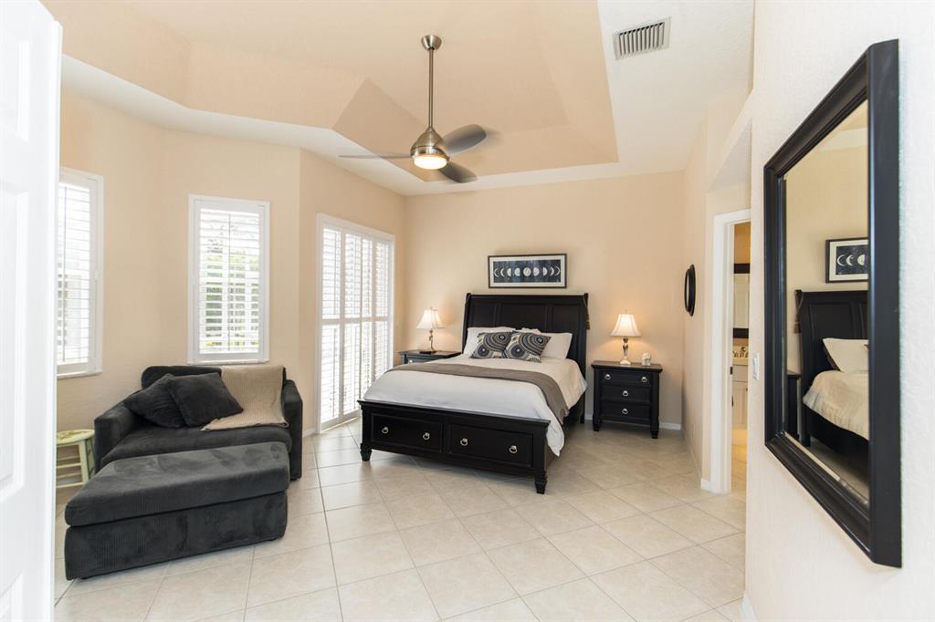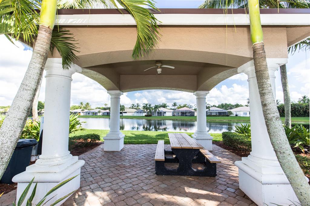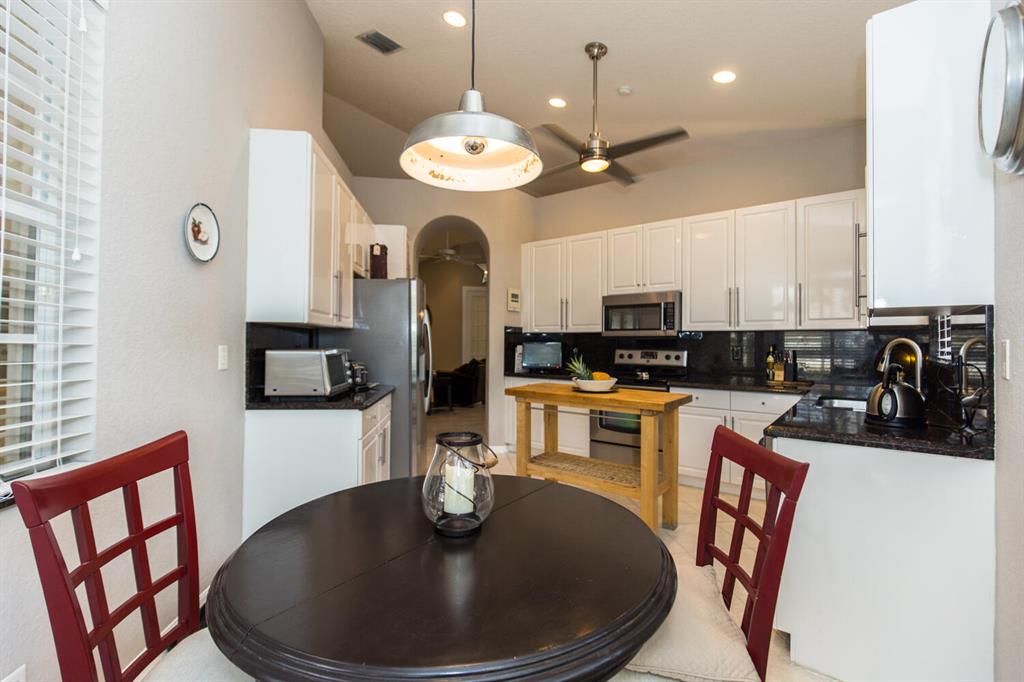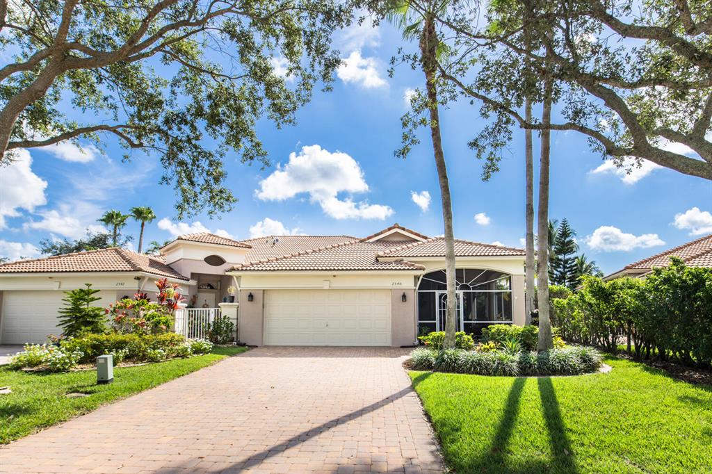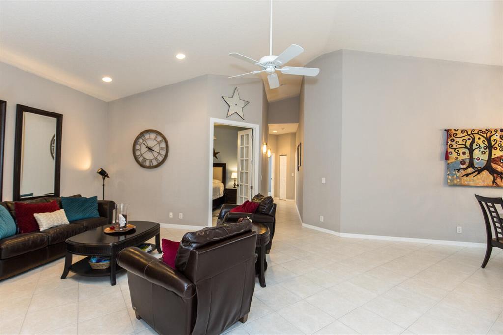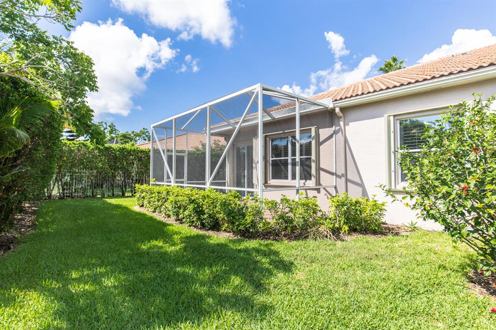 Shows like a model home!. Extremely well kept 2BR villa plus den/ office or possible 3rd bedroom. Kitchen features granite counters and Maytag stainless steel appliances. The whole interior has diagonal laid tile floors. Plantation shutters adorn the windows and all exterior openings have accordion hurricane shutters for protection. Covered screened porch in the front of the house and large screened porch in the rear. Vaulted ceiling in the living areas and coffered ceilings in the master BR with numerous hi hat lights. The spacious master bathroom features under counter lighting a separate tub & shower. The den features french doors and the hallway sconce lighting.Other features include a brand new dryer, 1.5 year old washer, 1 year old garage door opener and a painted garage floor.