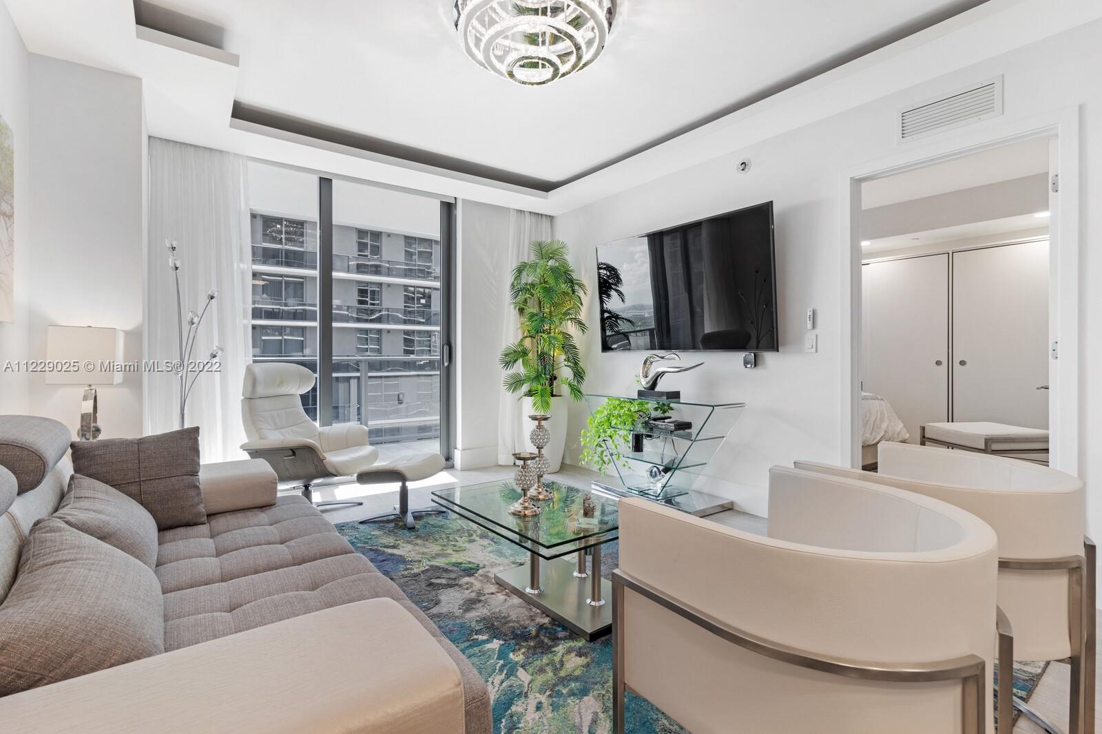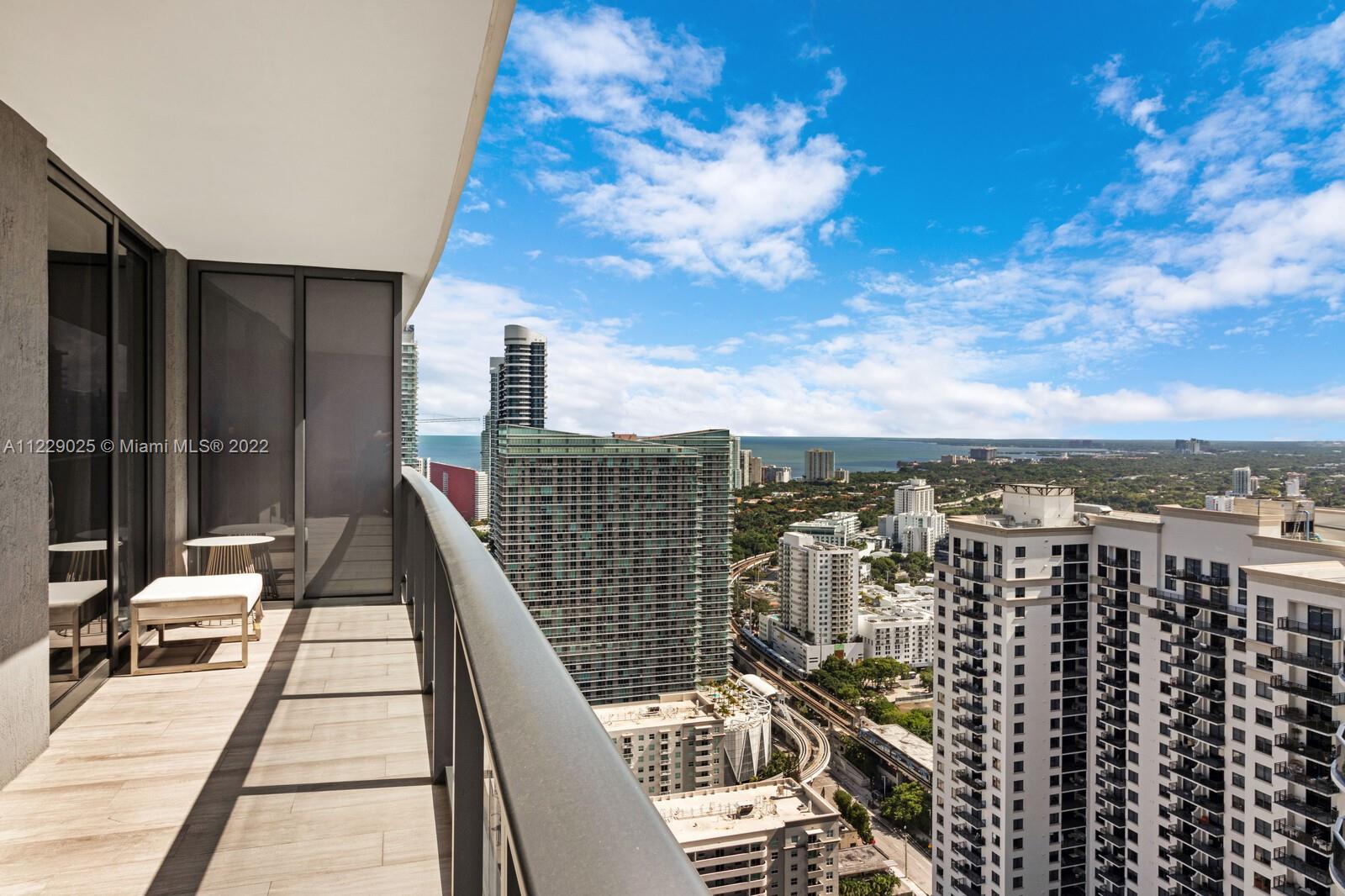 With stunning views from the spacious terrace, this modern 1 bedroom/1 bathroom condo is located in the heart of Miami's vibrant & fashionable Brickell area. Residents only rooftop sky pool deck with panoramic views & luxuriously landscaped 9th floor pool terrace & mini golf area, state-of-the-art fitness center & business center with complimentary coffee/tea bar. Two stunning entertainment rooms available for private events. Multilingual staff, 24-hour security, & more! One valet parking space included. Additional valet parking is $200/month. Washer/dryer in unit. Furniture included in purchase! HOA: Master $337.61/m + East $286.80/m