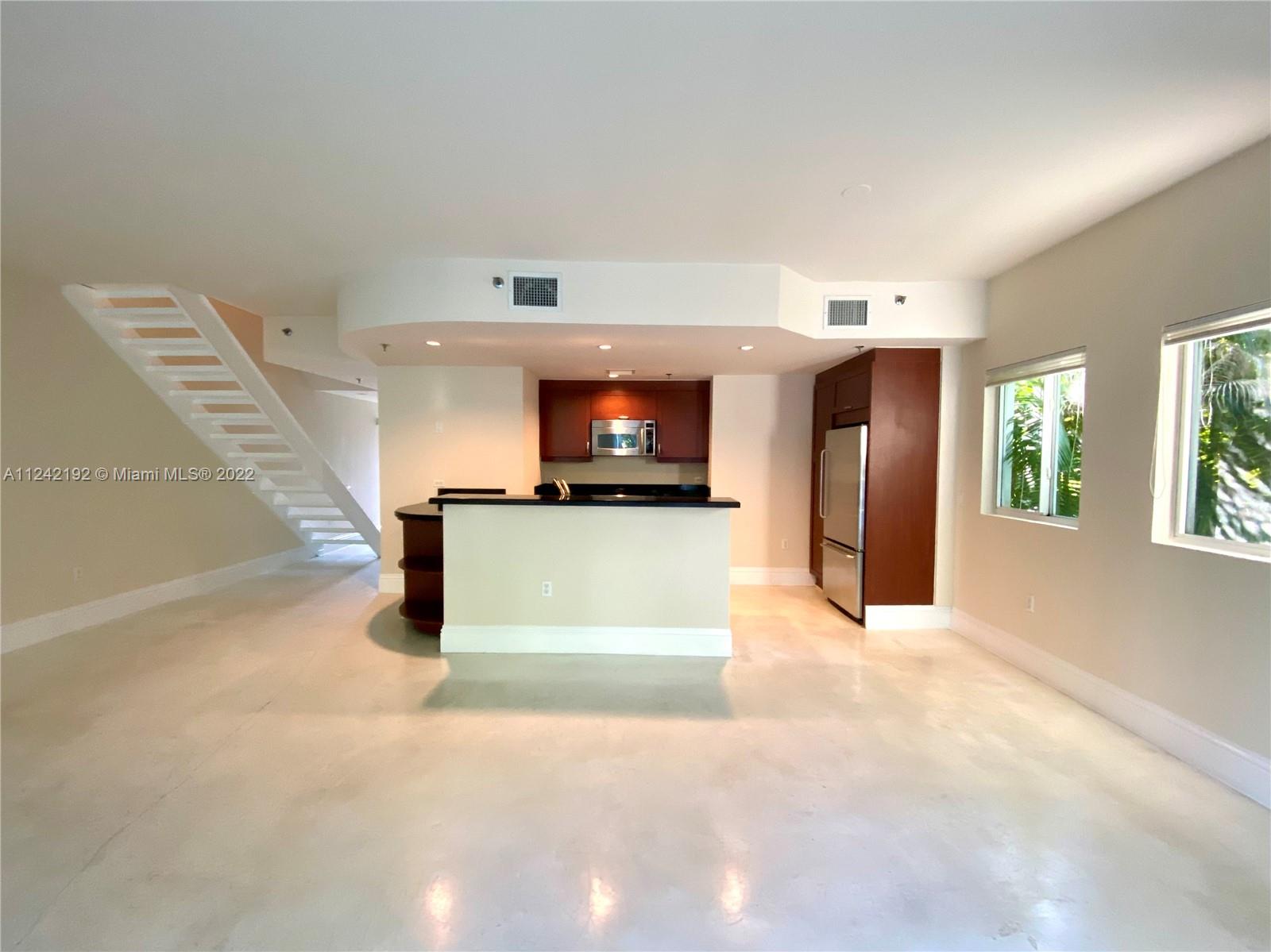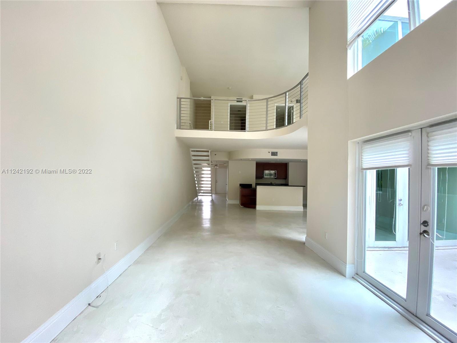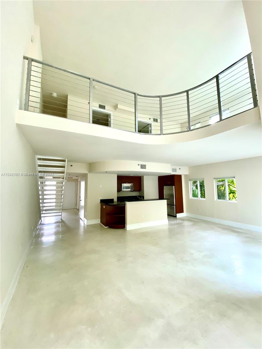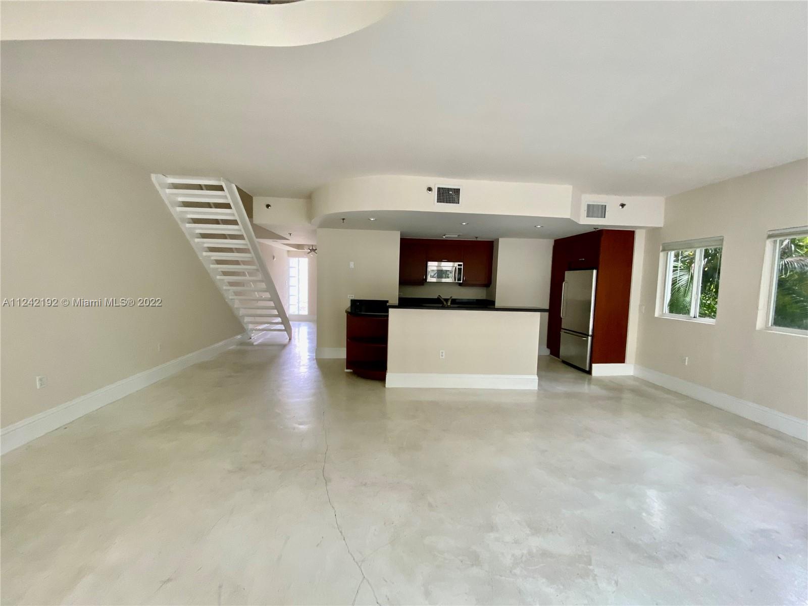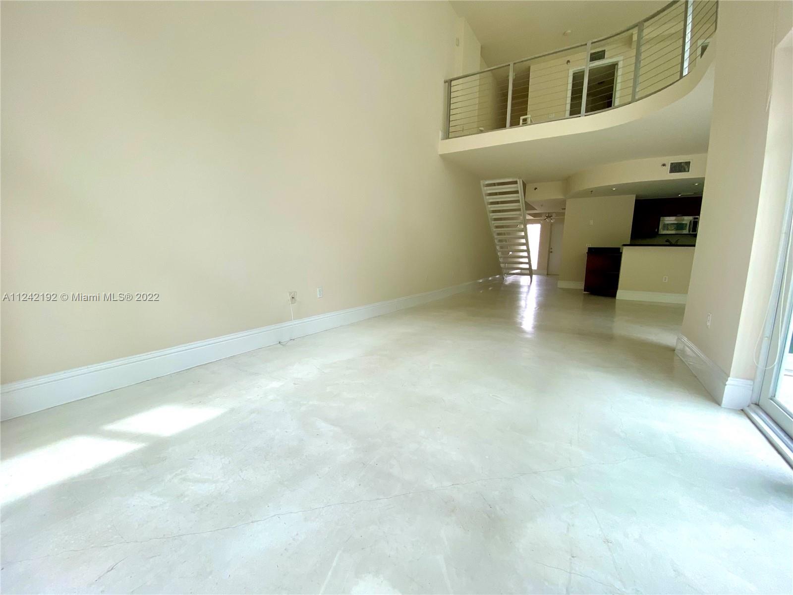 Spacious loft style on 2 levels, master bedroom and bath upstairs, featuring concrete floor, private balcony , stainless steel appliances, 2 parking garage spaces, common pool