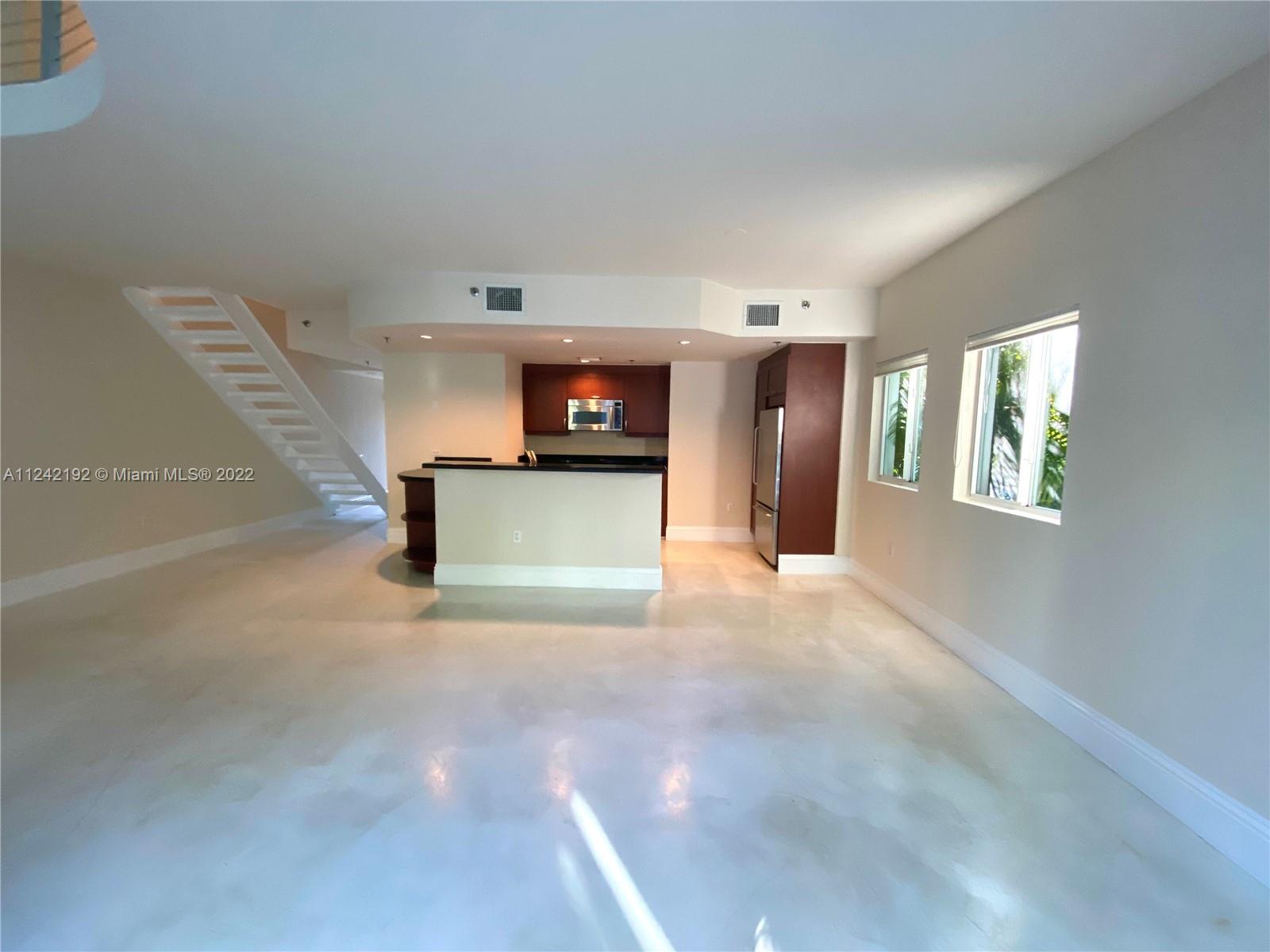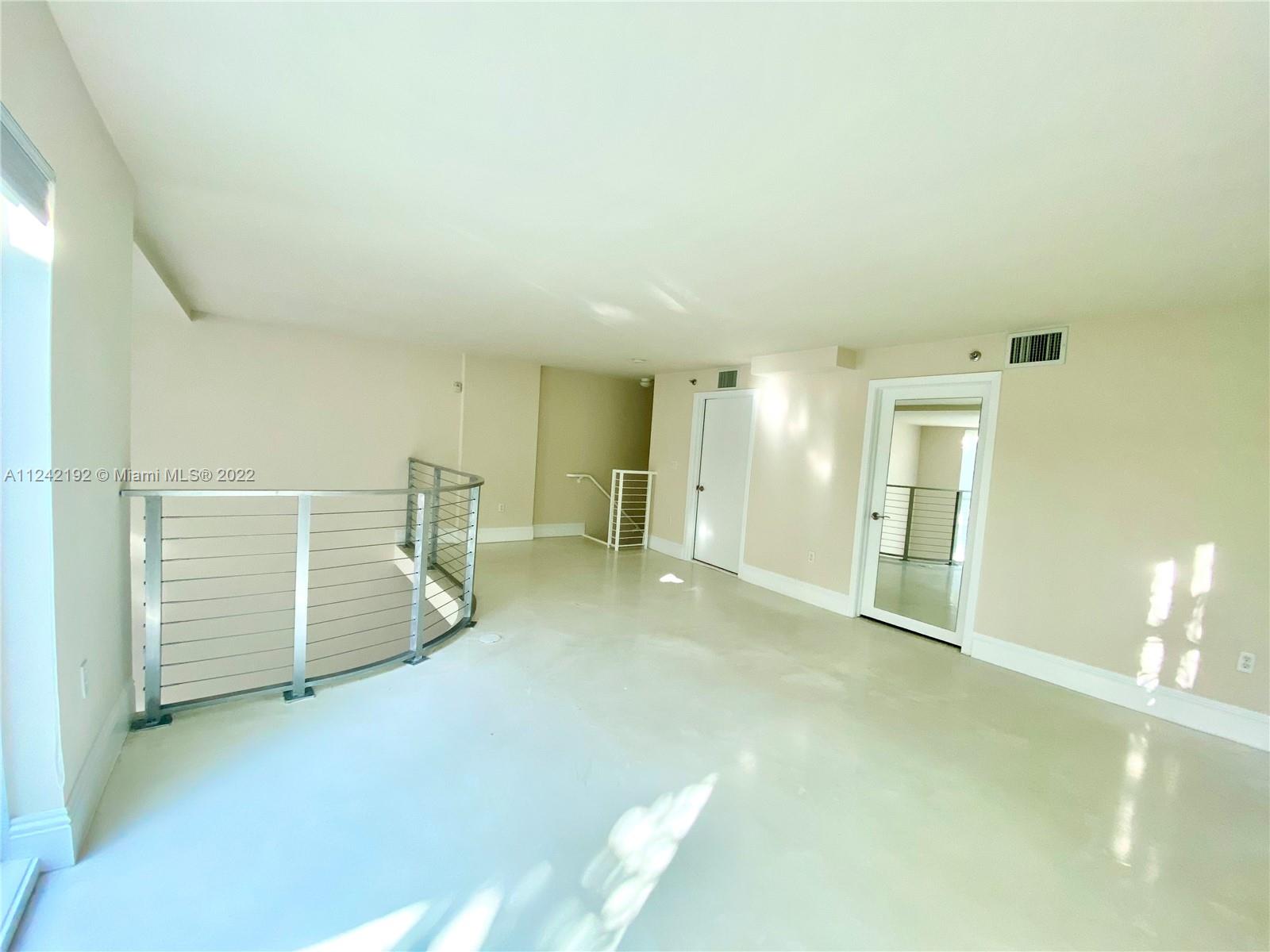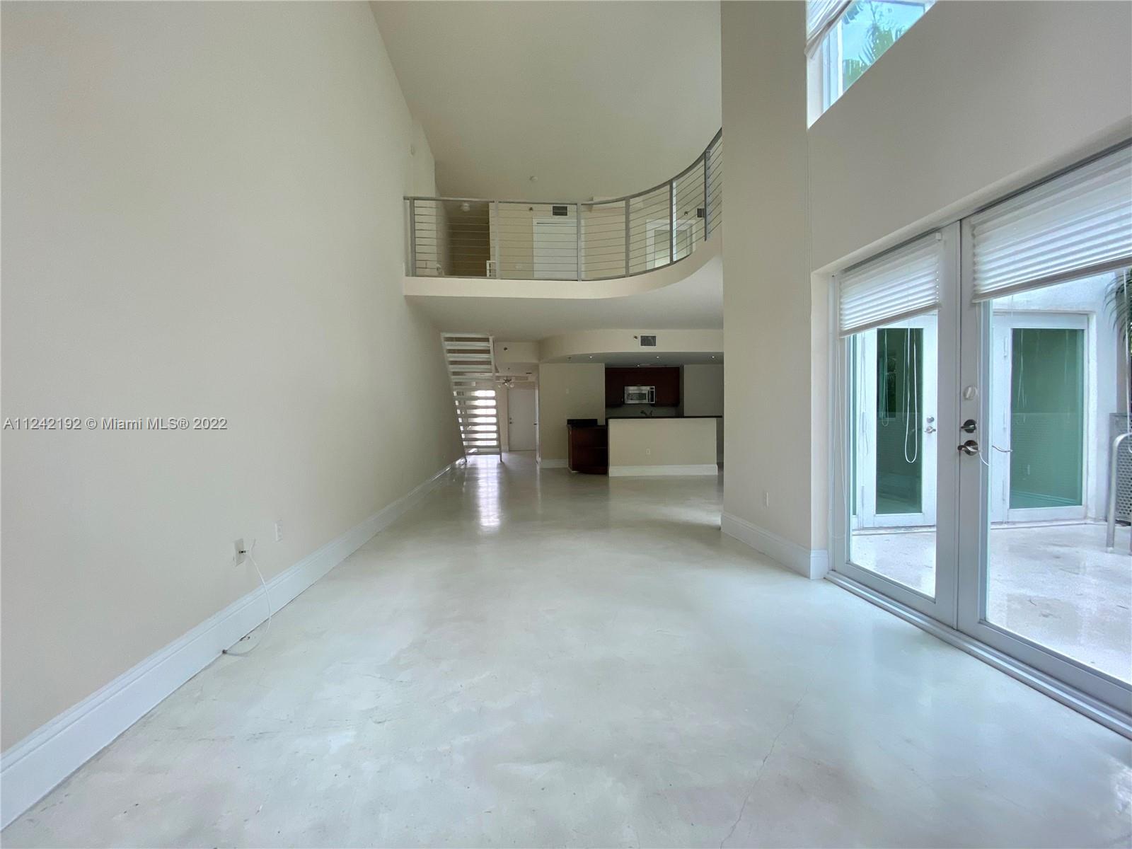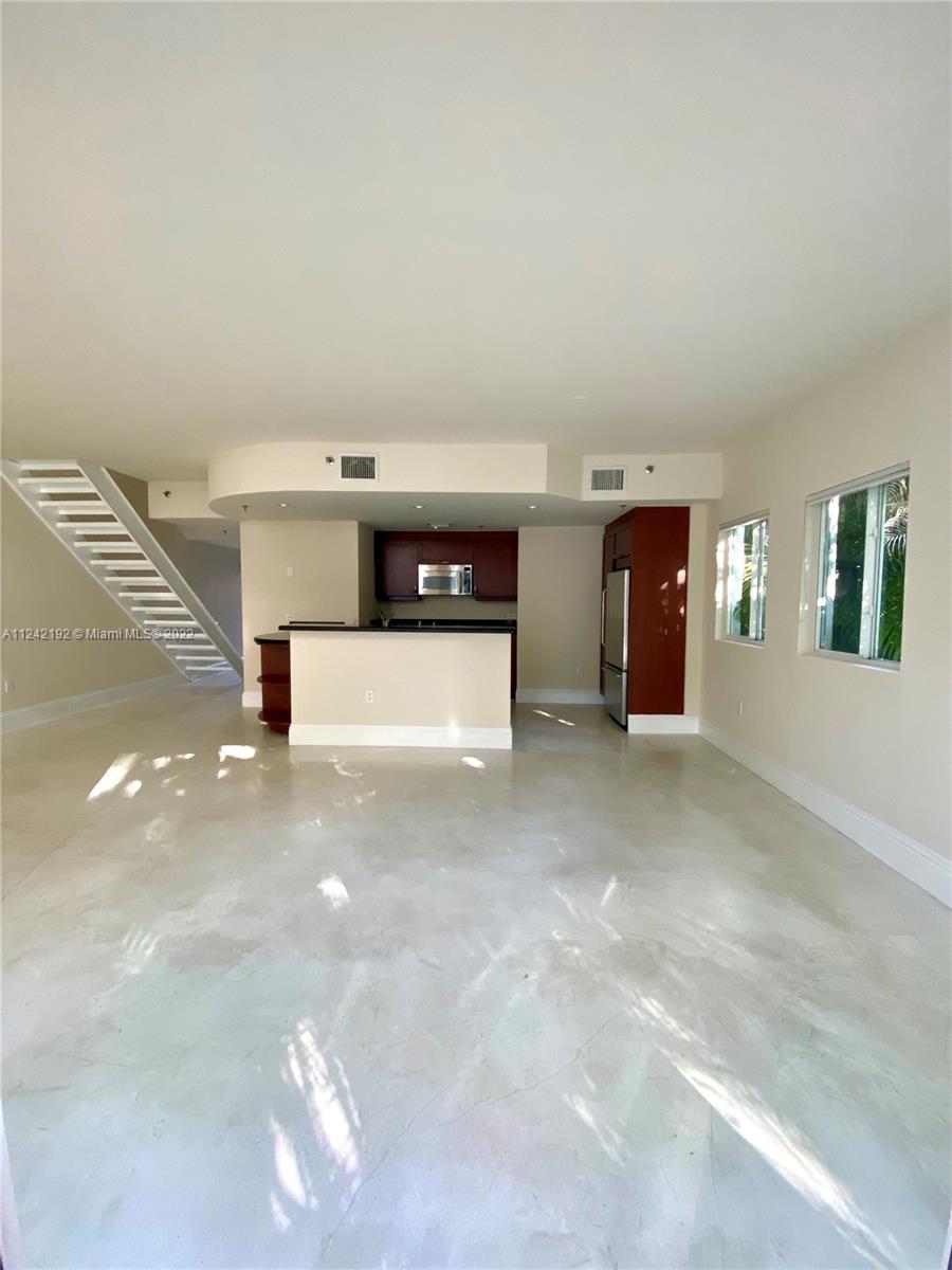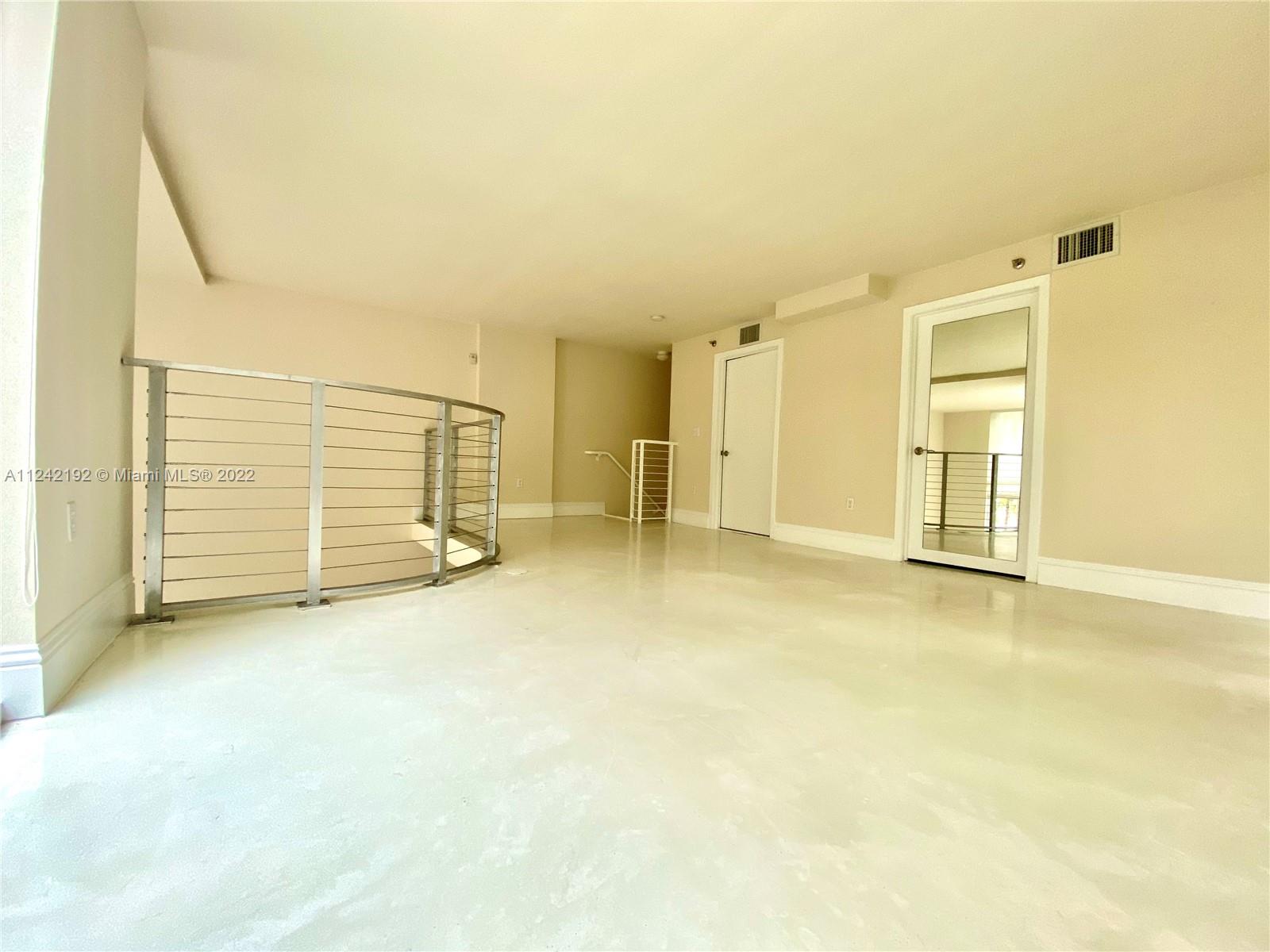 Spacious loft style on 2 levels, master bedroom and bath upstairs, featuring concrete floor, private balcony , stainless steel appliances, 2 parking garage spaces, common pool