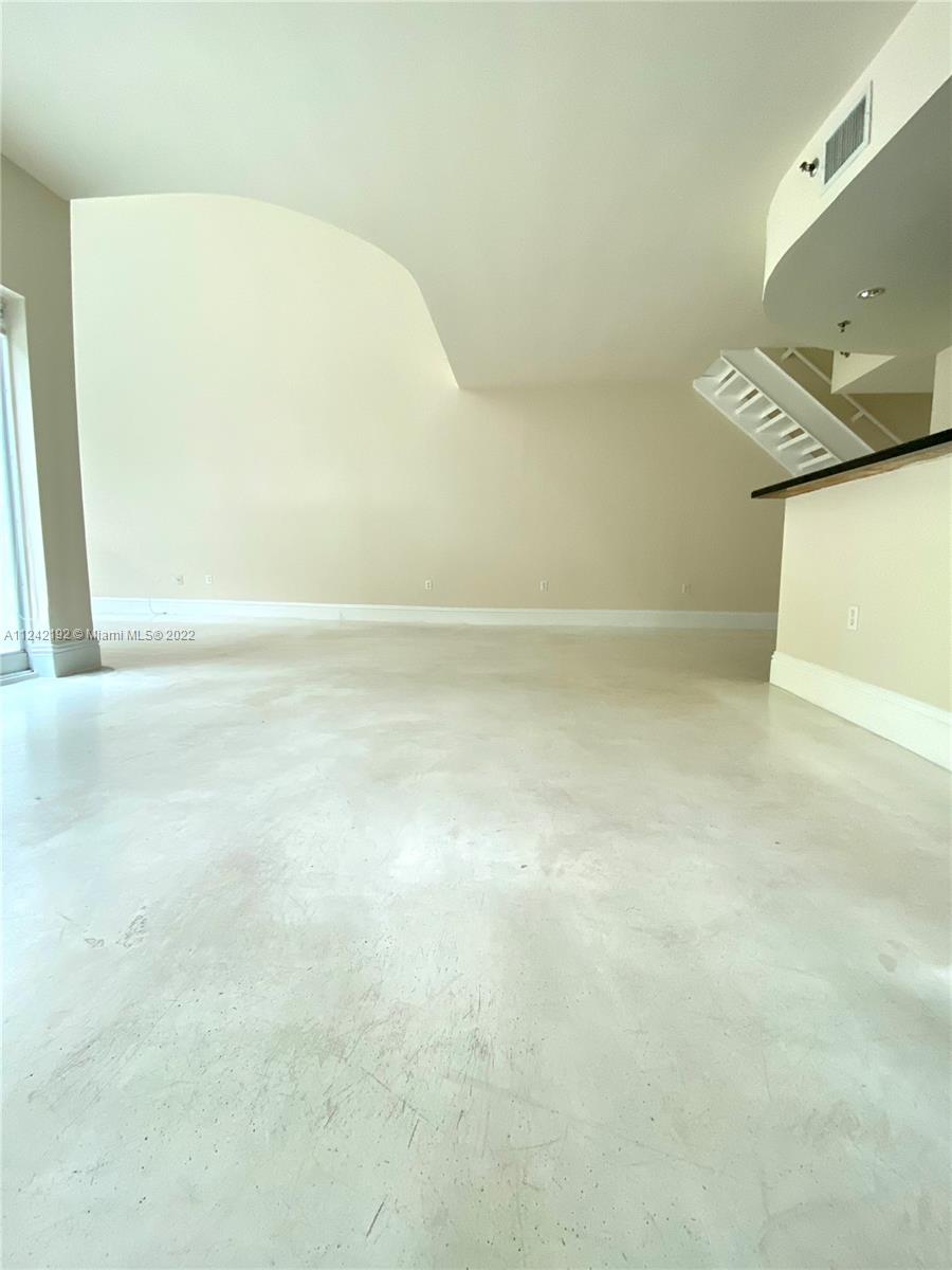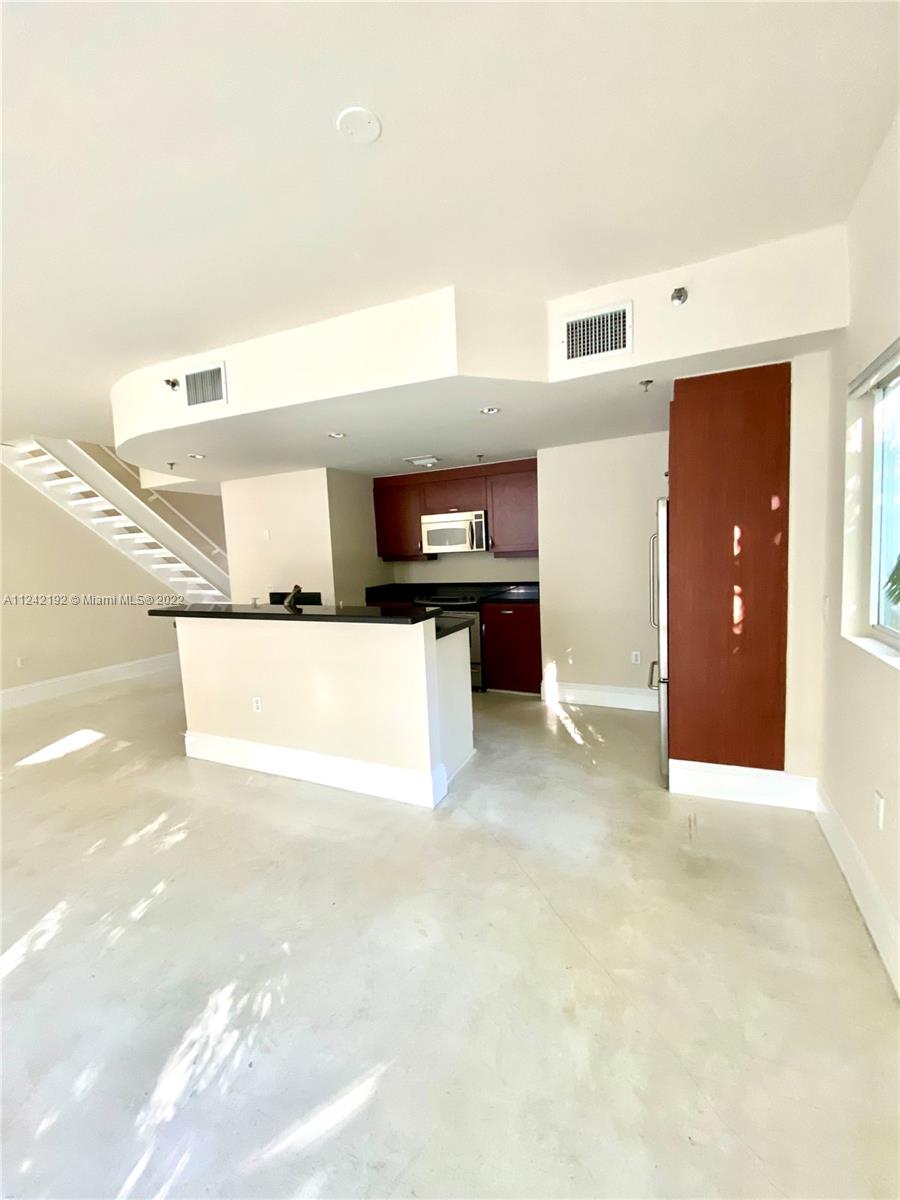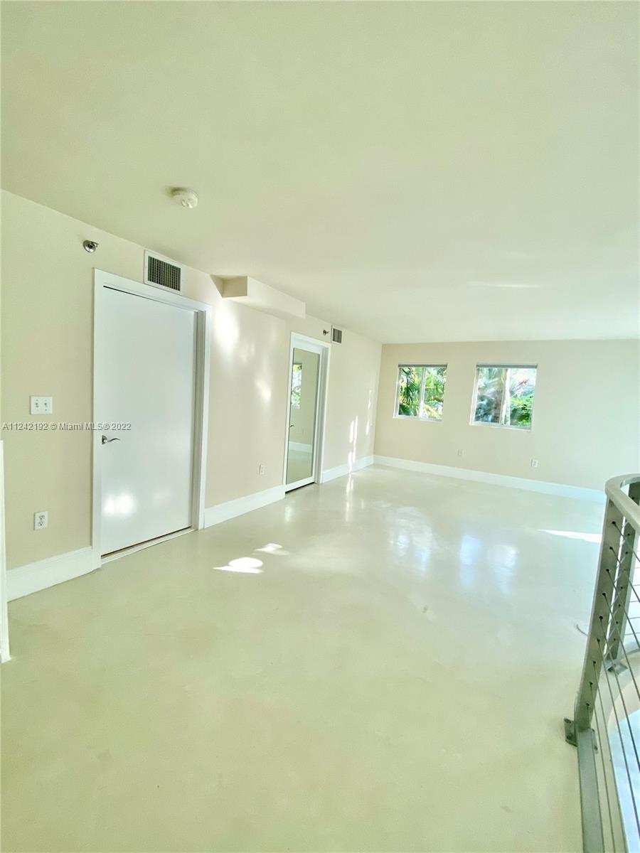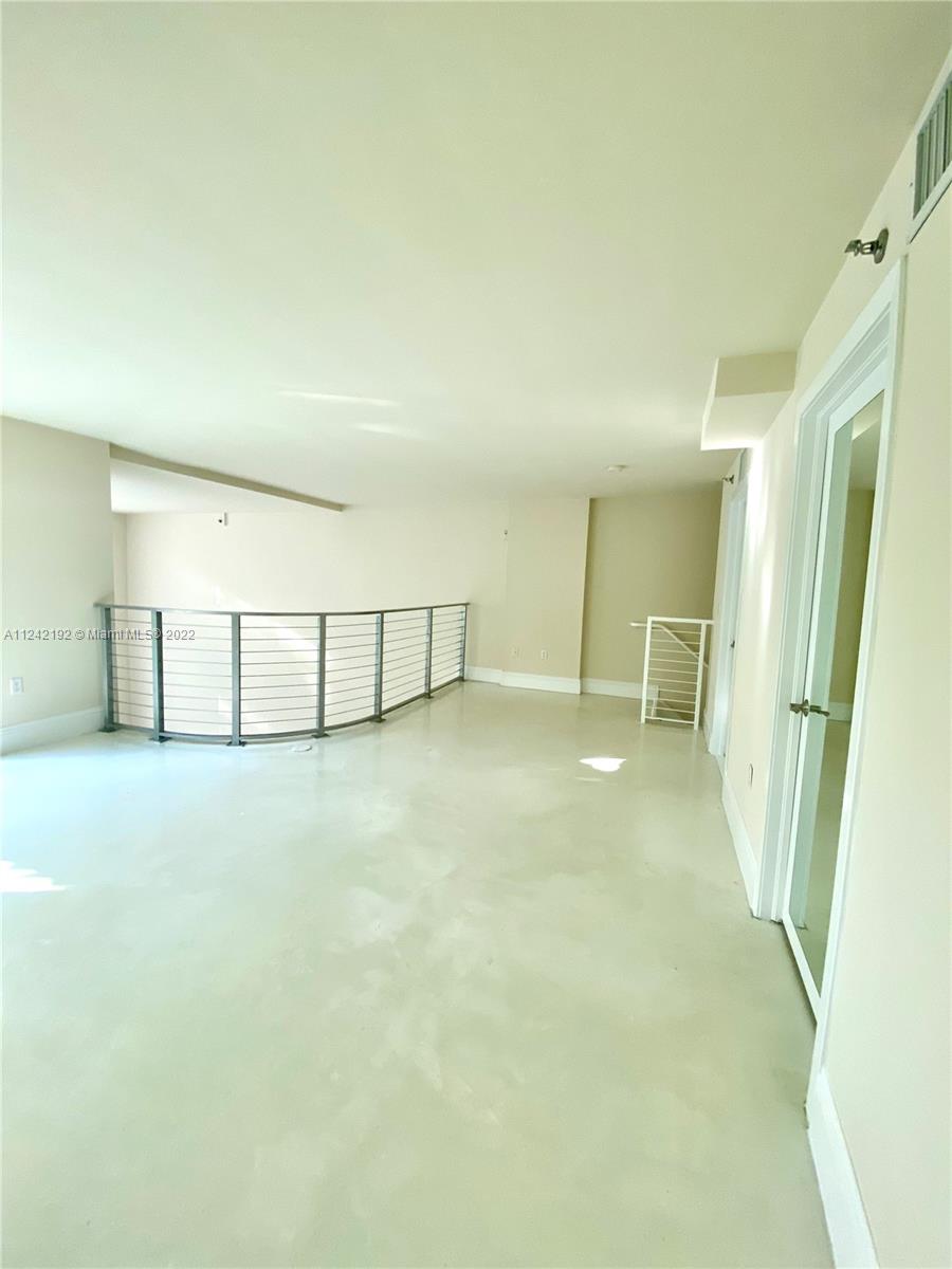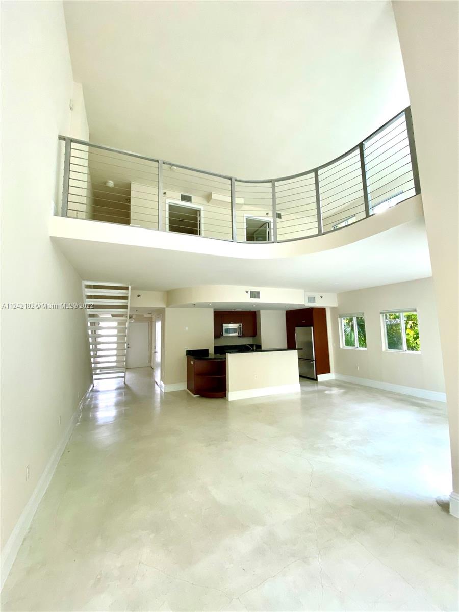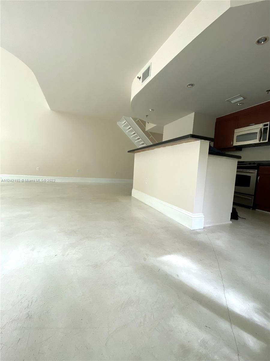 Spacious loft style on 2 levels, master bedroom and bath upstairs, featuring concrete floor, private balcony , stainless steel appliances, 2 parking garage spaces, common pool