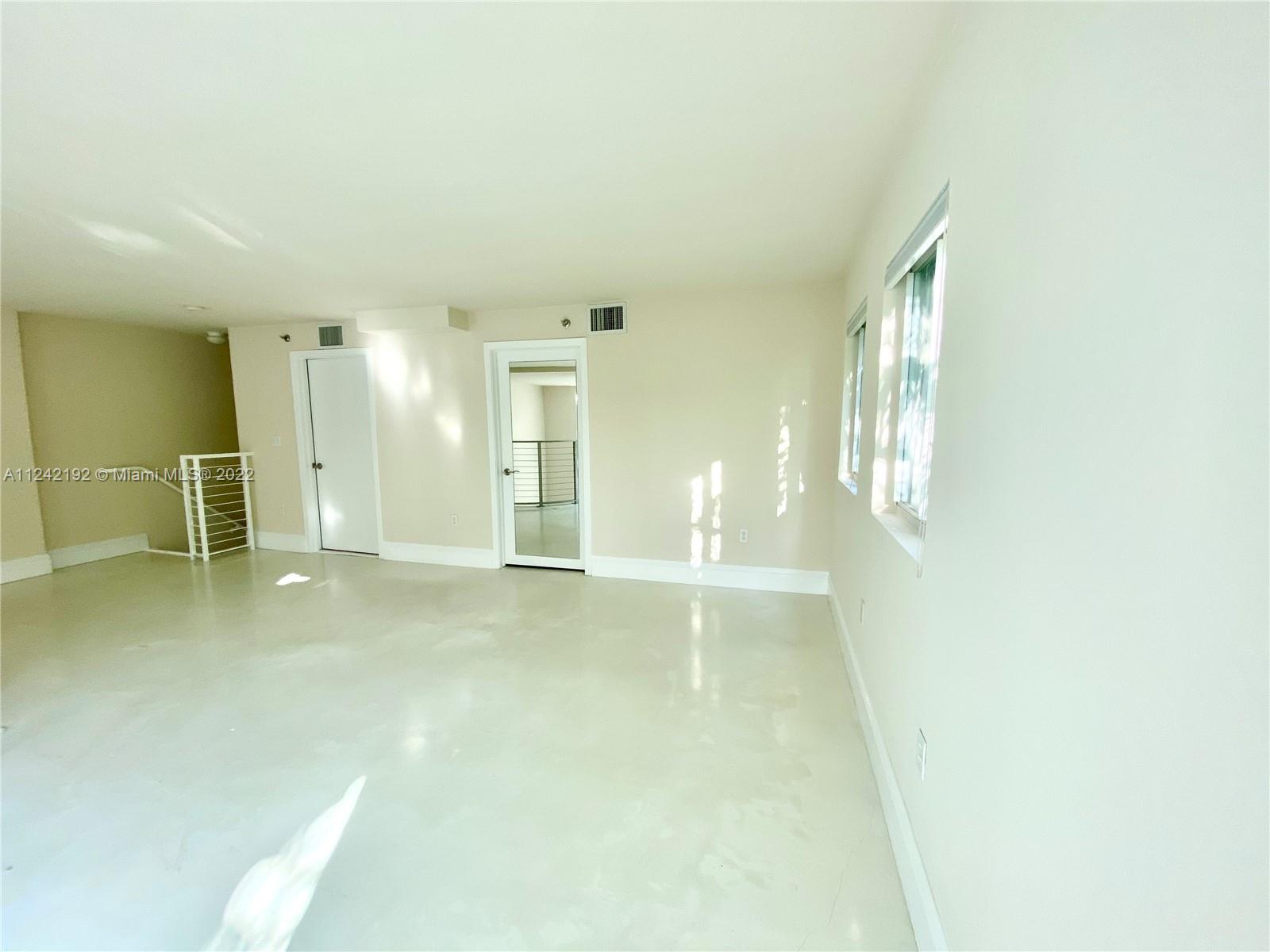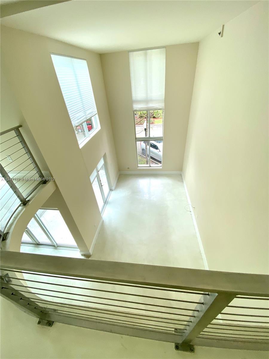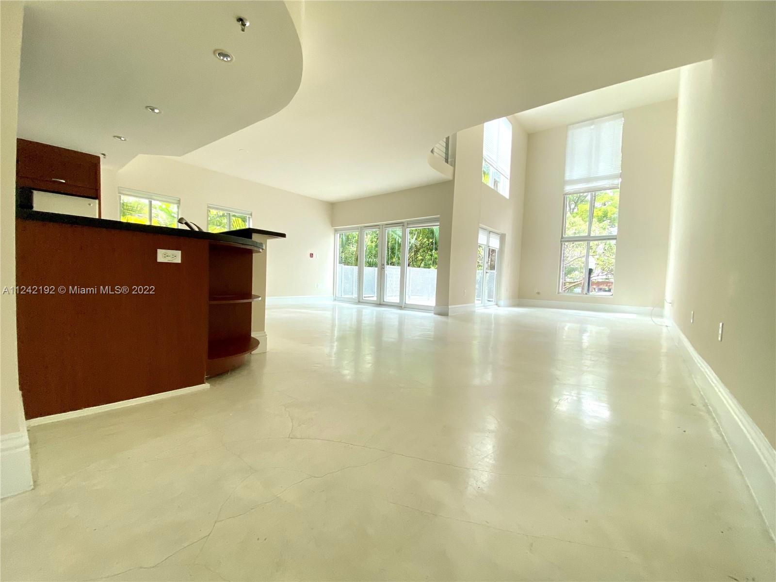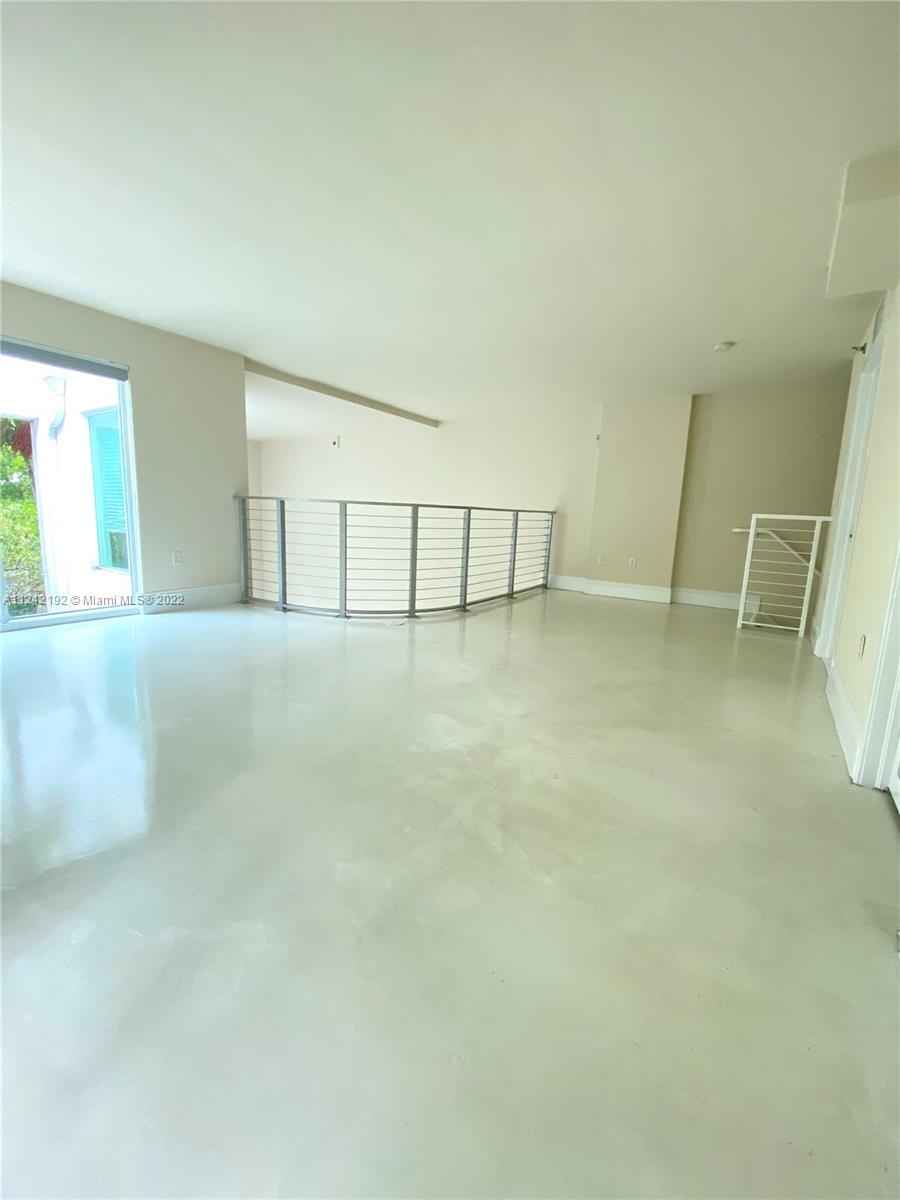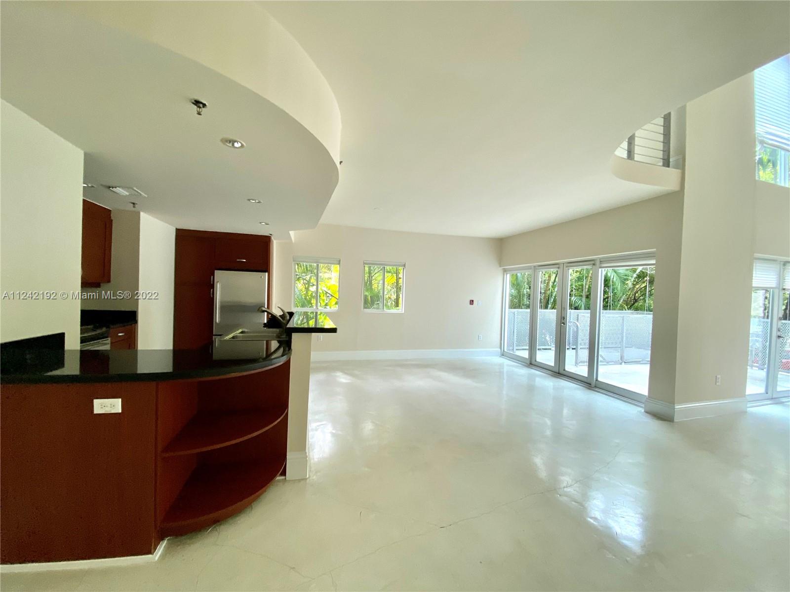 Spacious loft style on 2 levels, master bedroom and bath upstairs, featuring concrete floor, private balcony , stainless steel appliances, 2 parking garage spaces, common pool