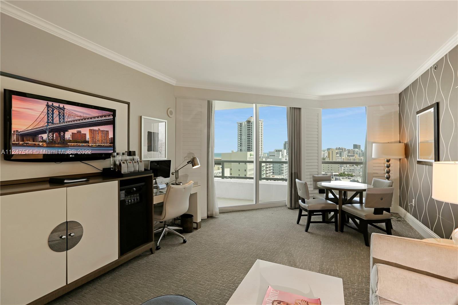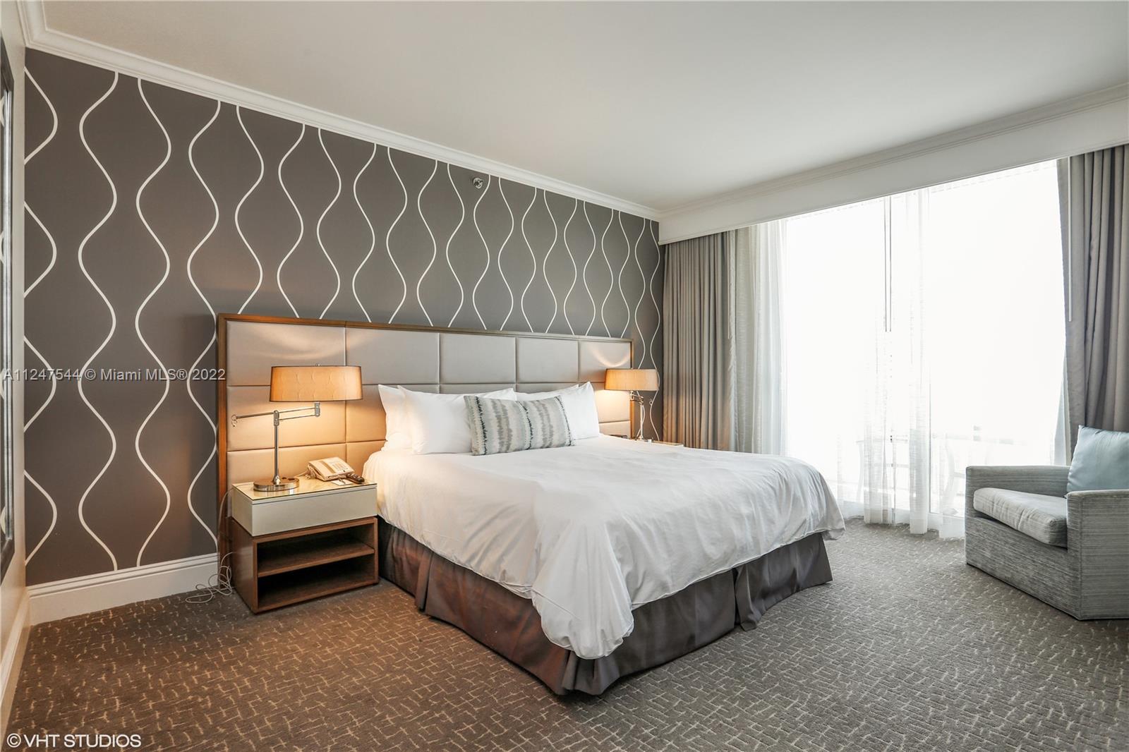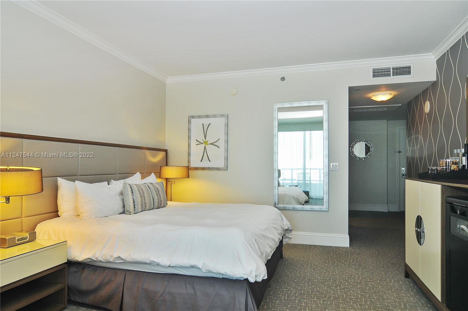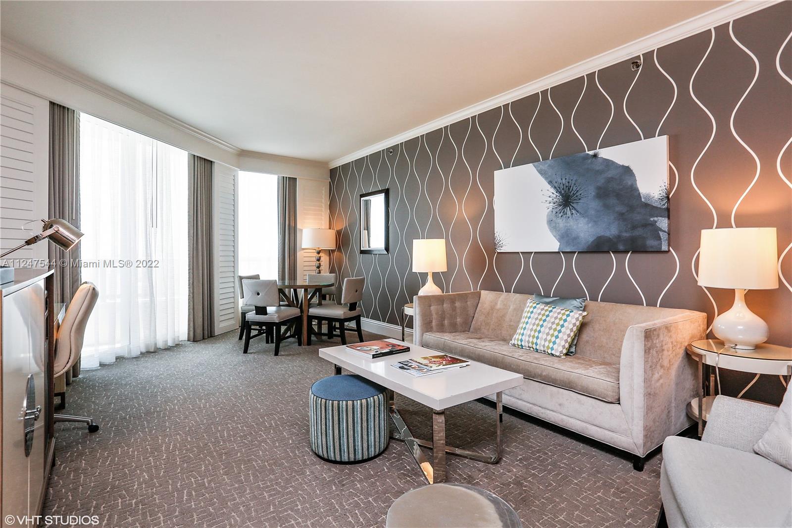 Beautiful 1 bedroom with southern exposure and views of the ocean, city and intracoastal at Fontainebleau II. Enjoy full service, vacation-style living in a furnished turnkey unit with ample closet space and private terrace. This unit comfortably sleeps 4 with a king bed in bedroom, living area with sleeper sofa and full kitchen. Enroll in hotel rental program & receive income while away! The Fontainebleau Resort offers luxury amenities on 22 oceanfront acres including award-winning restaurants, LIV night club, Lapis spa & state-of-the-art fitness center. Maintenance includes AC, local calls, electricity, valet + daily free breakfast in the owner’s lounge.