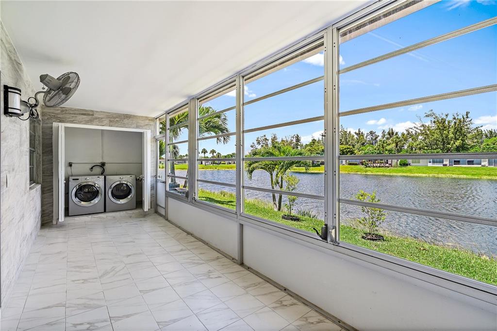 This gorgeous completely renovated 2/2 villa is move-in ready and overlooks the lake! Everything was recently updated and painted, no popcorn ceiling here! Kitchen features beautiful white cabinets & granite countertops, brand-new stainless steel appliances and LED lights. Both bathrooms completely redone! Tile floors throughout while primary bedroom has lovely views of the lake. Enjoy a nice evening on the enclosed patio. Washer & dryer inside unit. A/C 2014, WH 2018. Fabulous clubhouse, workout facilities, large pool, spa, tennis and shuffleboard and so much more for active seniors. Bus service to shopping & medical plazas. One person must be 55+. This phase B allows 1 pet per unit under 30 pounds. Basic cable & water included in the monthly dues. One year of ownership prior to renting.