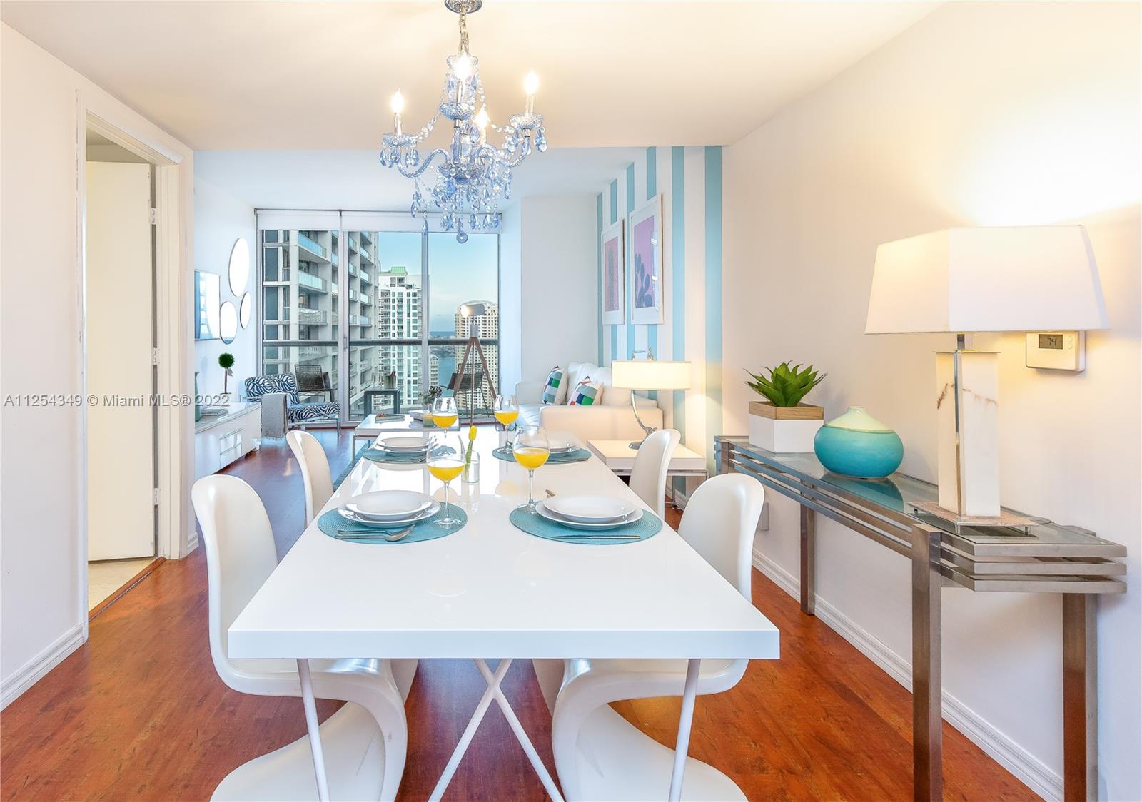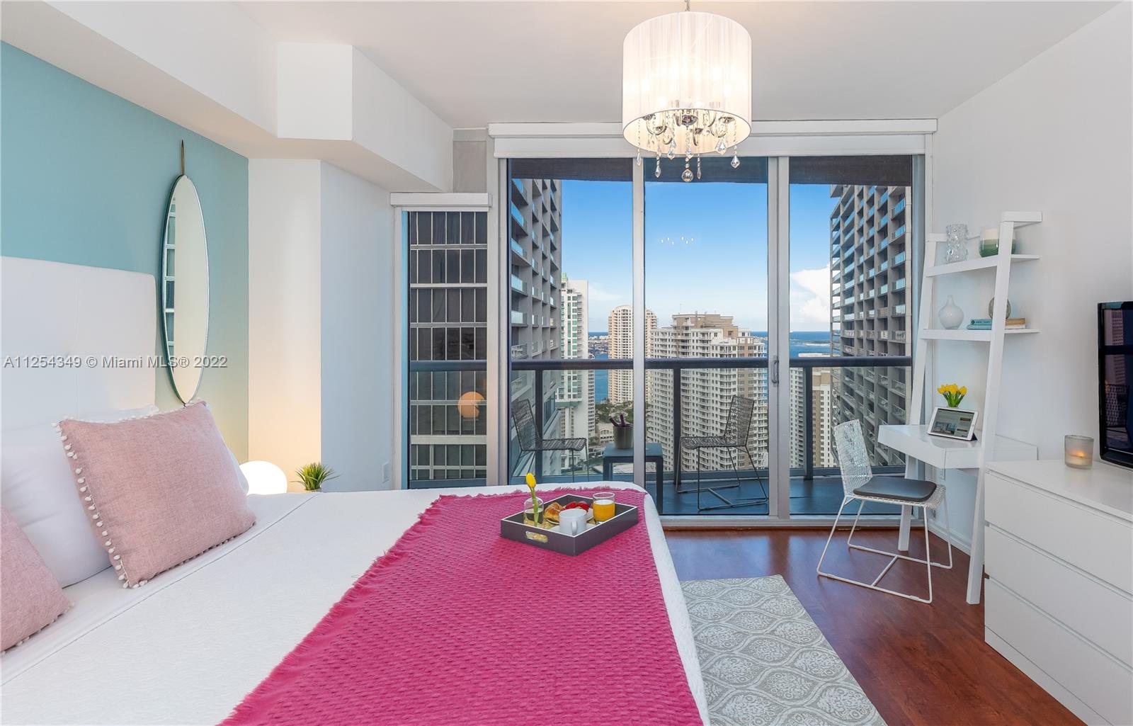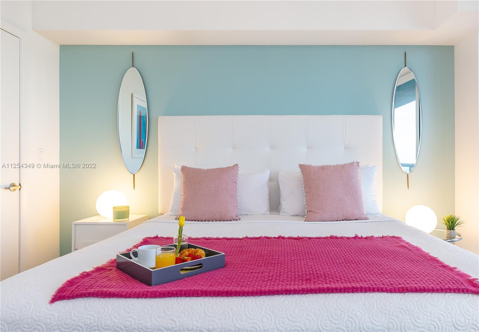 On a high floor, with views of the ocean, the 300-ft pool and Jacuzzi, and of Brickell Key, this gorgeous condo is fully furnished by an interior designer. It includes a queen-size sofa bed in the living room and is fully equipped, including its kitchen and walk-in closet, with two large TV sets, -one Smart, full-size washer/dryer, Italian cabinets, premium appliances by Wolf & Subzero and Bosch, as well as solid black granite counters. The luxurious Icon Brickell resort was designed by Philippe Starck, featuring a 28,000-square-foot spa, and fitness center, a 300-foot infinity pool (longest in Florida), overlooking the Bay, wet and dry saunas, a poolside bar, and a fireplace. It is surrounded by the Miami Circle National Historic Landmark, a small park, and the Miami River.