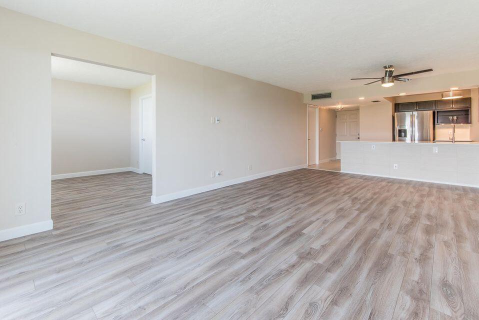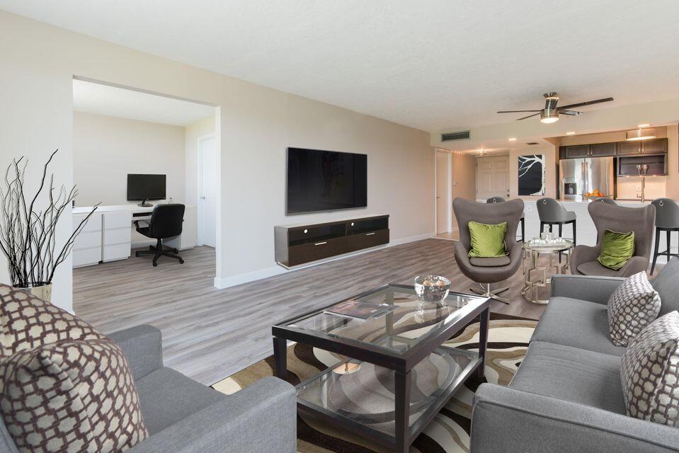 A Rare Diamond- Professionally Remodeled with High End Finishes. Top floor, corner unit. Dark wood cabinets, stainless steel appliances, full sized stacked washer/dryer, and beautiful quartz kitchen tops. Tankless hot water heater. Tile and Wood laminate floor throughout. White wood bathroom vanities with stunning granite tops. Contemporary tile in shower and bathtub. Frameless shower enclosures. Updated Closet systems. Window treatments throughout. The City of Boca Raton is working on plans to redevelop the Ocean Breeze Golf Club, creating magnificent views in your backyard! The building roof was recently installed and elevators are in the process of updating. Seller to pay elevator assessment.