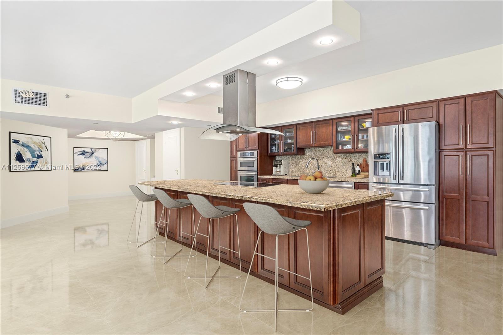Oceanfront gem in an unbeatable location with oversized terrace in Sunny Isles Beach. Atlantic views and ample natural light throughout this remodeled 3-bed, 3.5-bath residence spanning 2,970 sq. ft. The spacious, remodeled unit in “Florida’s Riviera” features an open-concept floor plan with the living room and main master suite opening up to an expansive wraparound terrace with views of the ocean. Custom kitchen boasts large center island with breakfast bar, stainless-steel appliances and wine fridge. Master bathroom with travertine, dual-sinks and large jacuzzi tub, while second master bedroom includes an office nook. Resort-style living at Oceania offers amenities such as beach access, fitness center, spa, tennis, basketball and racquetball courts, private marina, and more.