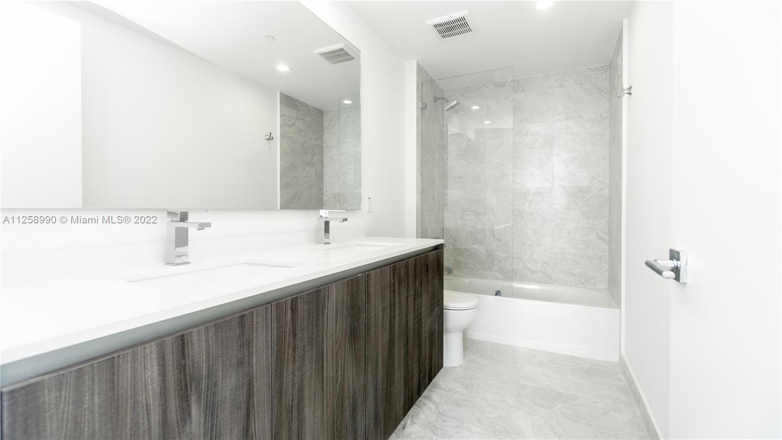 Impeccably clean and well maintained. Panoramic floor-to-ceiling windows in every room. Spacious open floor plan with 2 Beds/2.5 Baths on the 41st floor with a huge wraparound balcony. Kitchen has top of the line Bosch appliances, white quartz counters, touch activated faucet and European cabinetry. Large master bath with tub, shower, double sinks, and his/hers California closets. Building has beautiful amenities including 2 pools, children's pool, bay view jacuzzi, indoor/outdoor social rooms, game room, theater, gym, yoga studio, fire pit, BBQ, pool tables, spa/massage rooms, library, theater, teen lounge, kids play room, business center and 24hr valet. Pet friendly park across the street including tennis, volleyball, baseball, outdoor fitness and children’s playground on the waterfront.