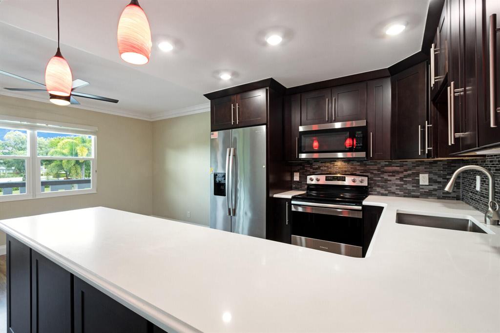 Well-appointed and freshly painted 2/2 apartment with long lake views is now available in renown Century Village! Fully renovated, this home is truly move-in ready and boasts tons of upgrades including custom kitchen w/ wood cabinetry, quartz counters, & SS appliances, impact windows and French doors, newer AC & newly cleaned ducts, new elec panel, tankless WH, luxury laminate floors w/ 6'' base, crown molding throughout, custom closet shelving and more! Home warranty available/transferable to new owners! Steps to the pool and BBQ and just a shuttle away from main clubhouse with world class amenities. 1 assigned parking space right in front of bldg, easy access to elevator. Laundry on each floor. Active 55+ community with endless clubs, excursions, and entertainment!