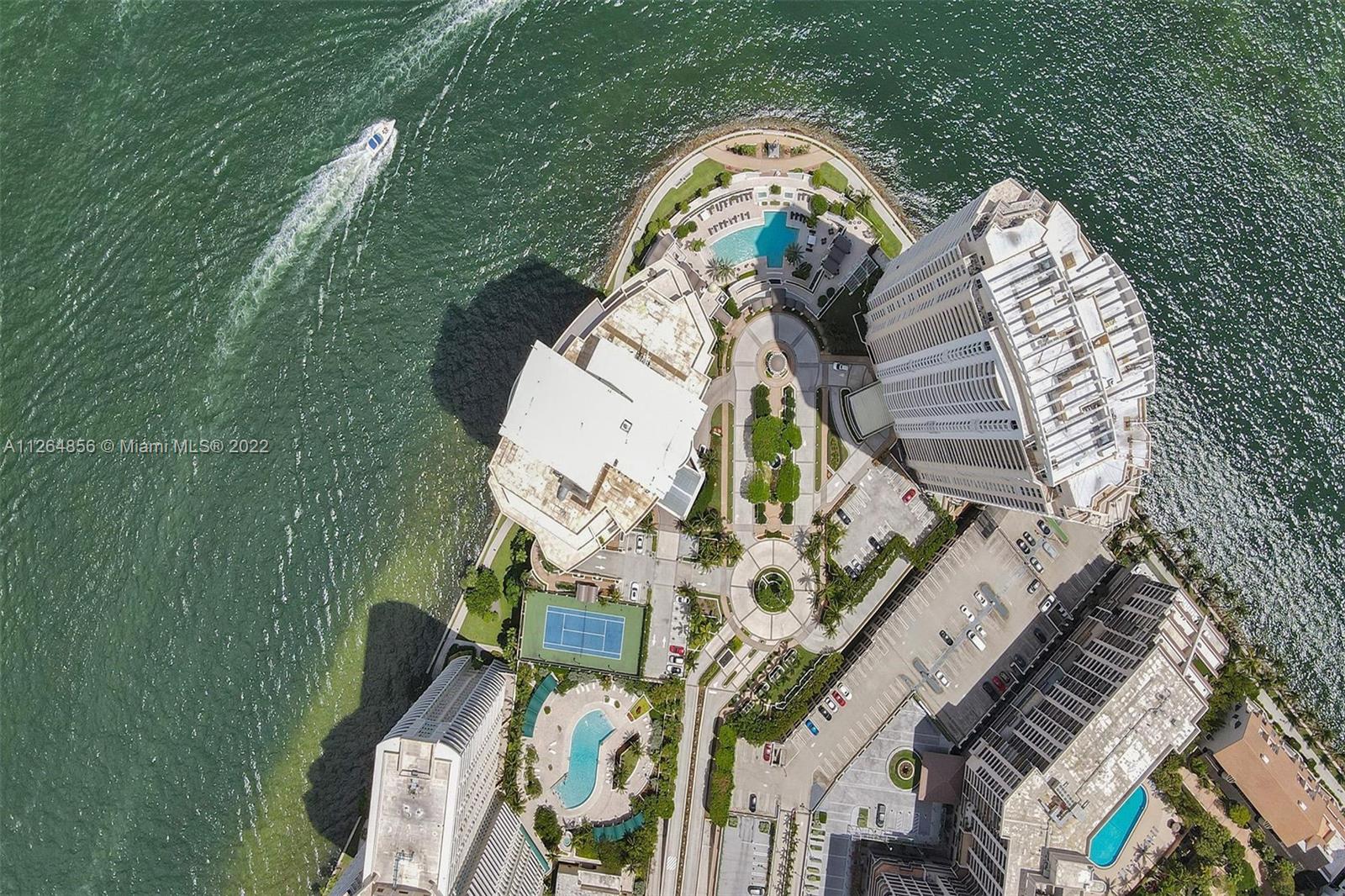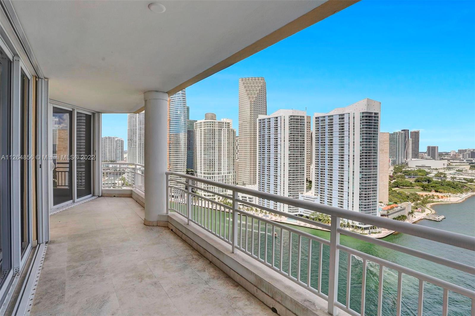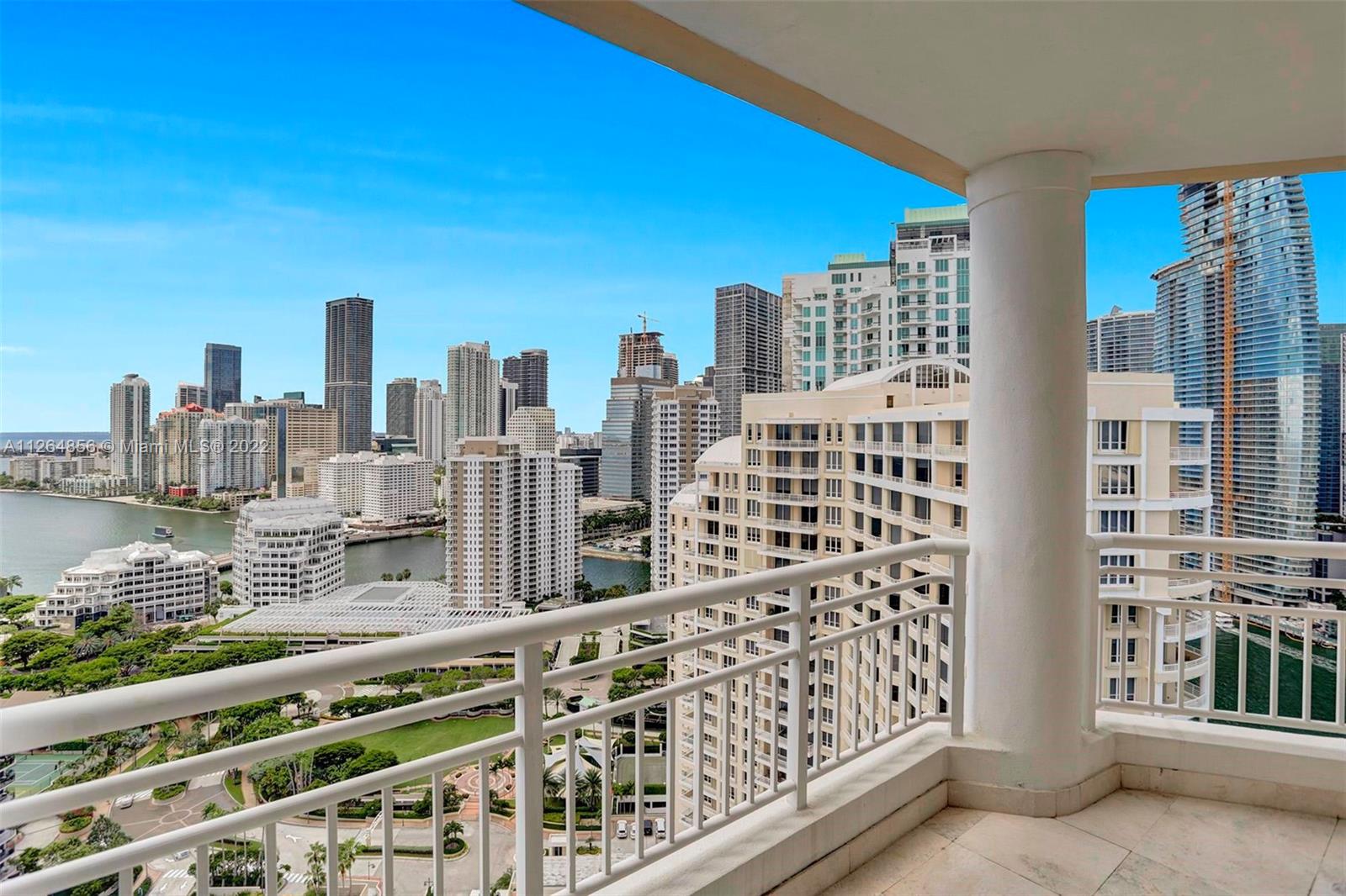 Extraordinary unobstructed views of the bay, river, and astonishing city lights from two wraparound huge balconies providing an 180 degree view. Do not miss out on this corner unit located at exclusive Brickell Key Island. With a well-designed split-floor plan and full of light, this unit provides a unique North and Southwest exposure. Only 6 apartments and 4 elevators per floor. Marble and wood floors, ss appliances, custom closets, laundry area, 2 side by side parking spaces and a storage area. Impact windows and shutters. Unit in excellent condition, ready to move in. Resort-style amenities, including a two-story, fully-equipped fitness center; a bay front pool; a bbq area; tennis, squash, and racquetball courts; a business center; concierge and valet parking services. Easy to show.