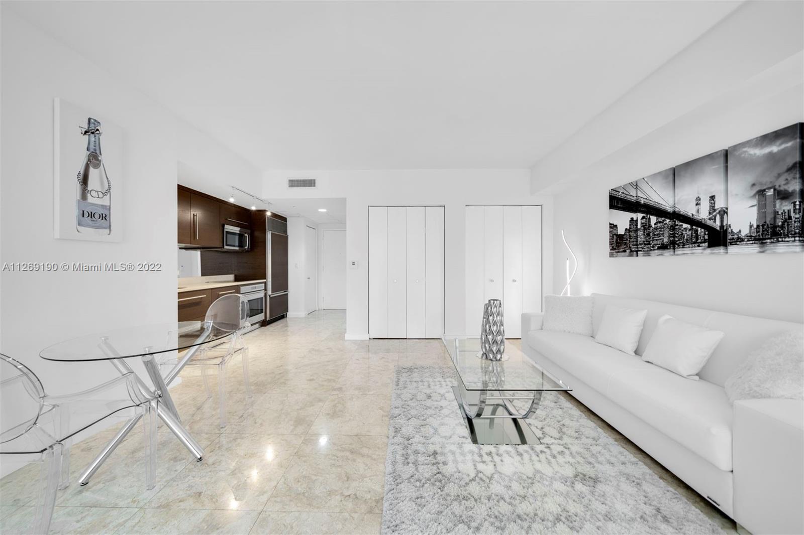 A turnkey furnished studio at Icon Brickell Tower 1 with marble flooring throughout, built-in closet cabinetry, stainless steel kitchen appliances, an in-unit washer/dryer, floor-to-ceiling glass windows, and a private balcony. Includes one assigned parking space. Condo dues cover internet, cable TV, and water. Building amenities include a 300-foot-long swimming pool, a 50-person hot tub, three on-site restaurants, a full-service concierge, 24-hour valet parking service, a 28,000-square-foot spa and fitness center, a movie theater, and game room. Rented through December 1, 2022 at $3,000 per month.