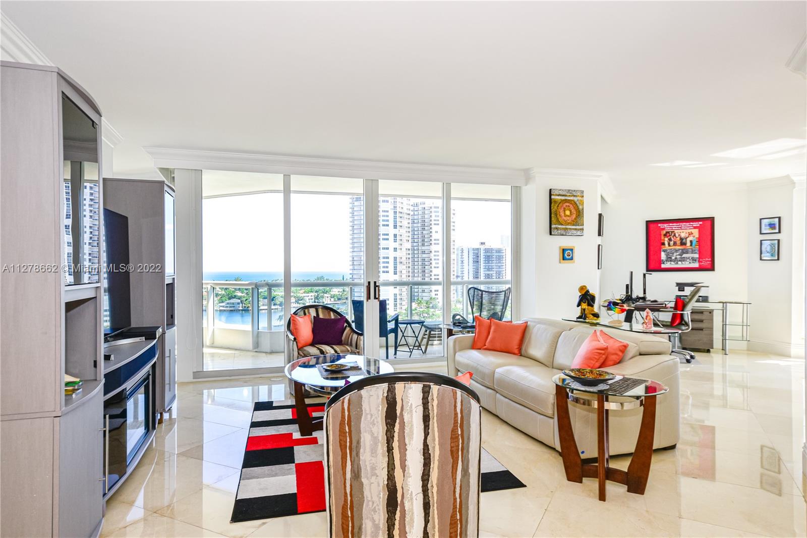 Beautiful 3/2 condo at the South Tower at The Point in Aventura w/water and city views. 1,865 sq ft split floor plan, marble and wood floors. Master w/en-suite bathroom, double sinks, jacuzzi tub, glass shower, Walk-in closet. Guest bedroom has private balcony, walk-in closet. 3rd bedroom is open but can be enclosed easily. Full size wash/dryer in unit. Accordion shutters. 2 covered parking spaces, air conditioned storage unit, AC and water heater new from 2019. Resort style amenities: 3 pools (1 w/salt water) , BBQ area, 4 tennis courts, 25,000 sq ft spa and fitness center, steam room, massage room, barber, beauty salon, kid’s playground, library, on site cafe, 24 hr valet, concierge and security. HOA includes Cable TV, Wifi, Building insurance and Water. No rent 1st yr ownership.