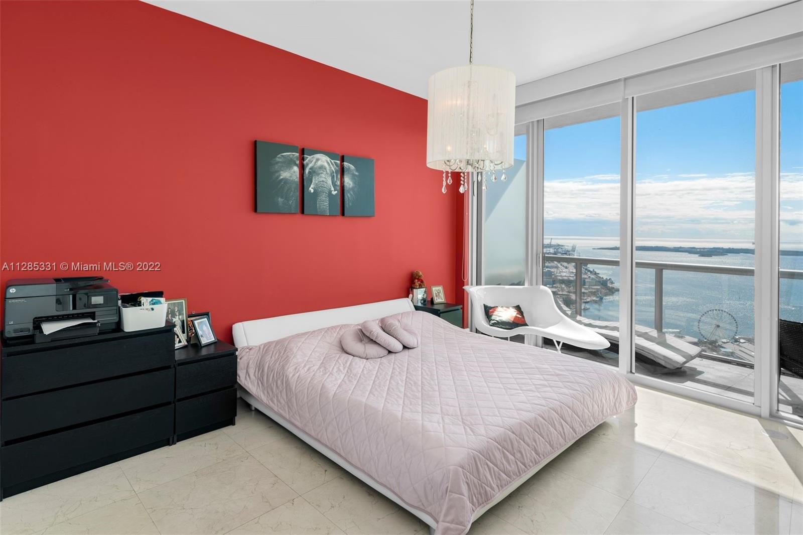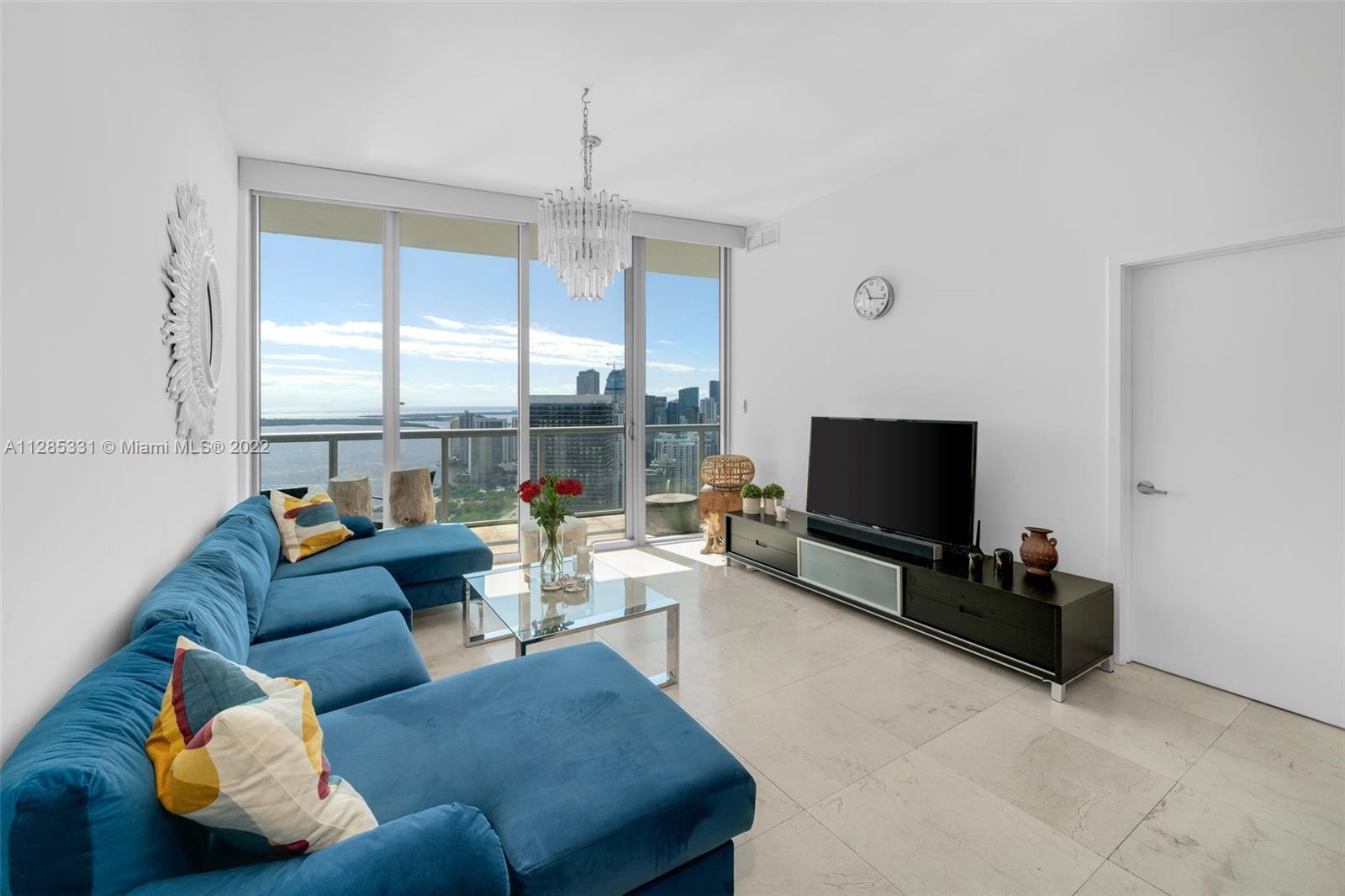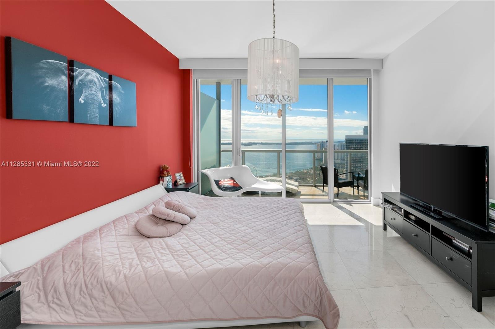 A magnificent, split 2-bedroom residence at MarinaBlue w/ 2.5 baths; marble flooring throughout; motorized shades; large, custom-built closets in both bedrooms; brand new air conditioning unit; stainless steel kitchen appliances; & 10-foot-high ceilings w/ floor-to-ceiling glass windows offering awe-inspiring, panoramic views of the Atlantic Ocean, Biscayne Bay, & Downtown Miami skyline from the 55th floor. Very unique floor plan; only 5 of its kind in the entire building. Both bedrooms have balcony access & direct water views. Includes 1 assigned parking space & 1 assigned storage cage. Building amenities include 2 swimming pools (sunrise & sunset), whirlpool hot tub, fitness center, business center w/ conference room, 24-hour valet parking, sand volleyball court, party room & BBQ grills.