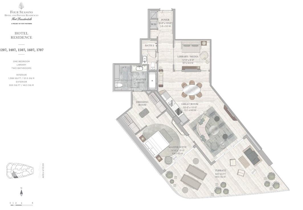 BRAND NEW FOUR SEASONS TURN KEY FURNISHED RESIDENCES, Seventeenth floor, hotel residence with 1 bedroom and Den(2nd sleeping area), 2 full baths and a southeastern exposure with direct ocean views. Dramatic floor to ceiling glass and gracious open terraces afford you ample natural light throughout the home. Gourmet kitchen with custom lacquered cabinetry, Sub Zero and Wolf appliances. Abundant closet space throughout this luxury residence. Baths are adorned with signature marble, custom oak cabinetry, and brushed nickel Waterworks fittings. Seamless/capless glass rails maximize your unobstructed views of the ocean.