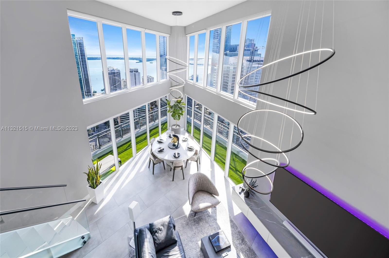 This astonishing and visually dramatic two story residence at Infinity at Brickell is a one of a kind corner unit just remodeled in 2022. Floating 36 floors up on the south east corner with expansive views of the bay, ocean and the city. This unit will wow you from the very entrance with the double height ceilings and floor to ceiling glass windows that make you feel like you are in the clouds. This 2,415 sq ft 3 bedroom, 3.5 bathroom features custom floating staircase, Architectural Lightning, floating vanities, luxury toilets, custom closet cabinetry, and more. Building amenities include: pool, jacuzzi, sauna, steam room, bike storage, 24hr security, concierge, valet parking, and a cafe´/market in the lobby. Enjoy walking to everything Brickell has to offer.