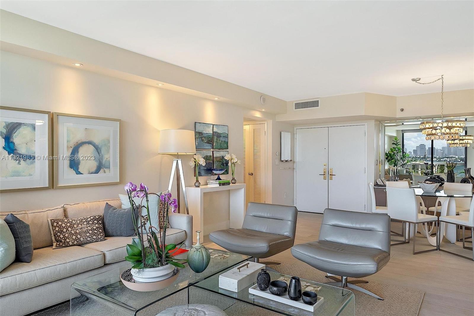 Spectacular direct bay & skyline views create a dramatic, ever-changing backdrop for gracious living in this fully remodeled home with a relaxed, sophisticated coastal vibe. The 20-foot long balcony, accessible from the living room, guest bedroom & kitchen, is great for entertaining or just watching the world go by. The eat-in kitchen features a large bar open to the living room, stainless appliances & lots of storage & counter space. Floor to ceiling windows with designer window treatments in all rooms. The spacious primary bedroom has a walk-in closet with custom built ins, a separate makeup/office area & huge ensuite with soaking tub, glass shower & dual sinks. Luxury building with the most amenities & best pool on Belle Isle. Must see to appreciate. Click on virtual tour for video.