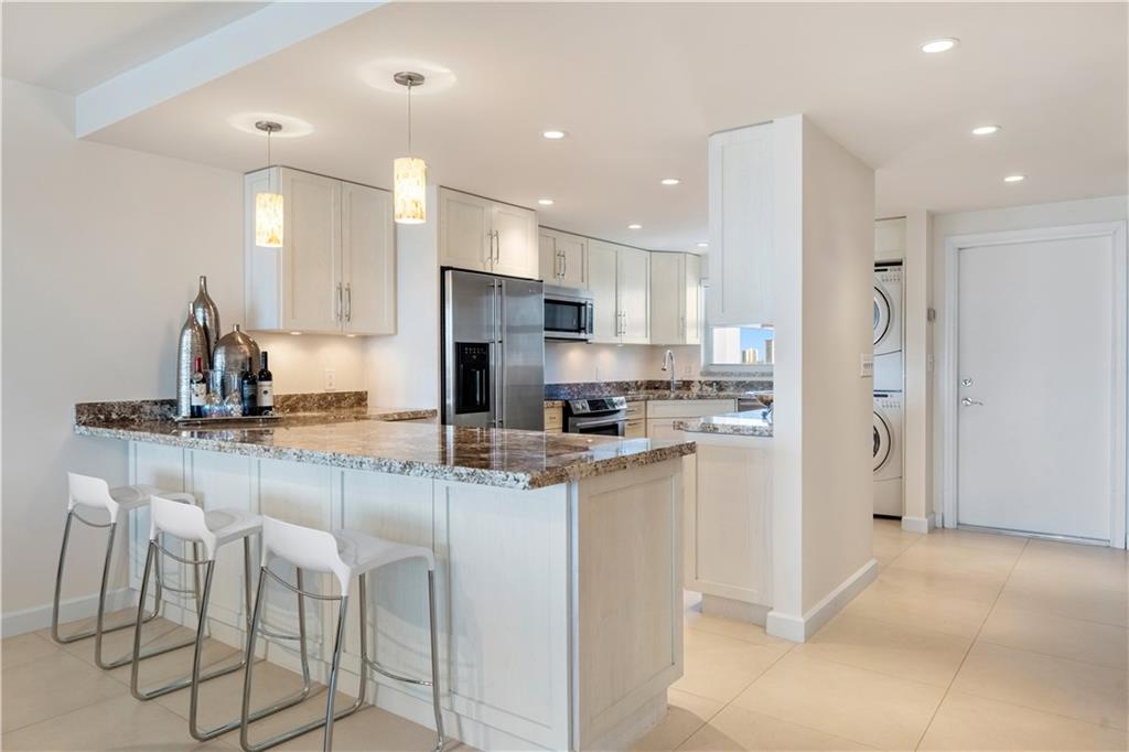 DIRECT UNOBSTRUCTED INTRACOASTAL VIEWS! COMPLETELY RENOVATED WITH A MODERN COASTAL FEEL! AN ABSOLUTE MUST SEE! OPEN AND BRIGHT WITH SPACIOUS LIVING AND DINING, TWO MASTER SUITES, BUILT IN WALK-IN CLOSETS, OPEN EXPANDED KITCHEN, SOLID WOOD CABINETS, GRANITE COUNTER TOPS, STAINLESS STEEL APPLIANCES, WINE COOLER, TILE FLOORS THROUGHOUT, MOTERIZED WINDOW TREATMENTS, CUSTOM LIGHTING, IMPACT WINDOWS AND DOORS, FULL-SIZE FRONT-LOADING WASHER AND DRYER, 3 CEILING FANS, SPA BATHS, LARGE COVERED BALCONY OVERLOOKING THE INTRACOASTAL WATERWAY. COVERED GARAGE PARKING SPACE AND AMPLE GUEST PARKING. AMENITIES INCLUDE HEATED POOL, BBQ-GRILL, GYM, BILLIARDS, COMMUNITY ROOM AND MORE. CLOSE TO BEACH, RESTAURANTS, FINE DINING AND SHOPPING.