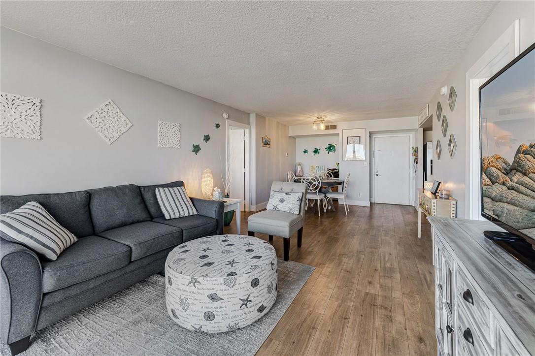 UPDATED PRICE! This 2 bed/2 bath move in ready across from the beach with beach access. No detail missed in this property, updated bathrooms, updated kitchen, stainless appliances, newer water heater, (2) barn doors in the guest room, all carpeting has been removed, popcorn ceilings have been removed, Covered parking spot, with 3 complete outdoor kitchens by the heated pool(s). Enjoy the workout area, sauna, bocce court, join the pickleball club, tennis and or relax at one of the two heated pools. Watch the Holiday fireworks or boat parade from your balcony, come and see, this property will not last long!