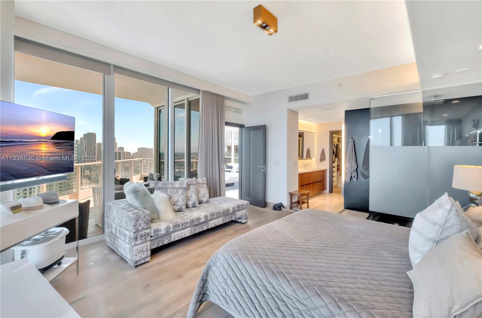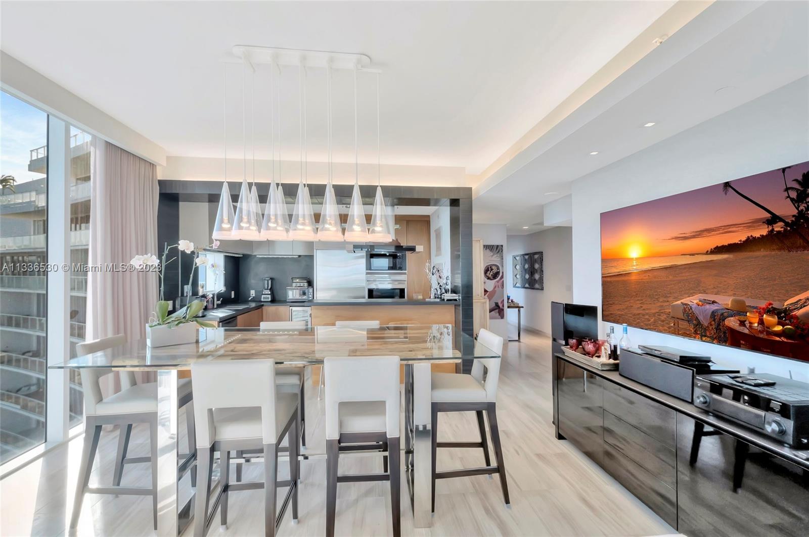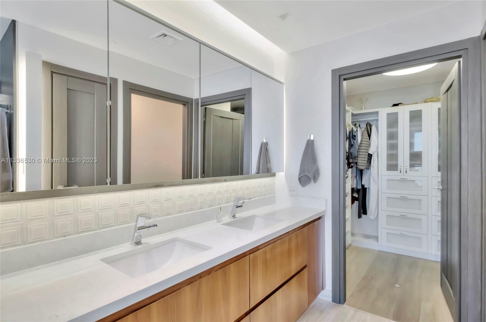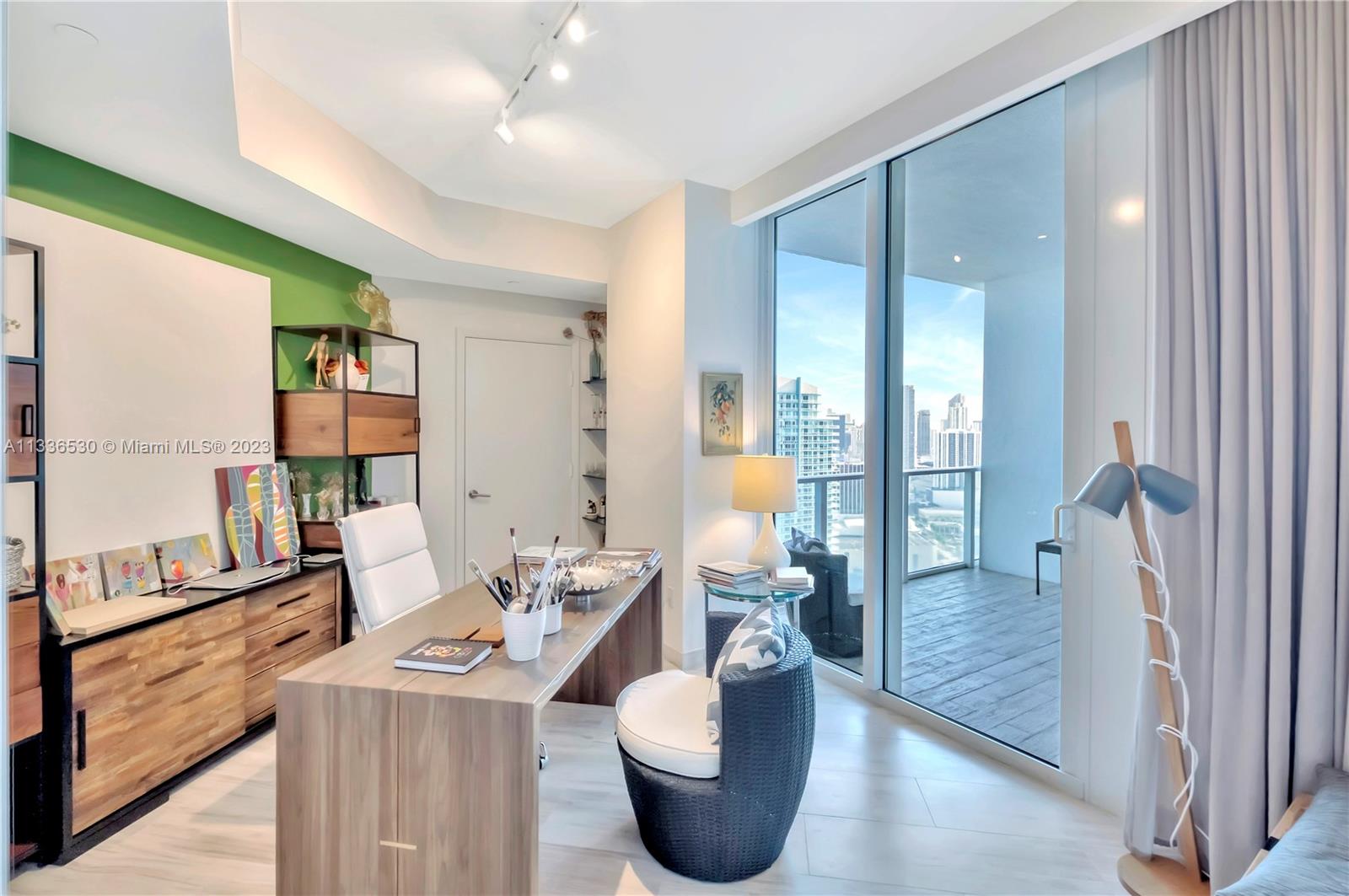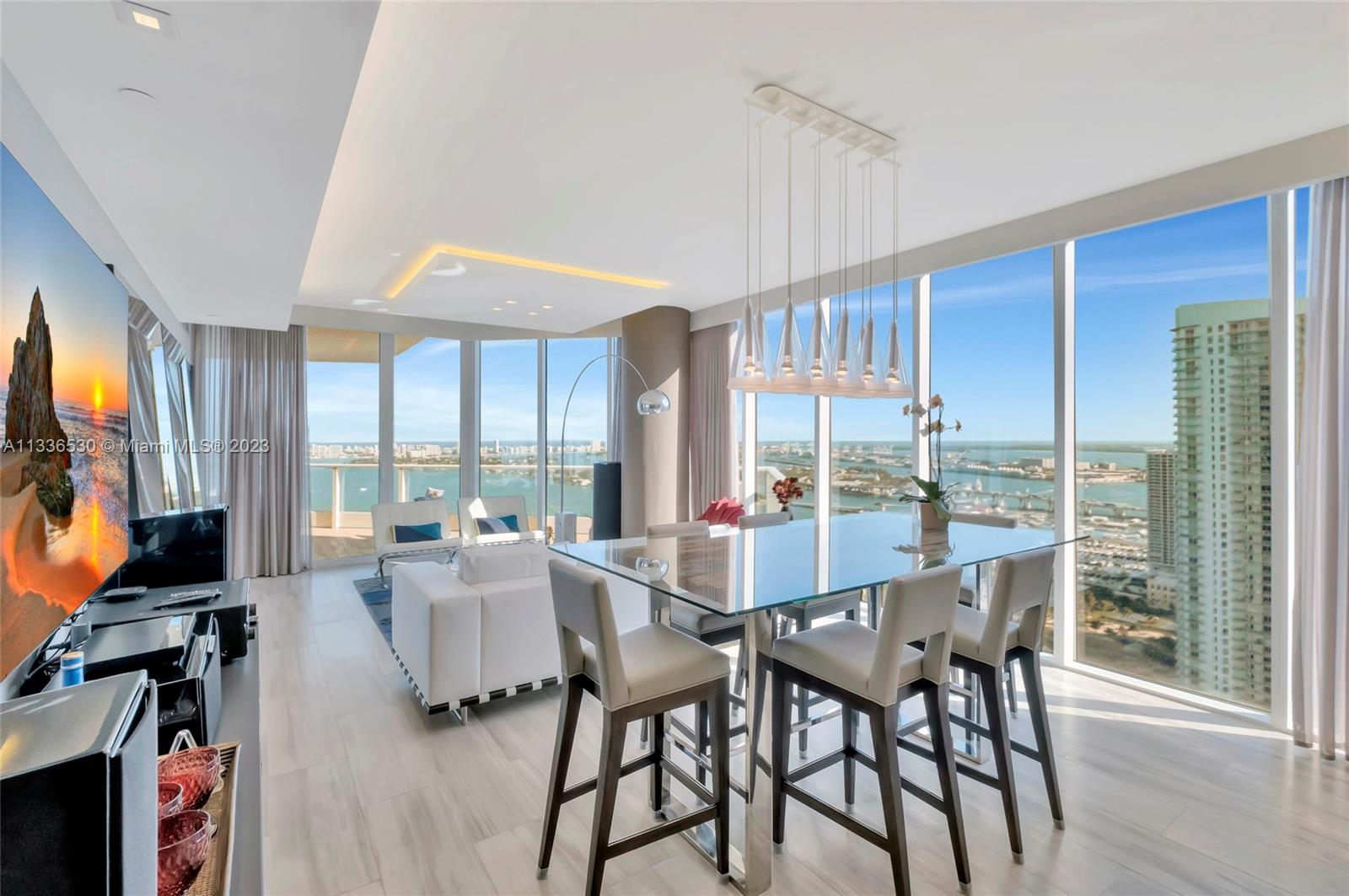 One-of-a-kind home on the most sought after line in Paramount Bay. This 3 bedroom, 3 1/2 baths + Den has a redesigned kitchen with stainless steel appliances, wine cooler and subzero refrigerator. Private elevator foyer, 10ft ceilings, custom lighting and custom doors, guest’s bedrooms with en-suite baths and built-in closets. Flow through floor plan with endless views of Biscayne Bay and Atlantic Ocean to the east and Miami skyline and sunset views to the west. Paramount Bay is a resort like building with common areas designed by Lenny Kravitz. It features 2 pools (sunrise and sunset), fitness center, sauna, steam room, movie theater, clubroom with fully equipped kitchen, children’s playroom, 24 hr valet service and much more. Dining area chandelier is not included in the sale price.