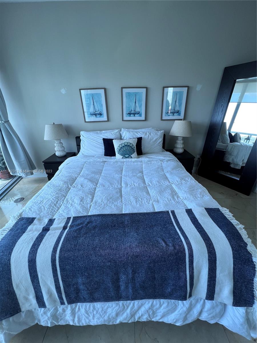 Bayfront corner large 1327 SF 2/2 @ Marina Blue w/wrap around floor to ceiling windows & marble flooring throughout; remodeled baths, window shades; large custom-built closets in both bedrooms; stainless steel kitchen appliances; high ceilings + 145 SF balcony offering panoramic views of Biscayne Bay, Museum Parks & Miami Skyline. Private open split bedroom floor plan. 1 assigned parking & 1 storage space. Bldg. has 2 swimming pools (sunrise & sunset), Whirlpool hot tub, fitness ctr., biz. ctr. w/conf. room, 24-hour valet parking, sand volleyball court, party room & BBQ grills. Unit may be rented immediately & up to 3 times/yr. & current tenant willing to stay on. Also available turnkey furnished.