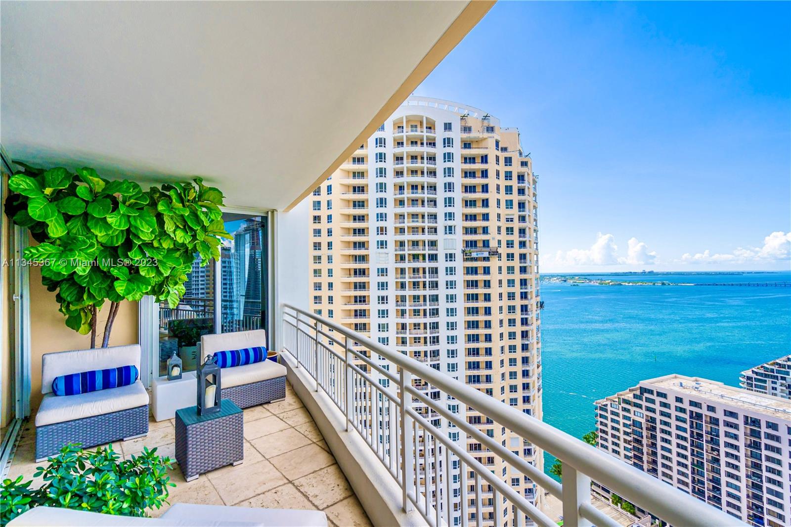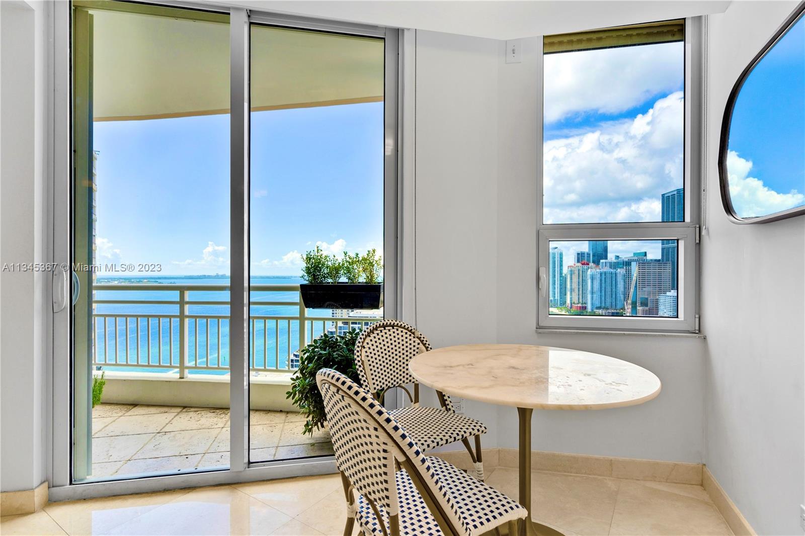 Upscale condo with amazing bay and city views from 30 floor unit. Two bedrooms both with ensuite bathrooms, powder room, modern kitchen with quarter countertops, polished marble floors, laundry, views from every room and large terrace for entertainment. Elegant lobby, concierge, business center, and free valet parking for guests. Relax and swim laps in resort- like pool, BBQ grills, and state of the art gym with basketball, racquetball, tennis courts. Bike Storage. Brickell Key is home to Mandarin Oriental and the unit is an easy walk to Brickell City center and many restaurants.