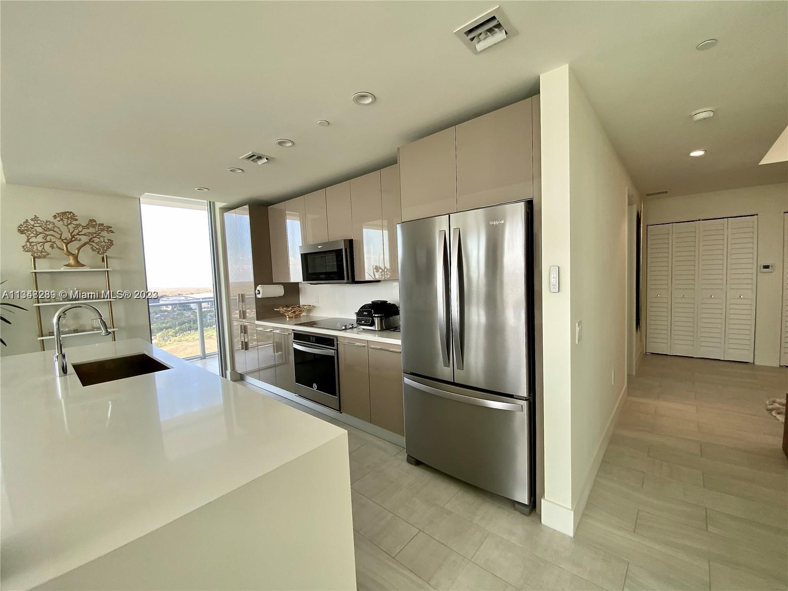 Corner residence with a wonderful skyline views and wraparound balcony, The Condo was modeled into a Contemporary style with an Open Floor Plan, Open Kitchen with White Quartz Counters and New Stainless Steel Appliances, Panoramic View, Fully Porcelain floors including the balcony which was perfectly cut to suit the apartment, Electric blinds, 2 Bedroom + Den, 2.5 Baths, Doble Storage, two parking spaces deeded, Resort Style amenities include state of the art gym, spa, sauna, and steam. Movie theater, club room, event space, kid's playroom, business center, infinity edge pool,Jacuzzi, summer kitchen, life-sized board games, tennis courts, and more. Secured lobby, 24hr security, valet parking.