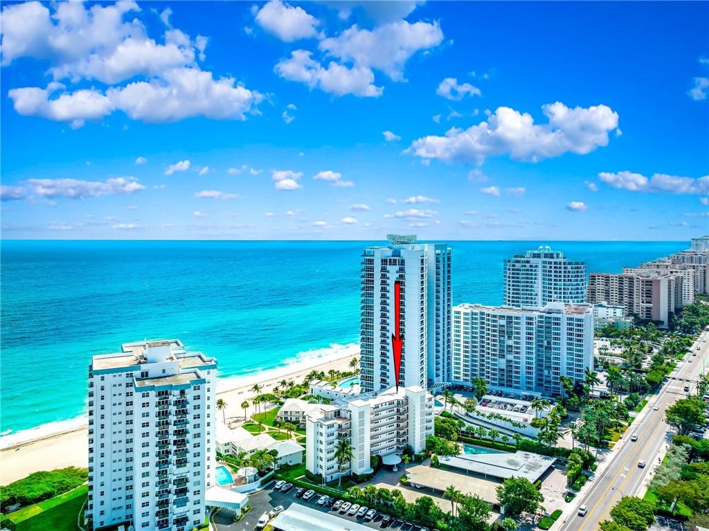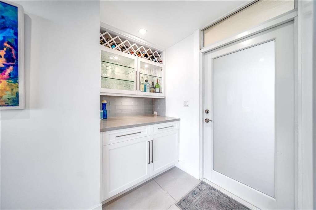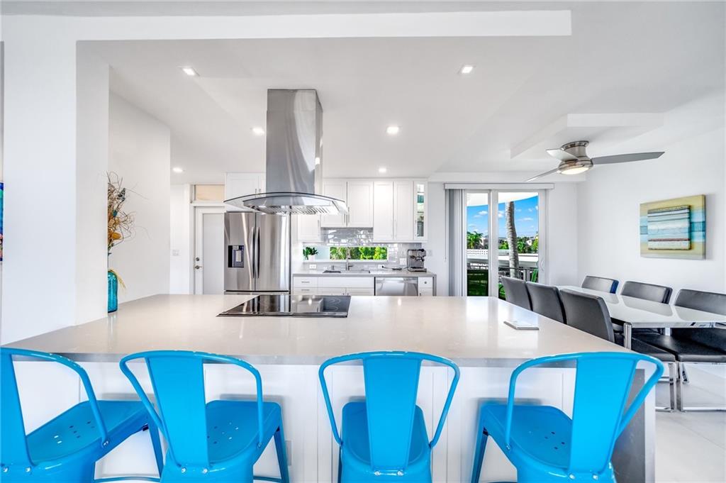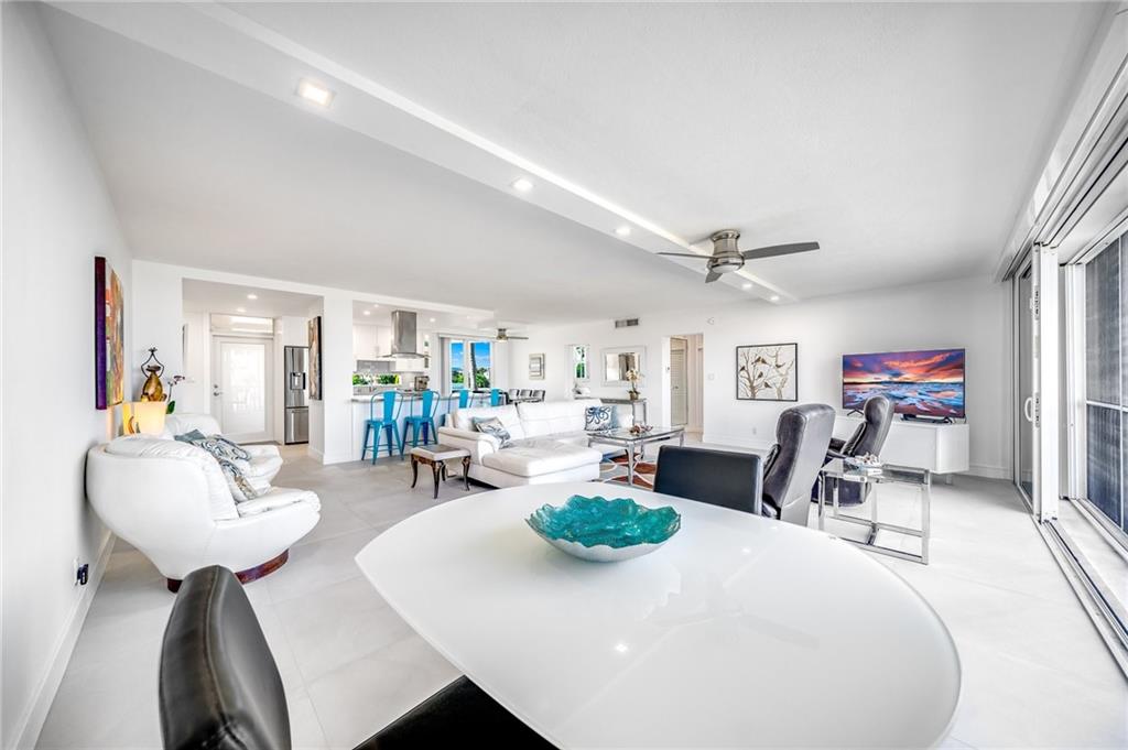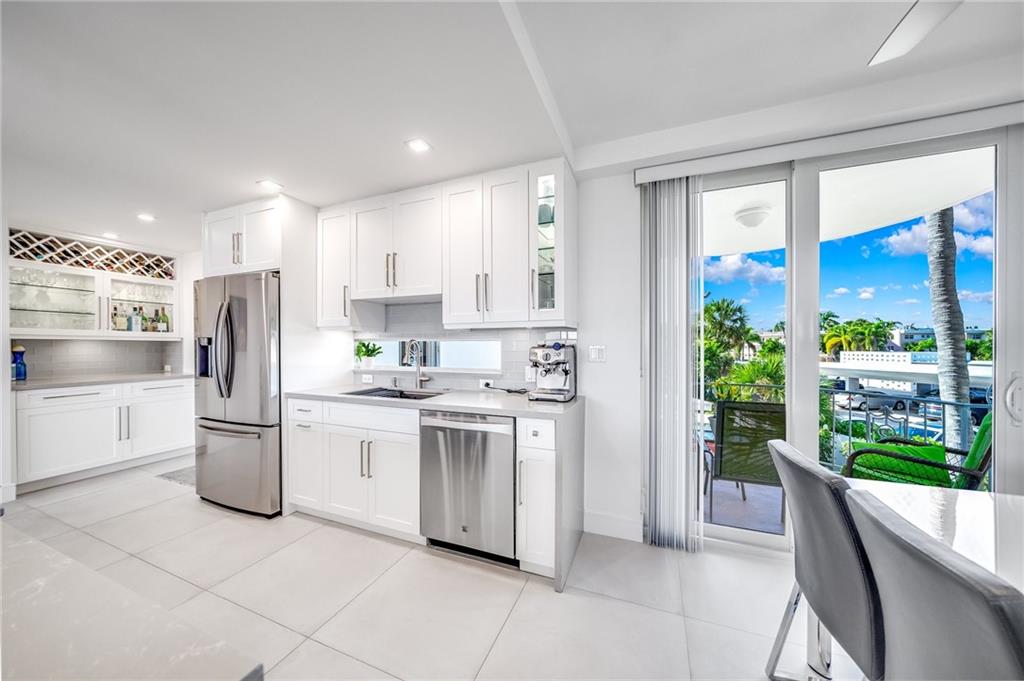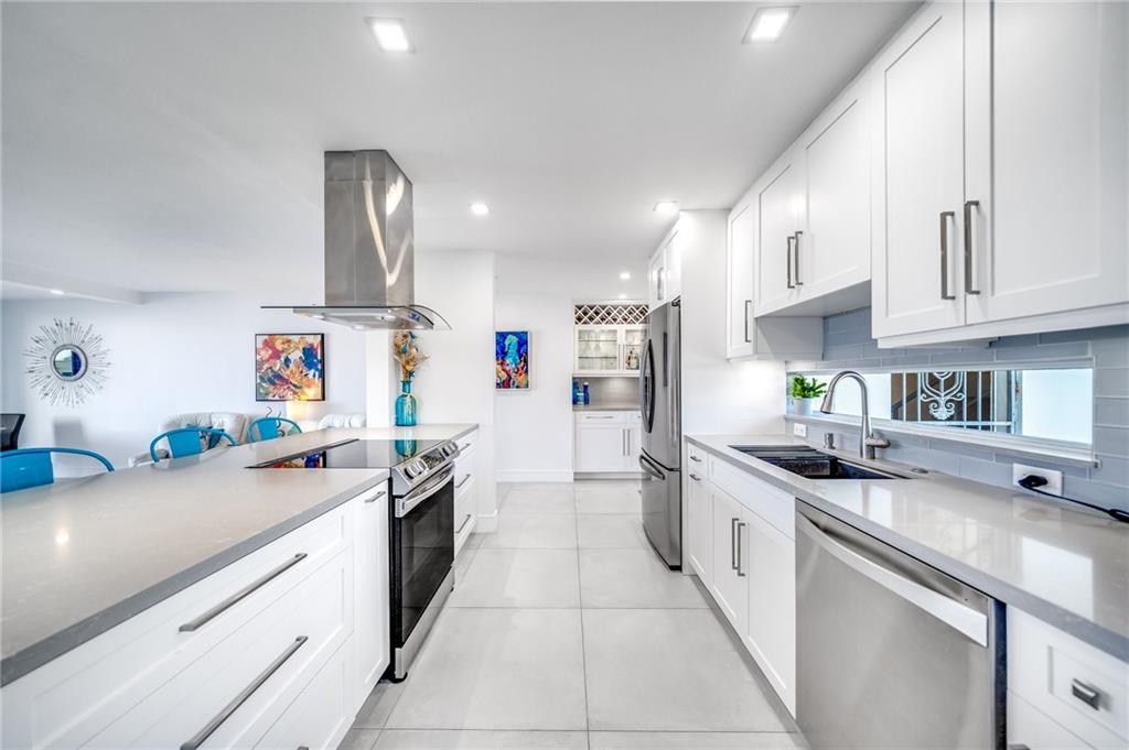 Paradise Perfected. This 2 bedroom, each with an ensuite bathroom and walk-in closet, features an open living area with amazing direct views of the ocean! This unit was renovated in 2022 and includes rectified 32" floor tiles throughout, new kitchen cabinets & quartz countertops as well as a designated bar area with wine rack. The a/c was replaced in 2022 as well as the electrical panel, tankless water heater, and new shut-off water valves. The fridge, stove, dishwasher and exhaust are all 2 years old. The unique vintage mid-century restored bathrooms add to the overall quality comfort of this spacious and bright end unit. Impact windows and doors throughout as well as remote controlled blinds reveal a full-wall of sliding glass doors to enjoy your morning coffee with stunning ocean views.