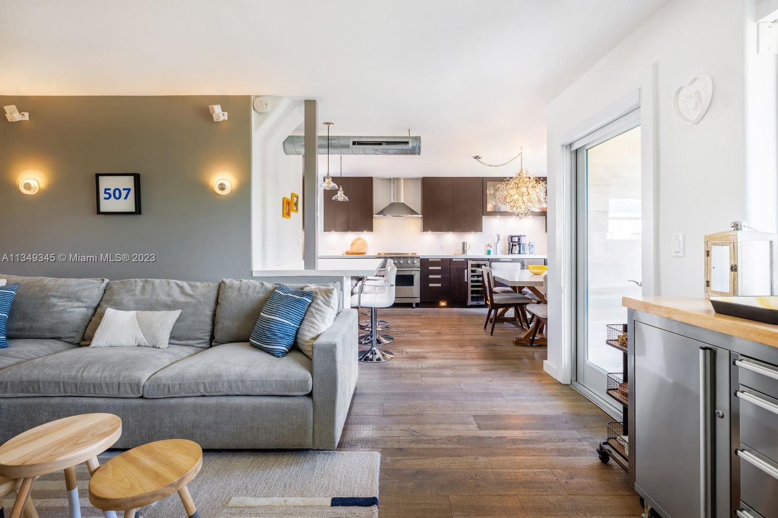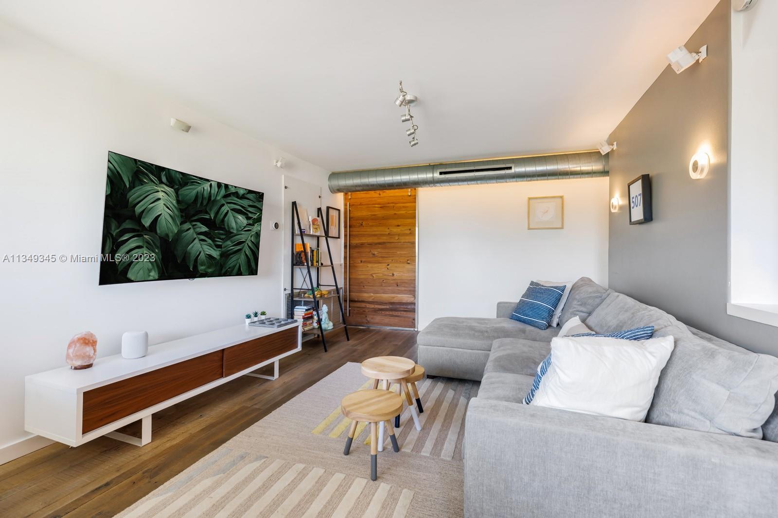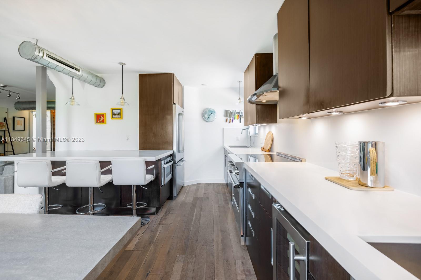 Boutique, industrial-modern renovated 2 bed / 2 bath corner unit with large balcony overlooking the park. Only two blocks to the beach and in the heart of the SOFI neighborhood of high end shops/restaurants. Chef's kitchen with dual sinks, Viking oven, Fisher & Paykel dual dishwashers, new bar ice maker, and new drawer microwave. Hurricane impact windows/doors, washer/dryer and a new tankless water heater. High-end jacuzzi hydro tub and both baths with remote bidet systems. Condo has 16 units in the building and a secured parking space. The imported tongue-and-groove reclaimed hardwood floors and well appointed furnishings make this a rare find in Southpointe's South Beach area.