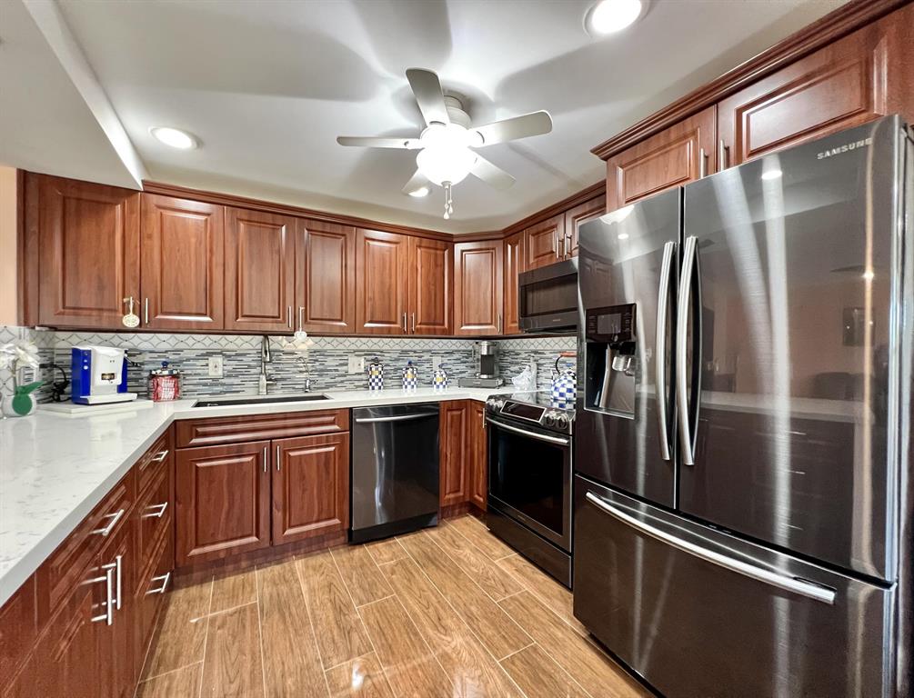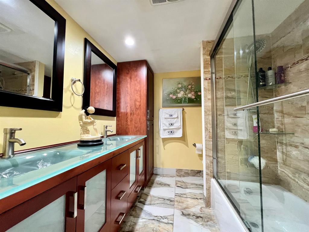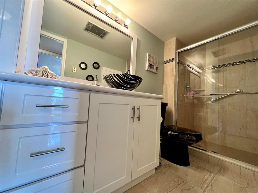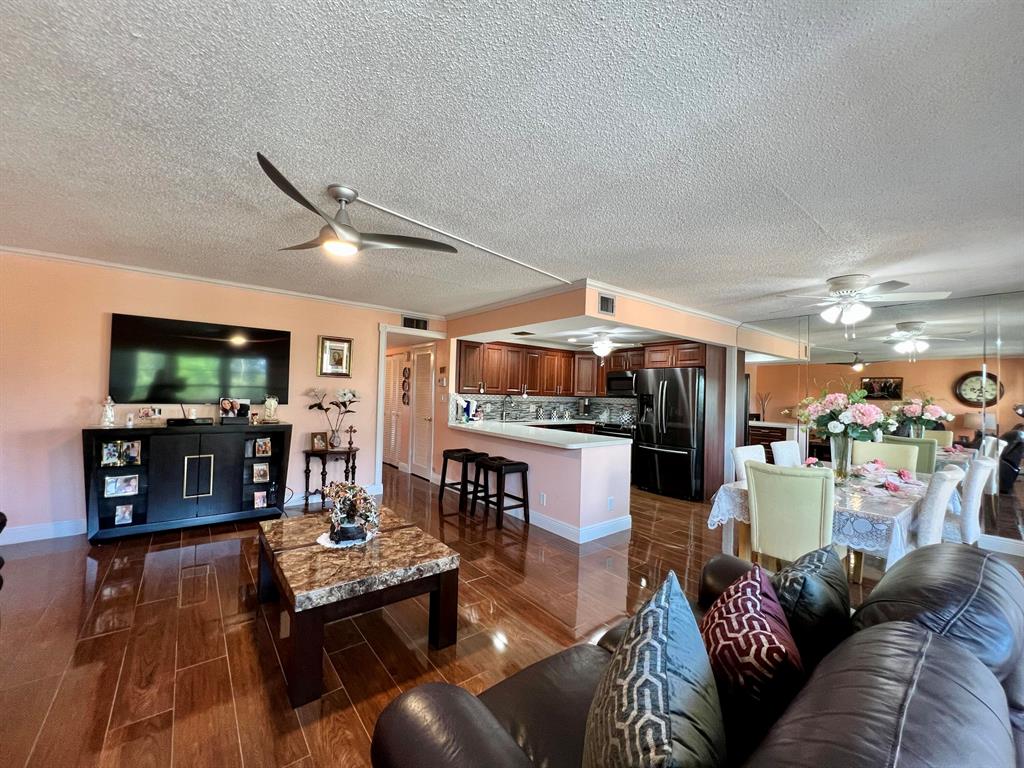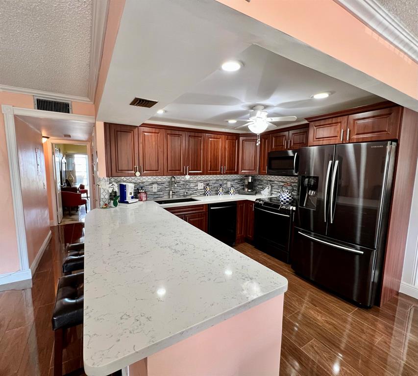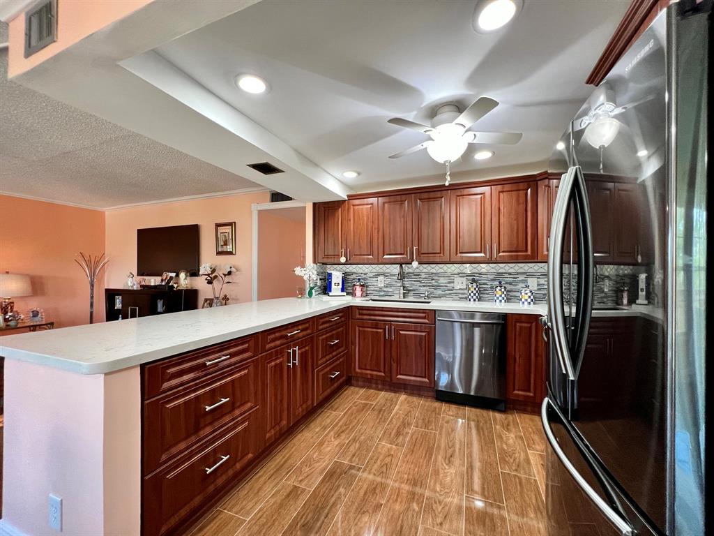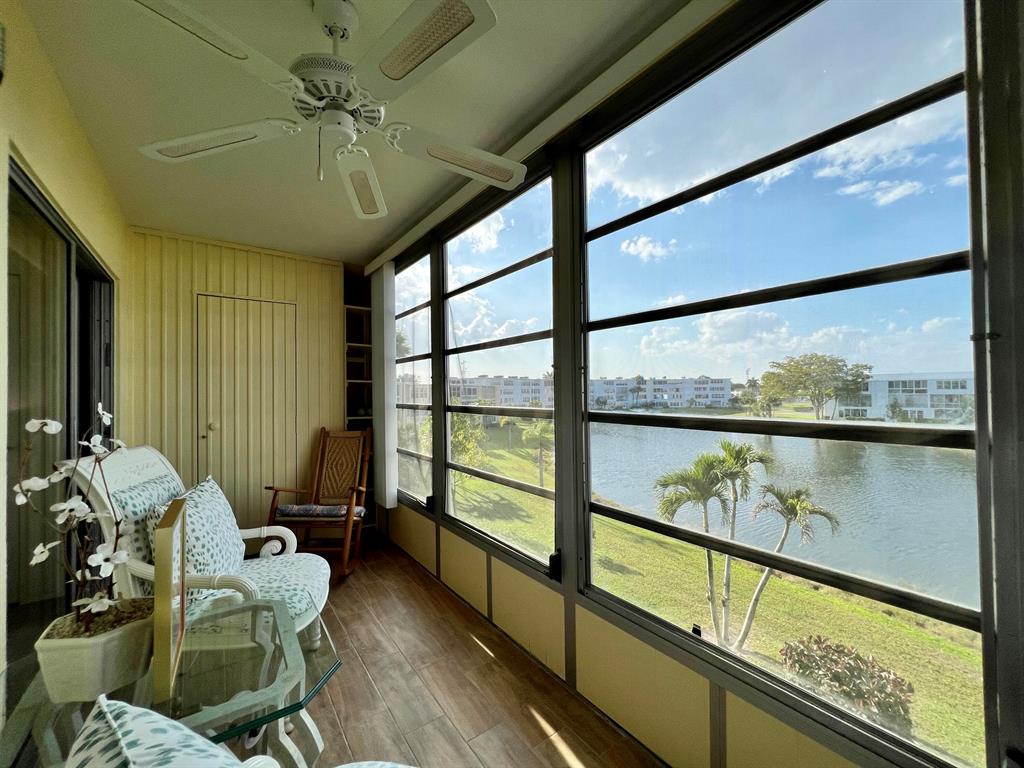 Stunning Entertainers Dream With Pretty Water Views In the Desirable Wellington Section of 55+ Century Village! Open Living Area With Gleaming Wood Look Tile Floors. Gorgeous Updated & Open Kitchen with Lots of Cabinets, Expanse Counters, Designer Tile Backsplash, Black Stainless Appliance Package (Smooth Top Range, French Door Refrigerator, Dishwasher, and Microwave). Two Updated Full Bathrooms. Spacious Bedroom Suite With Water Views, Marble Flooring, Walk-in Closet, and Updated Full Ensuite Bath. Enclosed Lanai Offers Extra Living Space & Pretty Water Views. Updated Front Hurricane Impact Windows. Sold AS IS & Furnished. Wellington L Is A Luxury Building With An Elevator, Extra Storage For Each Unit, Trash Chutes, and a Lovely Resident Patio with Grill. Century Village is a 55+...