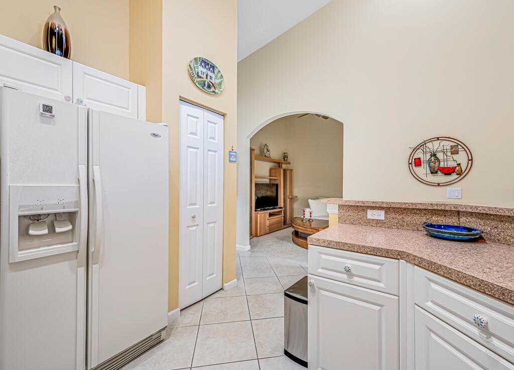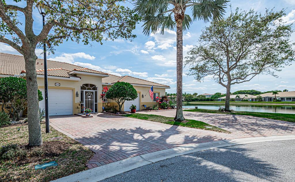 Wow! Beautiful villa overlooking the lake. Impeccable taste shows with the sunny, inviting decor of this cute villa. Super clean, gently used home owned by snowbirds. As soon as you walk in the door you are greeted by the amazing lake view. This 2 bedrooms, 2 bathrooms and a den/flex space, nice kitchen, light, bright colors make this home feel like a coastal beach house. AC is 2019, hot water heater 2022, accordion shutters, beautiful glass etched front door, upgraded diagonal tile, kitchen cabinets and newer ceiling fans and custom master closet. HOA fee includes high speed internet, premium cable channels, ADT home alarm and phone, exterior paint, lawn maintenance, pressure washing, recently mulched and use of all the amenities, which include resistance pool, family pool