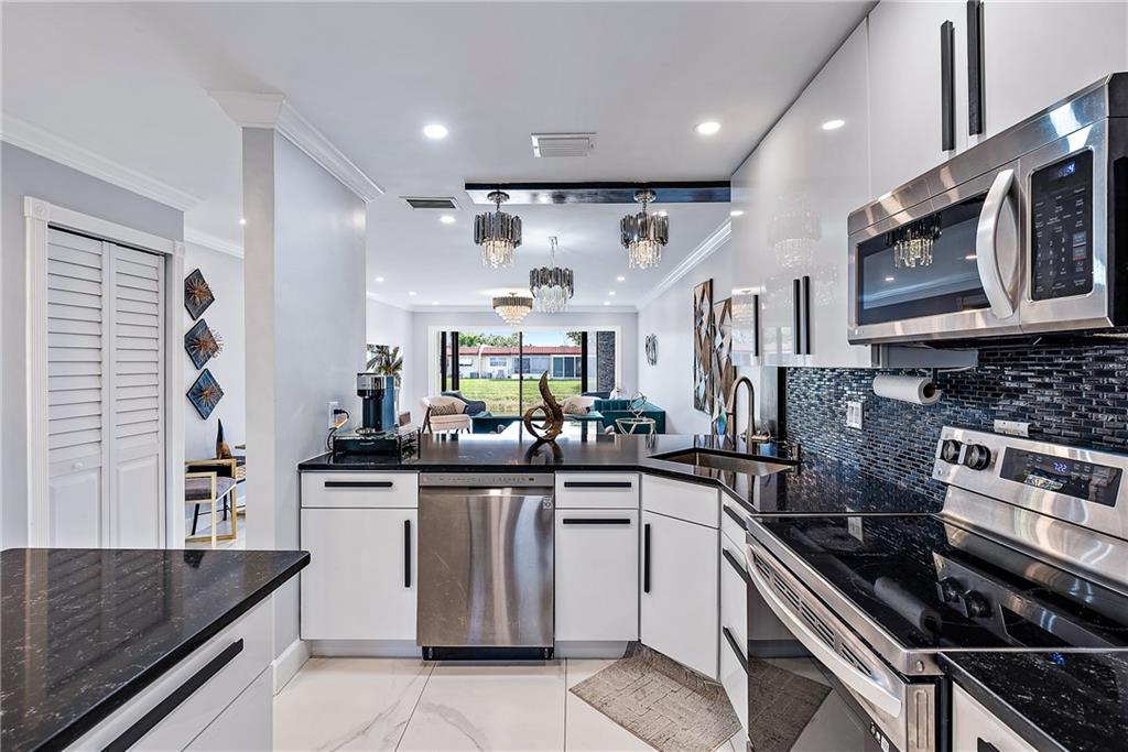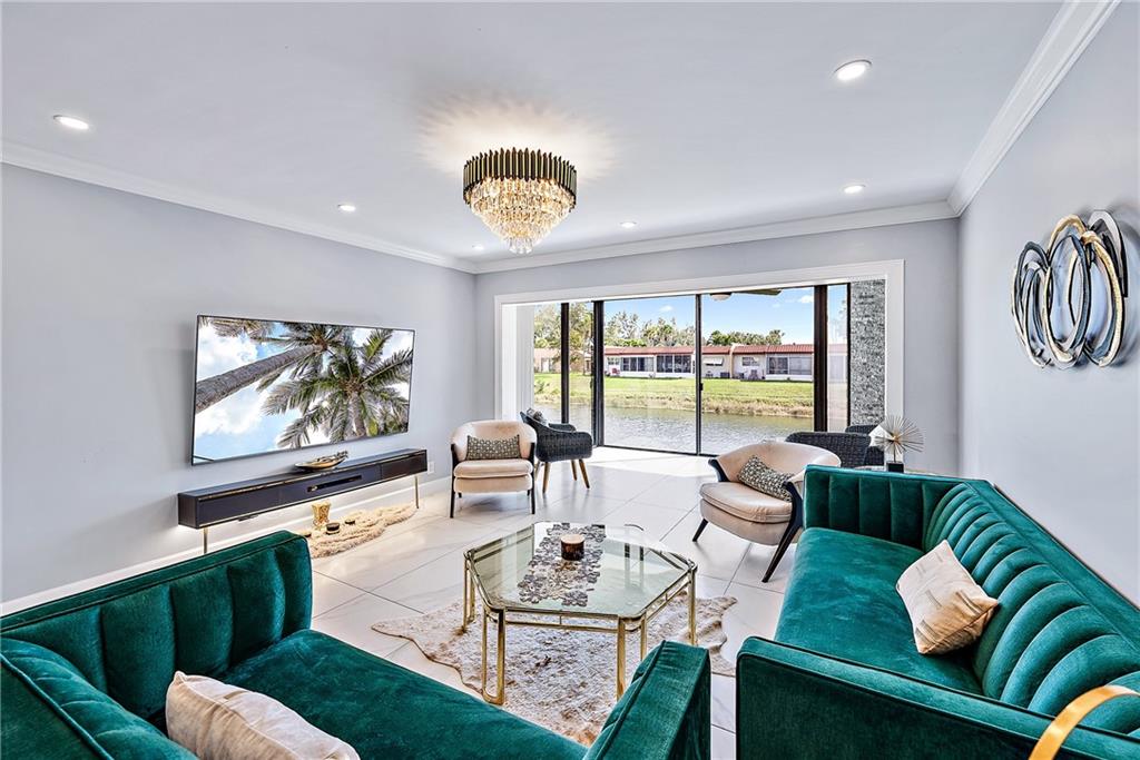 Seller Motivated! This completely renovated ground floor villa overlooking the lake is ready for its next owner! The seller spared no expense, stunning open kitchen with white cabinets to the ceiling, pantry with pull out drawers, granite countertops, stainless steel appliances & beautiful view of the lake from the living area & primary bedroom. Both bathrooms fully renovated from top to bottom one with a walk-in shower the second with a Jacuzzi tub & shower. Partial Impact windows & front door Impact, large white marble look tile throughout, LED lights, crown molding & no popcorn here! Newer All-In-One Washer/Dryer in unit. Golden Lakes offers clubhouse, large pool, spa, tennis, shuffleboard & more for active seniors. Bus service to shopping & medical plazas. Roof 2010, A/C approx 5-6 yr