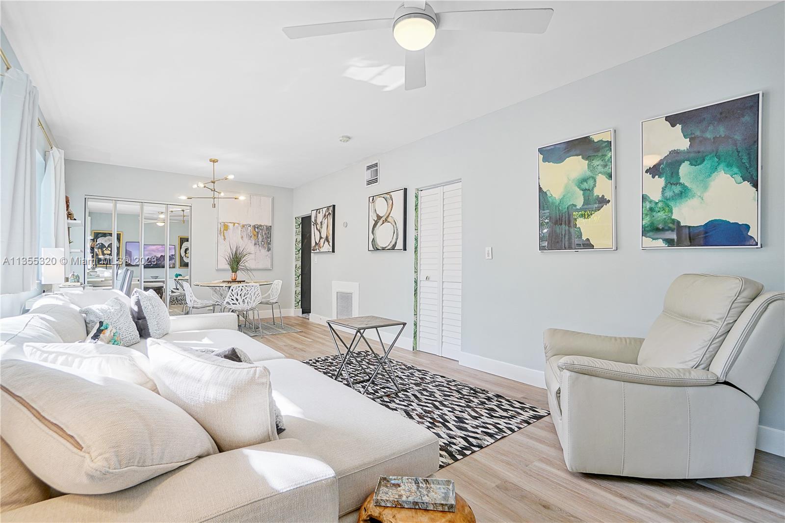 Cozy and spacious 1 bedroom 1 bath in historical Mansfield Park. Beautiful wood floors throughout the living and bedroom areas. The sun-filled unit just received a new kitchen with dark wood cabinetry and quartz countertops with stainless steel appliances. The unit has central AC. Impact doors and windows have been added. All furniture, paintings, fixtures, and kitchenware come with the sale of the property. This great unit is situated just a few blocks from the beach, Lincoln road, and has a beautiful courtyard filled with trees for relaxation. Ample street parking. The building is being painted with new interior walkway lighting & refinished railings.