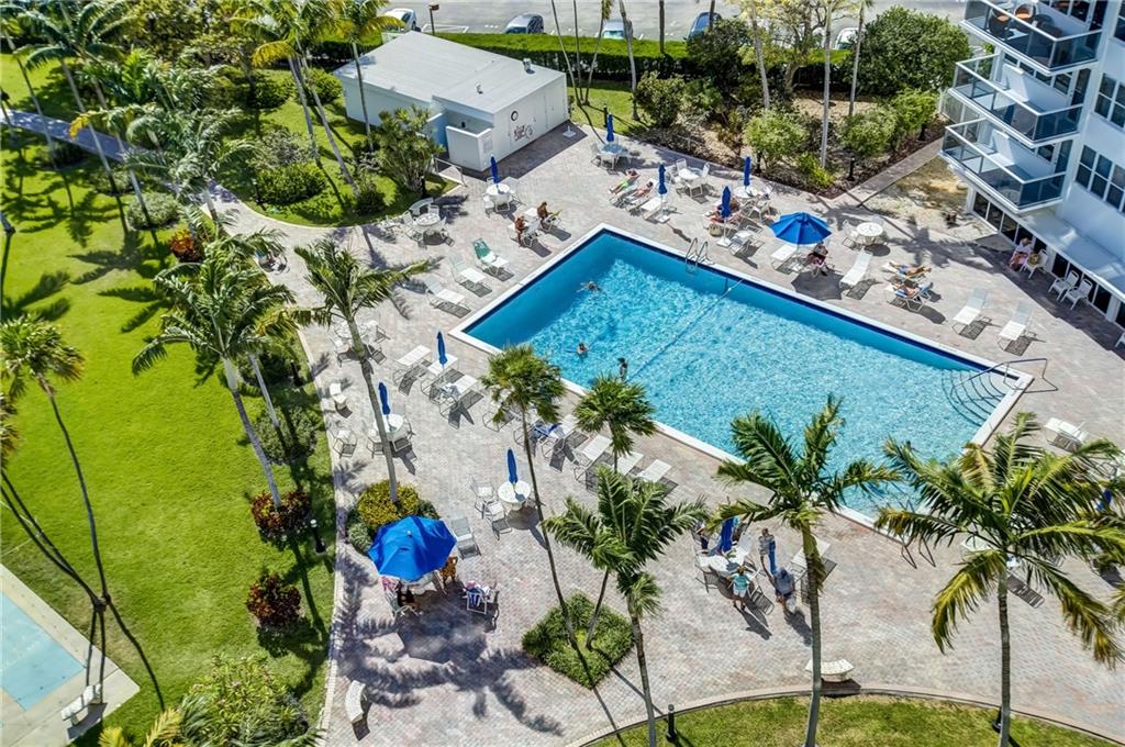 PARADISE BY THE SEA. 2 bed 2 bath CORNER UNIT with OCEAN and INTRACOASTAL views. Granite countertops in nicely updated kitchen. Fresh, modern bathrooms. Walk to the beach, dozens of restaurants, retail shopping, grocery stores - in the middle of everything on this 5 acre oasis. Community room in main building PLUS a CLUBHOUSE directly on the intracoastal. Move right in and start enjoying the good life today. High speed fiber optic internet and cable included in maintenance. Brand new roof in 2023 and fully funding reserves - building is in excellent financial condition. One buyer must be age 55 or over.