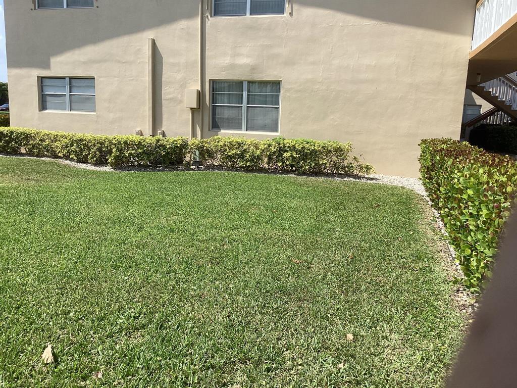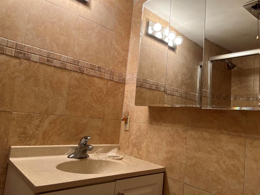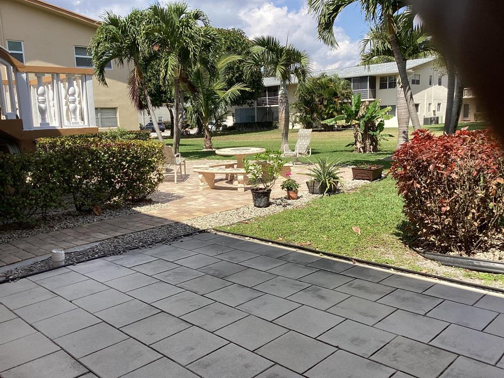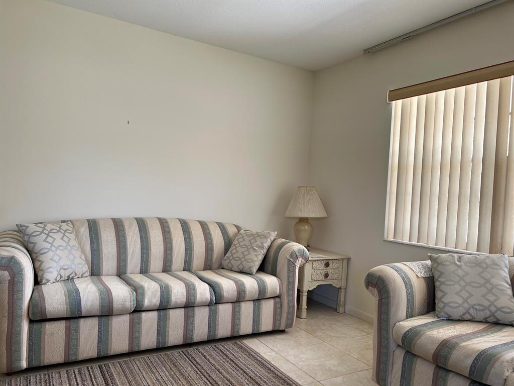 Sunny and bright first floor unit one bedroom, one and a half bath condominium, with sunroom, in Century Village. This is a corner unit with lots of windows, natural light and central air-conditioning. It has tiled flooring throughout, new toilets, and is partially furnished. Comes with one reserved parking space as well as guest parking. Make the kitchen your own. Kitchen cabinets were removed due to termites, treated and painted. Condo is rentable after two years. Walking distance to the Club House, Fitness Center and East Gate.