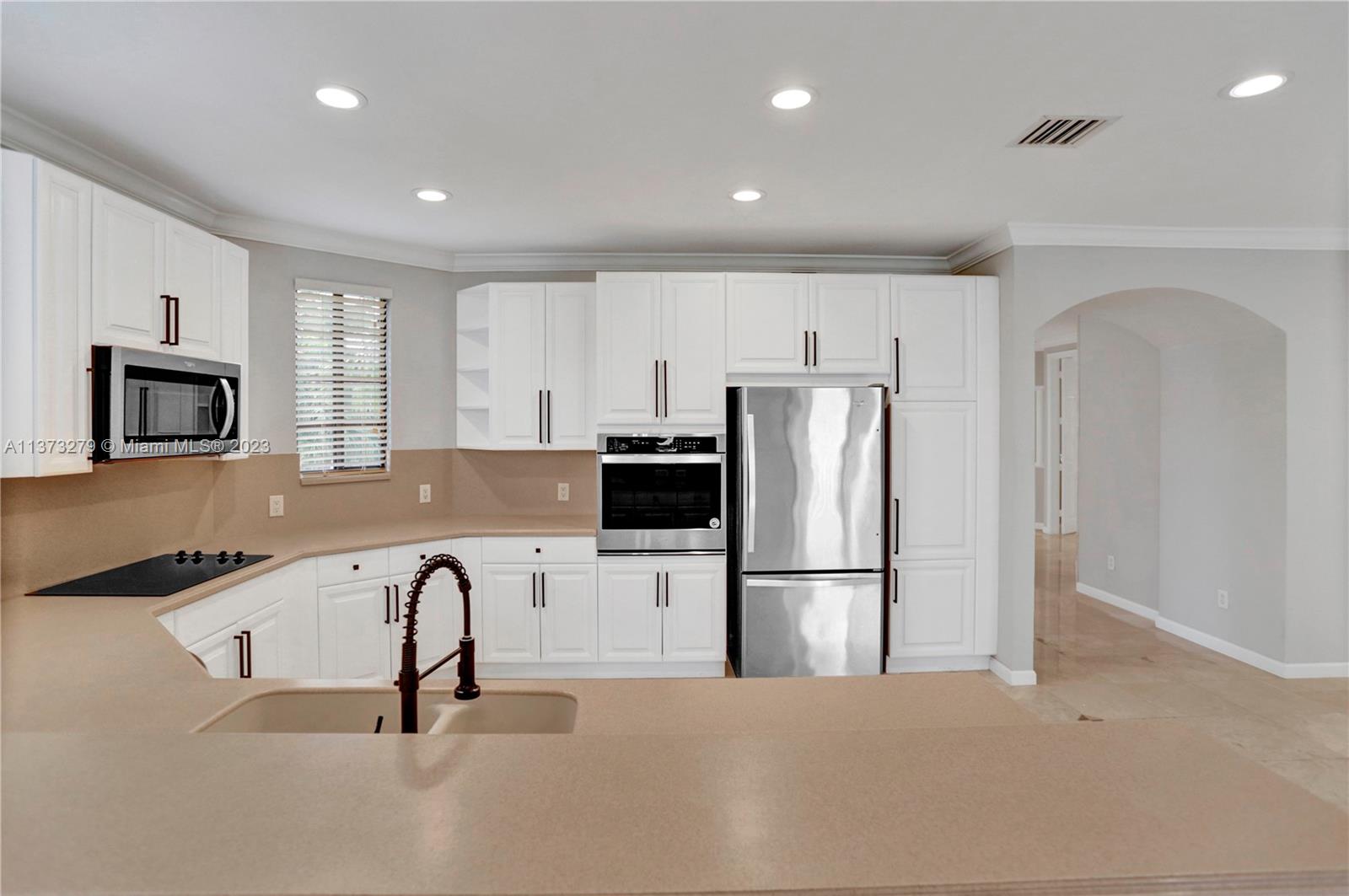 Luxury living in Weston! Rarely available coach home steps from Town Center. Updated split floor plan with large living and dining areas plus family room. Owner's suite with his and hers closets and spa-like bathroom. Largest floor plan with ample storage and two car garage. Fourth bedroom currently used as a study/office. Marble floors in living areas, laminate in bedrooms. Worry-free lifestyle in a secure community. Walkability to everything you need. Schedule an appointment today!