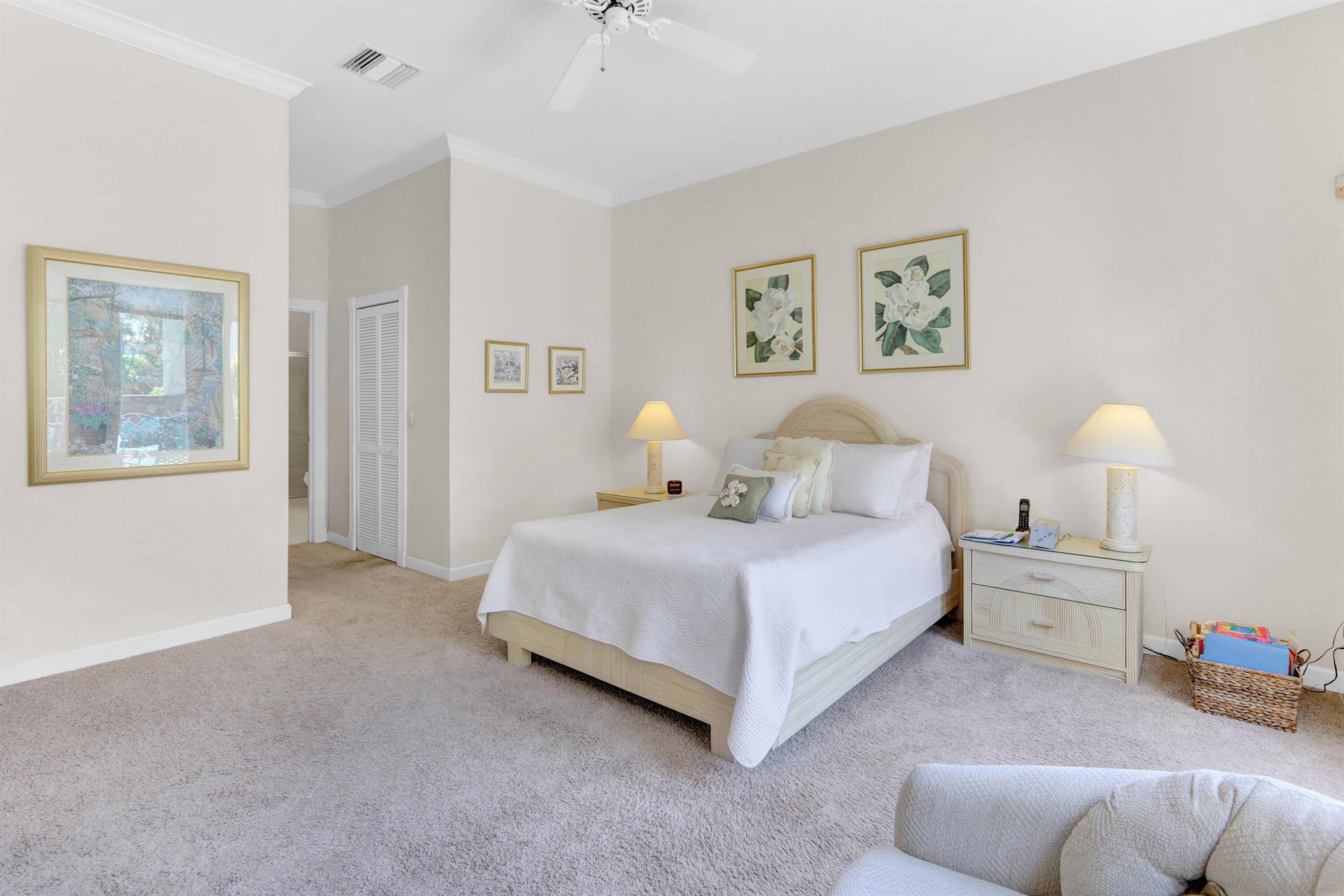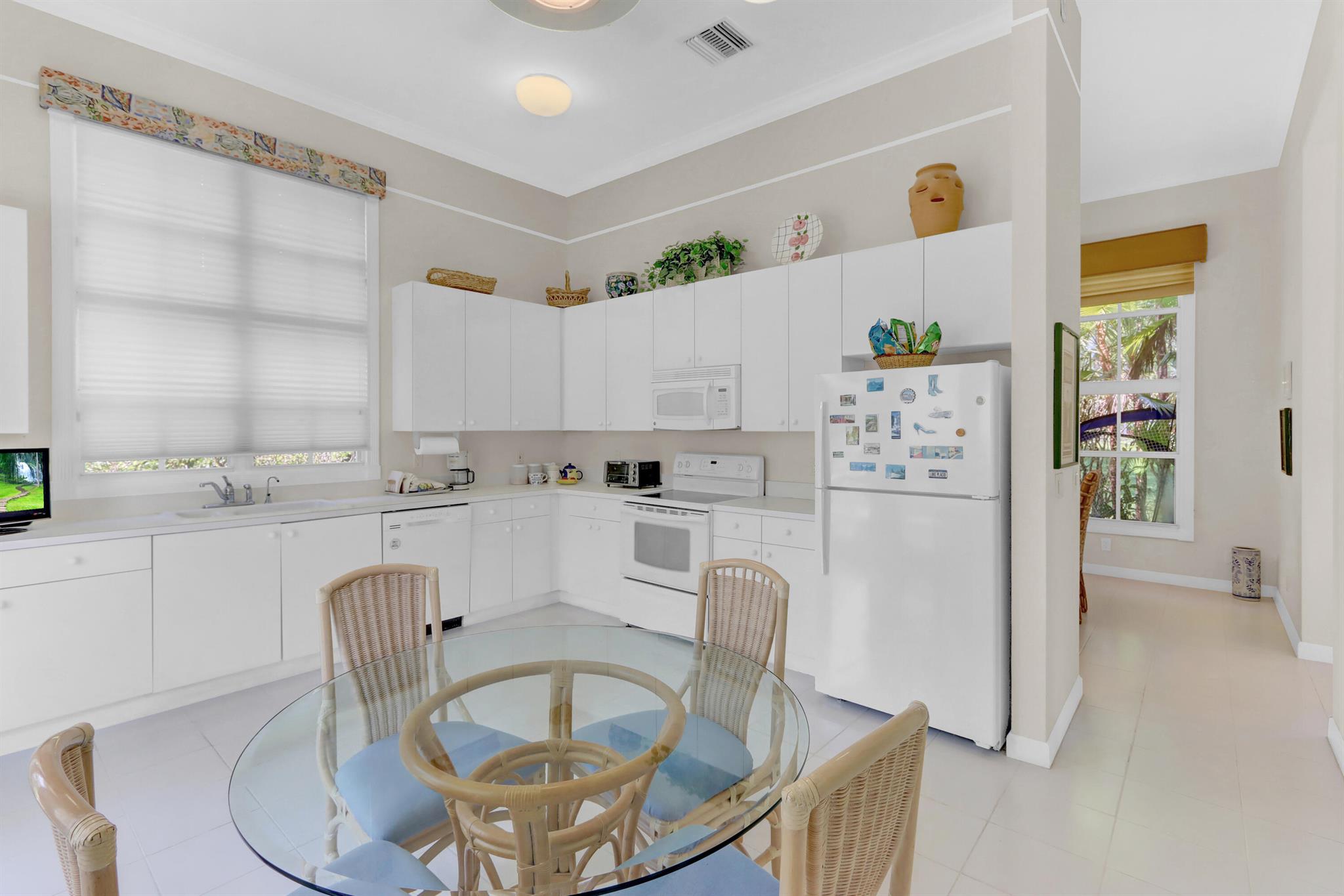 This charming, open & light villa surrounded by windows offering 3 bedrooms & 2 baths has been well maintained and features volume ceilings with crown moldings; white tile floors & neutral carpeting, a spacious kitchen with white 42'' high-gloss cabinetry; newer washer & dryer. French doors open into the patio which offers open & covered areas. Roof is about 10 years old.