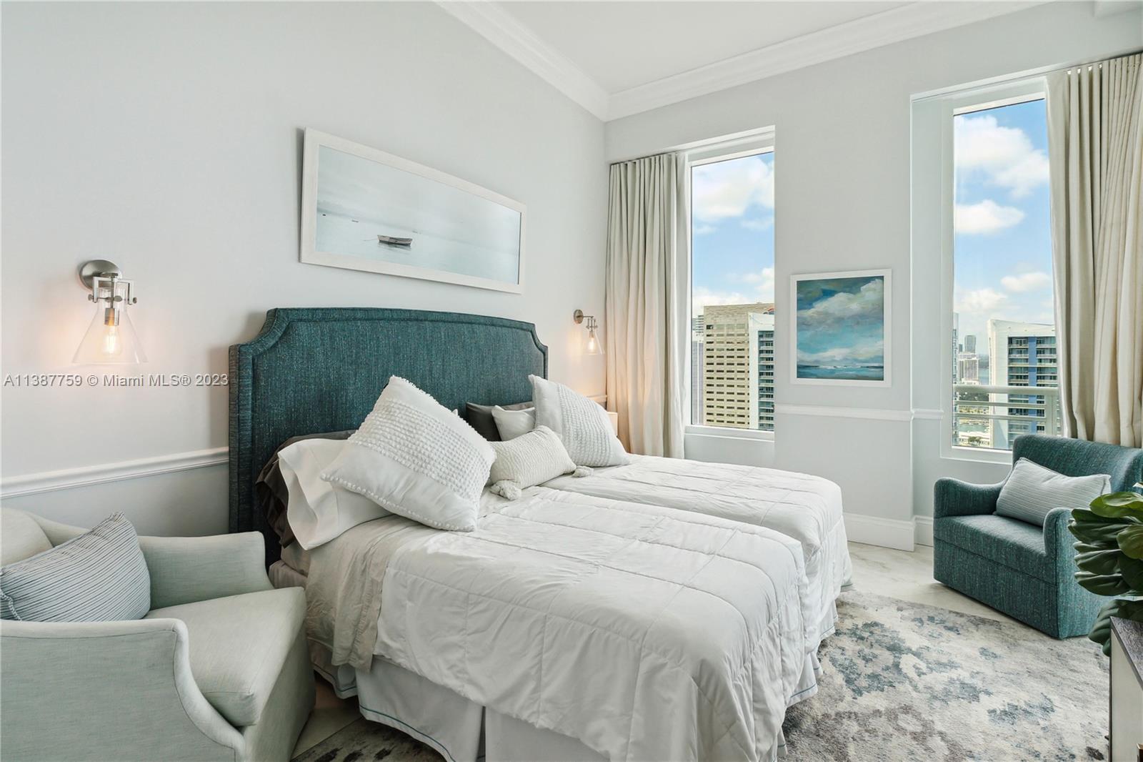 Your Dream HOME IN THE SKY (just below Penthouse) at Asia, Brickell Key's Premier Luxury Building, has over 1830 SQFT of (interior 1622 / exterior 208) living space. The home comes w/ 2 large bedrooms (both w/ walk-in closets & balcony access), a huge master bath w/ Double sinks / Jacuzzi / Marble shower, 12' HIGH CEILINGS, a Gourmet Kitchen w/ Sub-zero & Miele appliances, upgraded Lighting throughout, elegant crown molding, interior storage room, & an upgraded washer/dryer. The unit also has 2 Parking Spaces, a Private Fingerprint Elevator to the unit's Foyer & stunning views of the Bay/Miami River/Port/Ocean & Downtown. Live on an exclusive Island Oasis w/ a park, the 5 Star Mandarin Oriental, Restaurants, & be steps away from Miami's Brickell/Downtown Financial & Entertainment District.