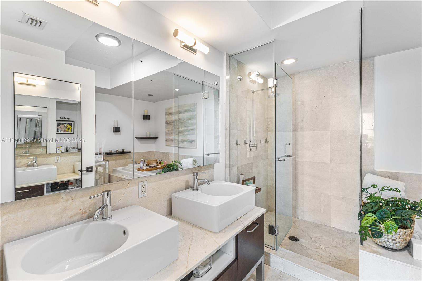 Elegantly updated 2 beds, 2.5 baths split floor plan, featuring ~1,300sqft with exclusive 11ft high ceilings and floor-to-ceiling windows throughout providing unobstructed water views! Tastefully redone half bath, new built-ins and flooring in the walk-in closet, high-end automatic shades, modern light fixtures with dimming capability, new cabinetry in the laundry room, and a new stove top in the kitchen. The bright and airy kitchen has double ovens, sub-zero fridge, and a cooking island. Unwind as you walk into your spacious master bedroom with direct access to the balcony. Located in the upscale Emerald building with a rooftop pool and jacuzzi, 24 hour front desk and security, valet, a fully equipped gym, and much more. In the heart of Brickell!