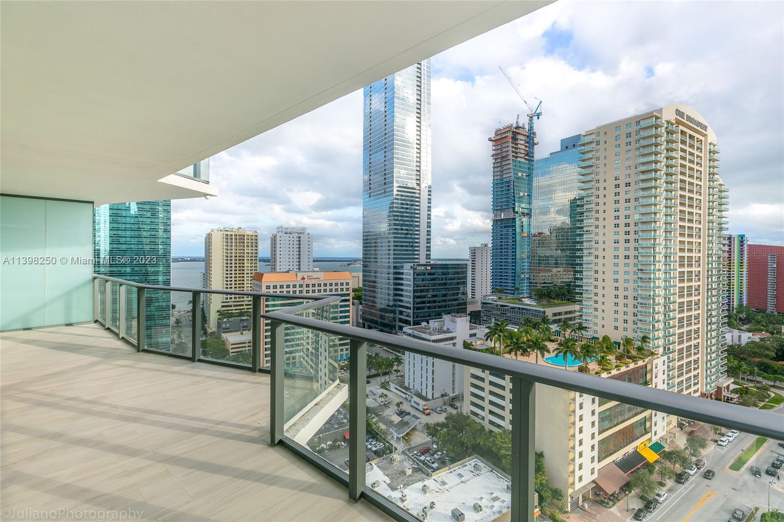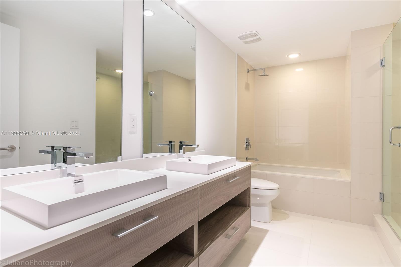 This stunning and spacious apartment boasts three bedrooms and two full and one-half bathrooms, combining elegance and coziness. Its floor-to-ceiling windows allow an abundance of natural light to fill the space, offering breathtaking views of the cityscape and bay. The primary suite is a tranquil haven, featuring an ensuite bathroom with a luxurious soaking tub, a separate shower, and a dual vanity sink. The second bedroom is generously sized, and its bathroom includes a convenient shower/tub combo. The kitchen is sleek and contemporary, complete with high-end appliances, custom cabinets, and a sizable island. Located in the vibrant Brickell neighborhood, this apartment serves as a serene retreat while immersing residents in the lively and dynamic community that surrounds them.