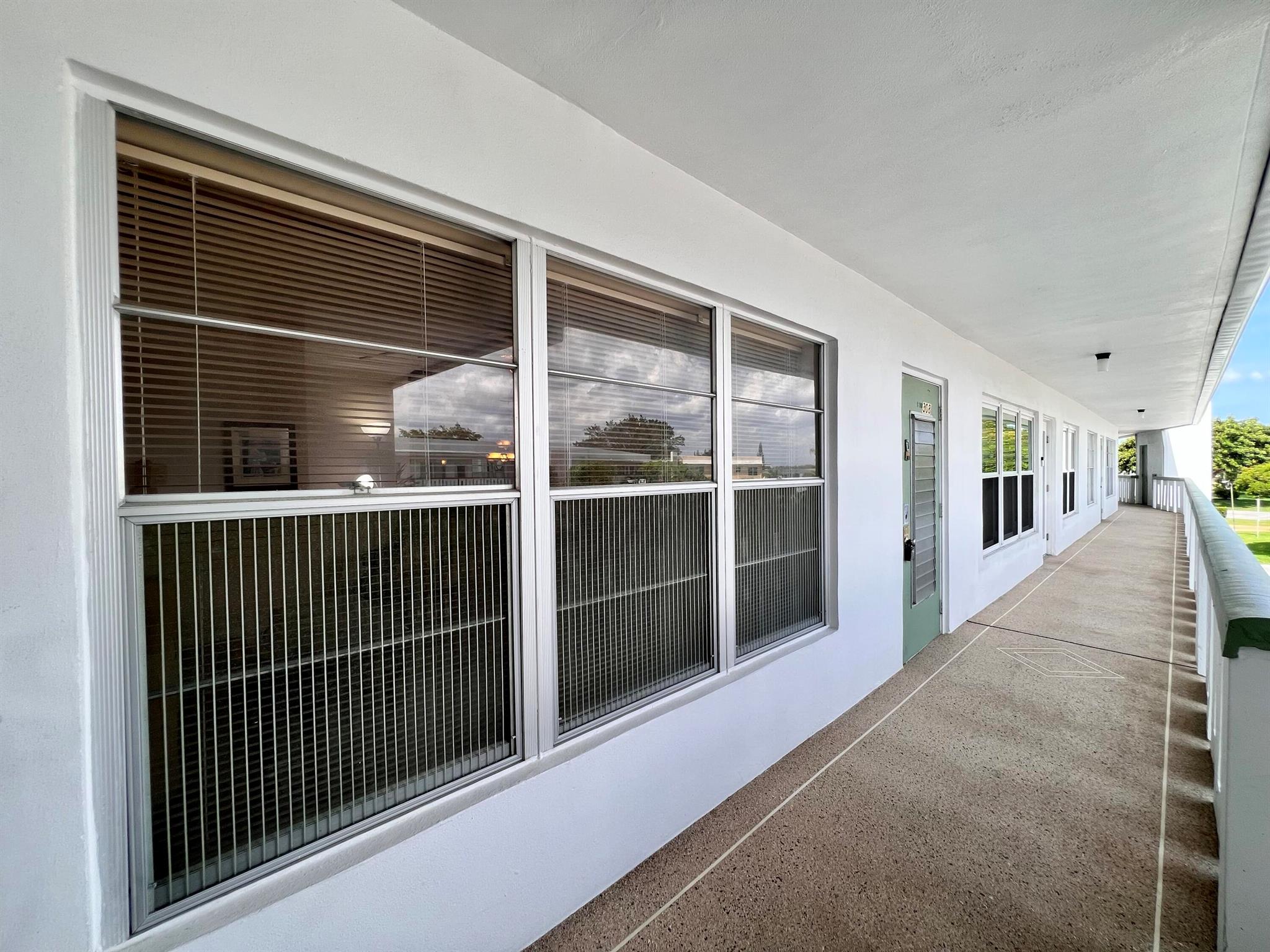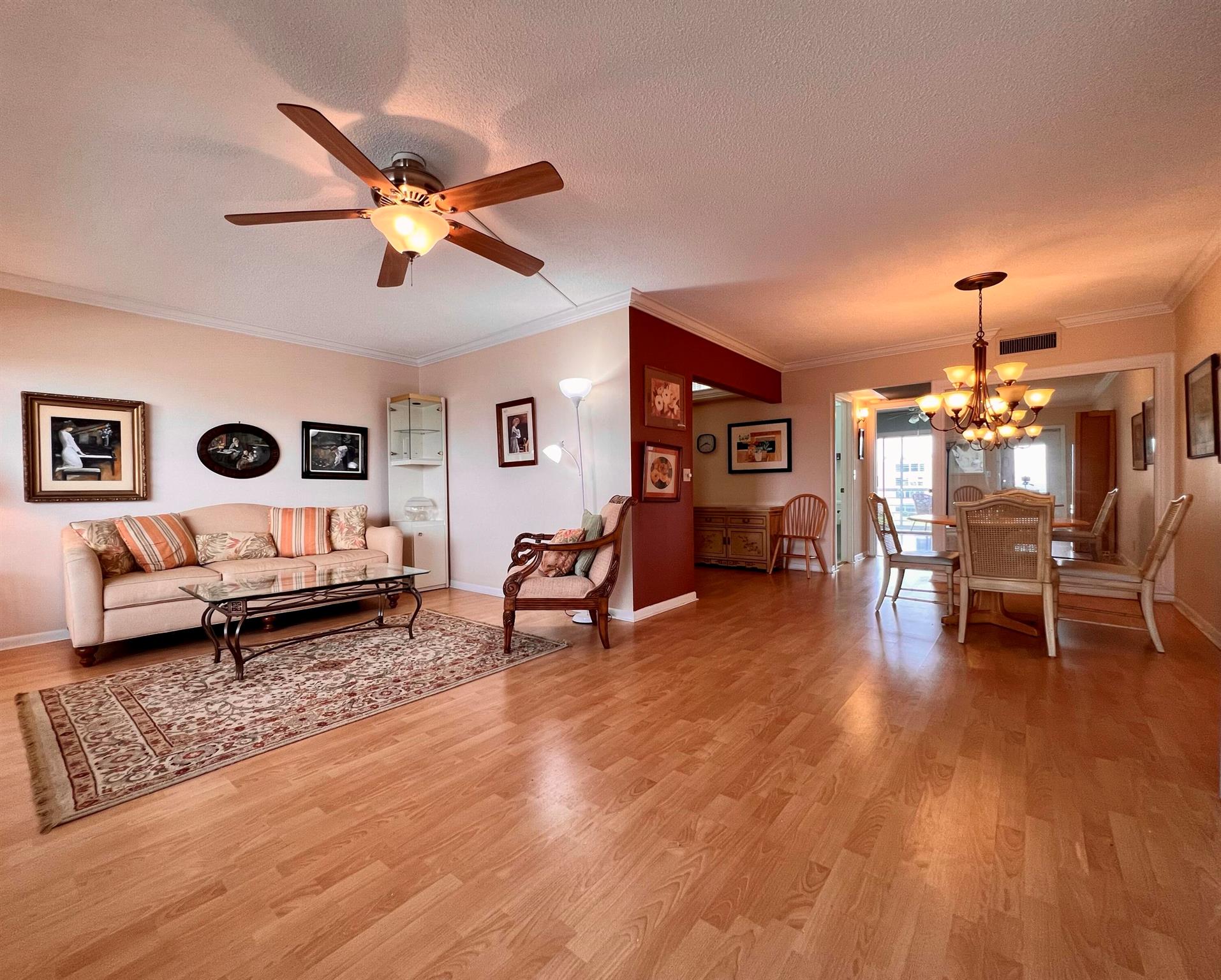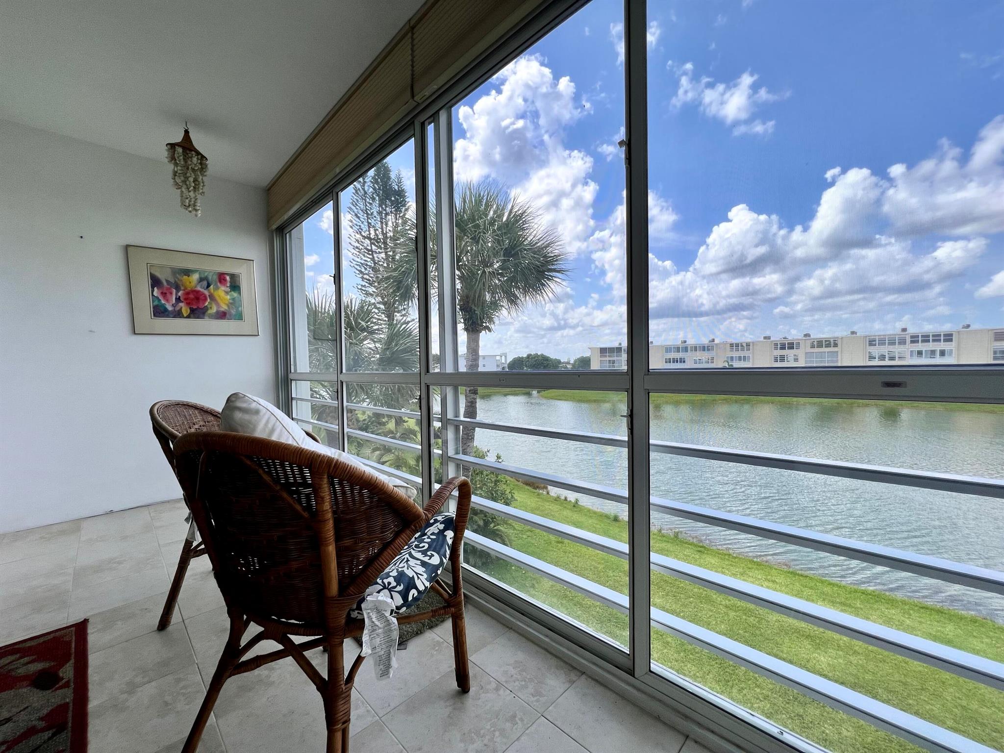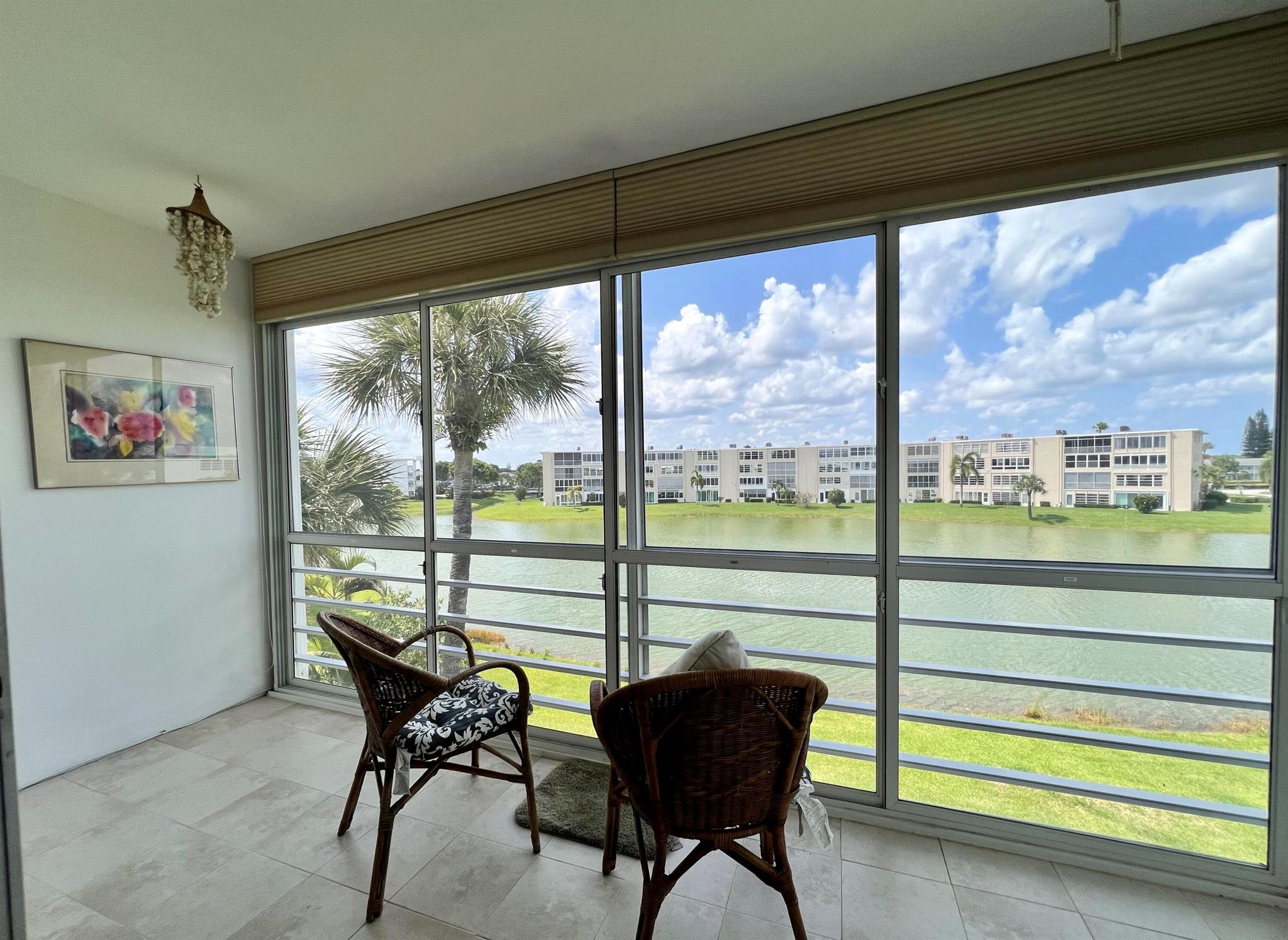 Delightful With Pretty Water Views & Updates In The Desirable Wellington Section of 55+ Century Village! Spacious 1/1.5 with updated kitchen featuring natural cabinetry, granite counters, and updated appliances (brand new never used range). Updated wood look laminate flooring throughout. Pretty crown moulding in living area. Updated half bath. Large bedroom suite with water views, full ensuite bath, two closets (one is a huge walk-in), and access to the lanai. The lanai offers extra space and pretty views! Wonderful location and well-maintained building. Sold AS IS and furnished as shown (excluding personal items). Century Village is a 55+ community with so much to offer